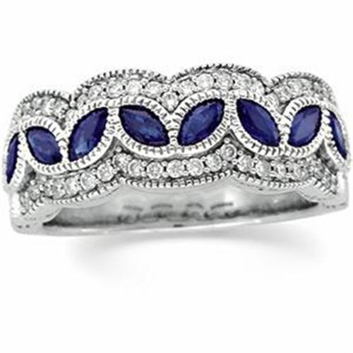 This Estate Wedding Band is a size 6 and it IS in Pristine condition. It is a 14k White Gold Anniversary Band set with sparkling round Diamonds. The Diamond Total Weight = .33 Carats! There are marquise cut Genuine Blue Sapphires set as accent to the Diamonds. The band is 8mm wide across the top and it is 4.75mm wide at the base.