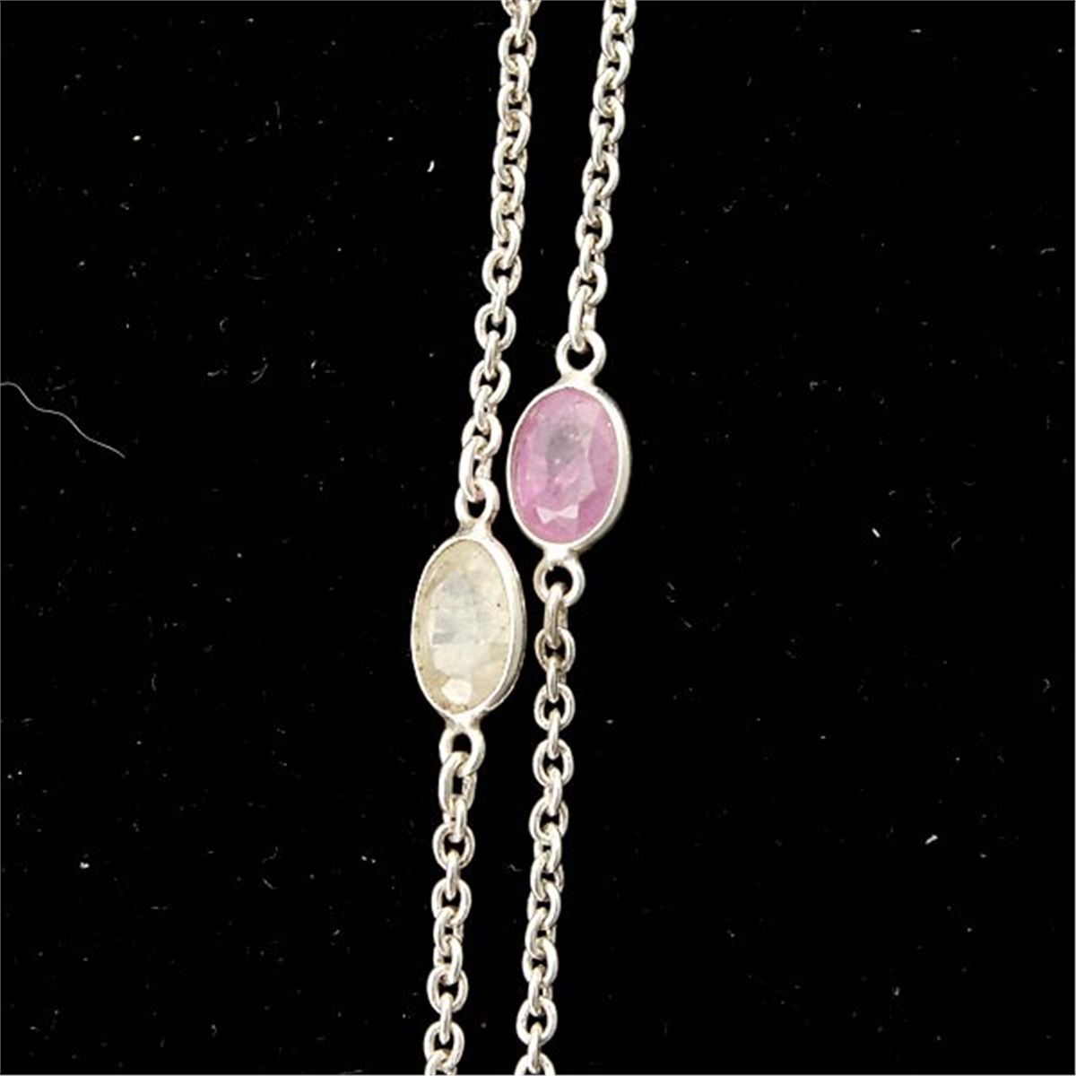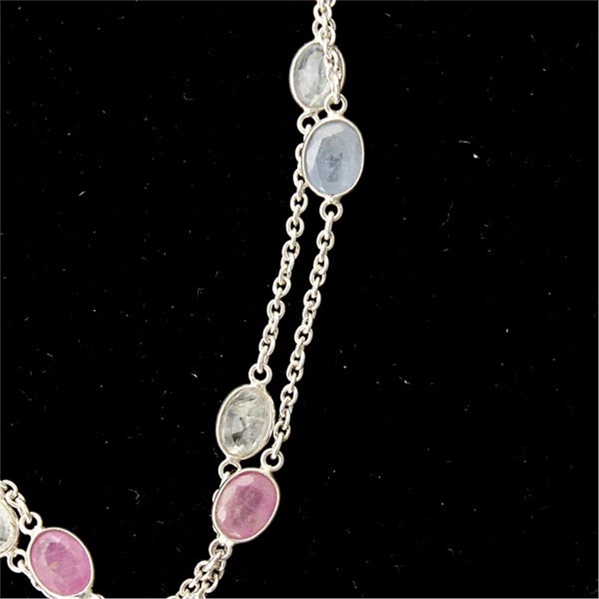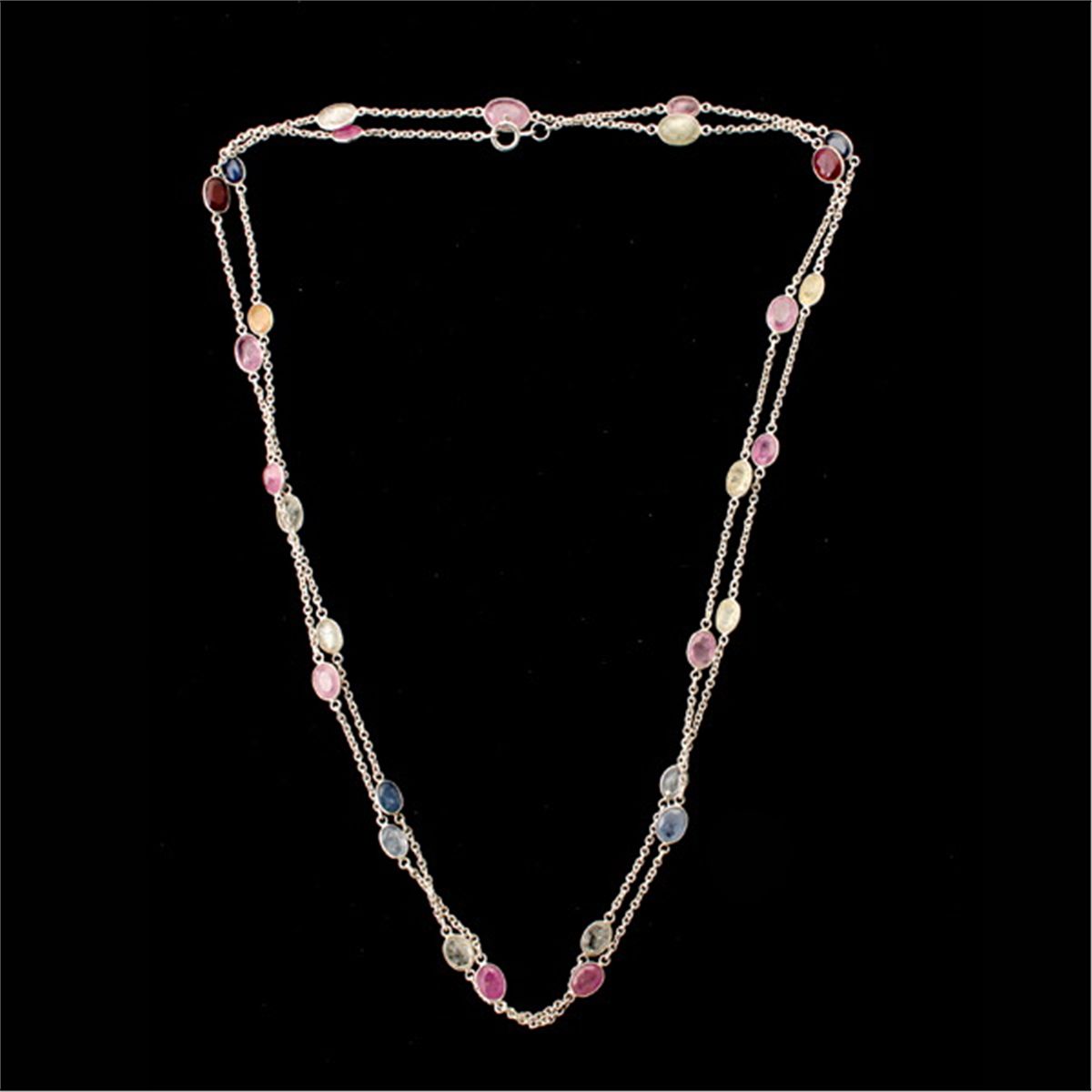 SAPPHIRE, STERLING SILVER NECKLACE. Composed of numerous rose-cut, multi-colored sapphires each bezel set in sterling silver , interspaced by a sterling silver link forming a 40 inch necklace. 2.9 dwts