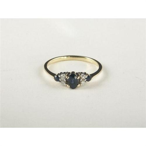 RING: Delicate 14k yellow gold lady's ring set with dark blue sapphires and accented with round cut diamonds. The oval and round cut sapphires measure approximately 0.46 ctw and are transparent to semi-tranparent. The diamonds measure approximately 0.10 ctw, have SI1 to I1 clarity and G to H color. Appraisal included.