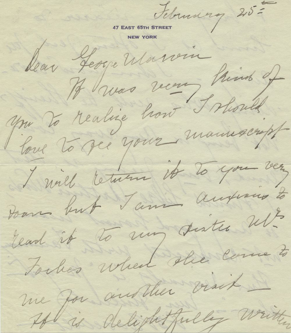 (1854 - 1941) Mother of Franklin D. Roosevelt, 32nd President of the United States. Good content A.L.S., 2pp. 8vo., New York [n.d.], to George Marvin. In part: "…I should love to see your manuscript…I am anxious to read it to my sister Mrs. Forbes…I am wondering who will be Sheriff?…I should like Arthur Woods, or any good honest man not connected with Tammany. This remark is 'for you alone'…". Fine.