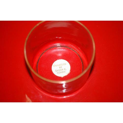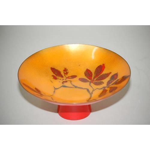 SARAH E. COHEN ENAMEL ON COPPER COMPOTE - 20TH CENT.<BR>SARAH E. COHEN ENAMEL ON COPPER COMPOTE W/ ORIENTAL<BR>BRANCH & RED LEAVES-SARAH E. COHEN LABEL ON BOTTOM<BR>(3" T X 7 1/8" W) - WEAR, IMPERFECTIONS