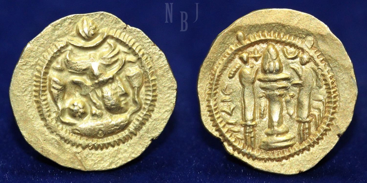 SASANIAN KINGDOM: Piruz I, 459-484 AD, AV Gold. Balkh minted. 3 dated. Busted crown with two wings (struck during the last portion of his reign). fire altar & two attendants, their crowns extending outside the border. (3.71gm, 21mm) Good Very Fine.