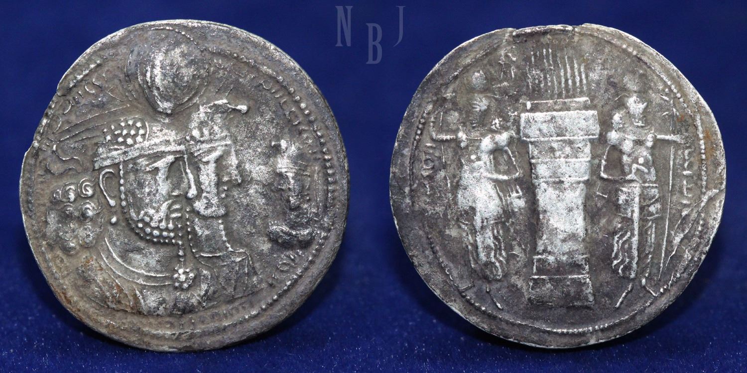 SASANIAN KINGDOM: Varahran (Vahram) II, 276-293, AR drachm. king's bust, wearing winged crown with korymbos, the queen wearing kolah with boar's head, and the son facing, wearing kolah with eagle's head. fire altar with 2 attendants facing away, fravahr left of flames, Toned. (4gm, 28mm) Fine.