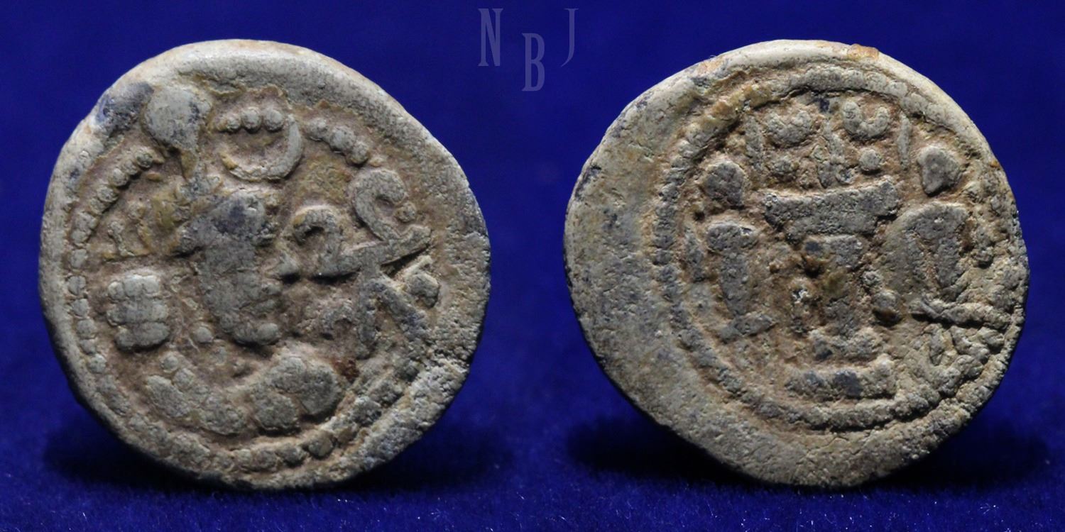 SASANIAN KINGDOM: Yazdigerd I, 399-420 AD, Lead Unit. standard Sasanian bust right, fire flake to right. fire-altar with attendants, 3 crescents above Fire. (2.85gm, 17mm) Very Fine and Very Rare.