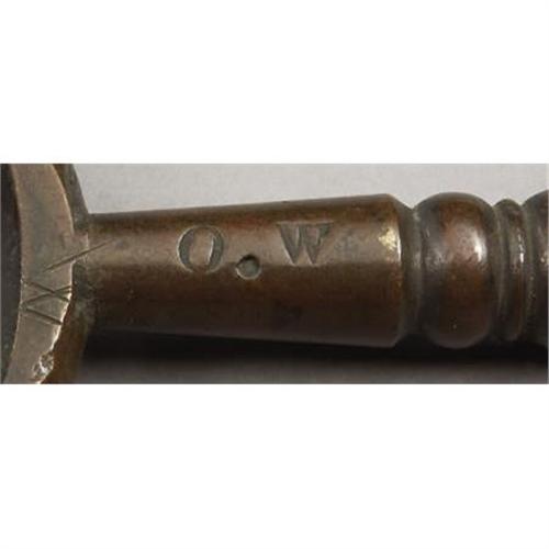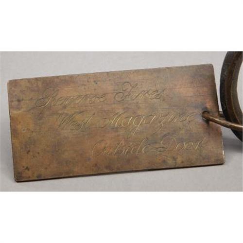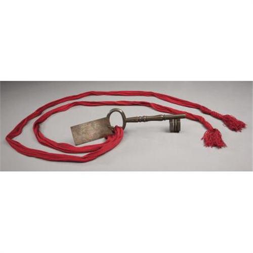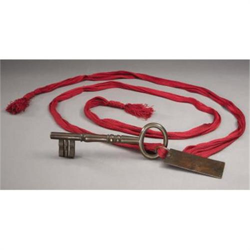 <B>A RED SASH AND KEY TO THE POWDER MAGAZINE - THOMAS CHEW, PURSER ON USS </B></I><B><I>CONSTITUTION</B></I></B></I><B>.</B></I><BR> Thomas J. Chew was the purser on board the U.S.S.<I> Constitution</B></I> during the War of 1812. A 30-year career Naval officer, Chew kept many mementos of his service aboard "Old Ironsides." One such artifact was this key to the west powder magazine of the ship. The massive 8" heavy brass key has the letters 'O. W.' stamped into it and has a brass plate with the inscription 'Reverse Fires West Magazine Outside Door'. Also included with the key is Chew's 40" red silk sash.<BR><BR>Thomas John Chew was born January 28, 1777 and entered the United States Navy in 1799 and was commissioned a Purser on April 25, 1812. His brush with fame came as he personally witnessed Captain James Lawrence utter the words which became a Navy motto, <I>Don't give up the ship,</B></I> Lawrence ordered as he died of his wounds in battle. Chew also served on the United States ships <I>Chesapeake</B></I> and <I>Washington</B></I> before his death in 1846.<BR><B><BR>Condition:</B></I> The key is in good condition with a dark patina throughout.<BR><B><BR>Provenance:</B></I> <I>The Tharpe Collection of American Military History</B></I><BR><B><BR>Exhibited: </B></I><I>The Liberty Heritage Society Museum</B></I><BR><BR><b>Shipping:</b> Miscellaneous Collectibles, Larg (<a target="_blank" href="http://www.heritageauctions.com/common/shipping.php">view shipping information</a>)