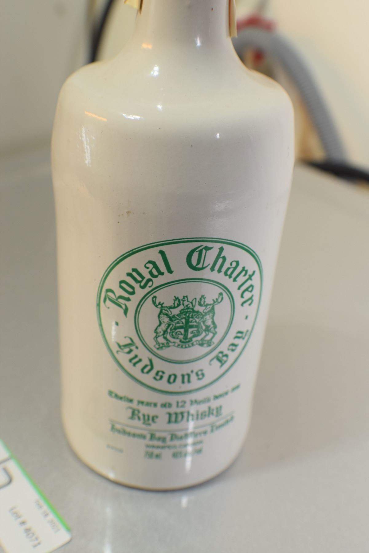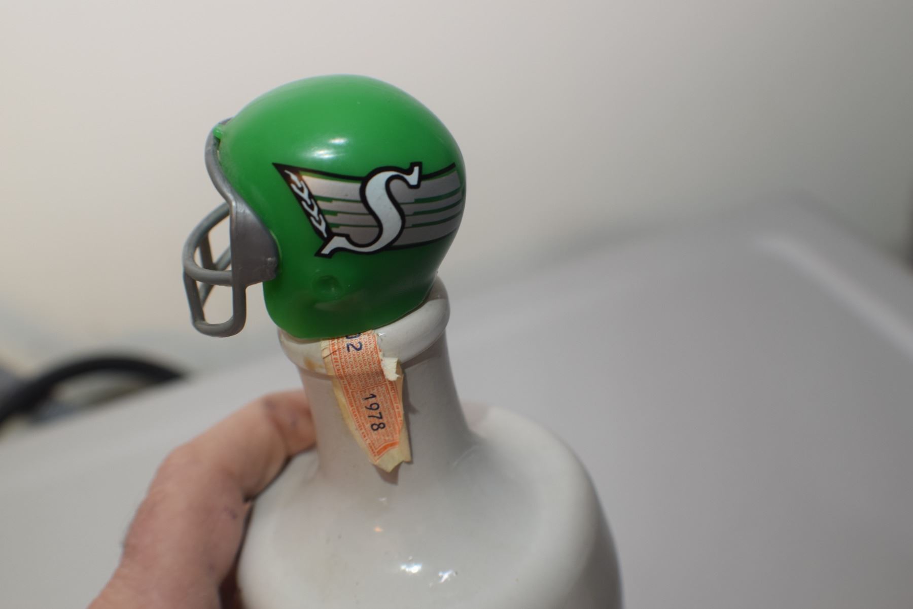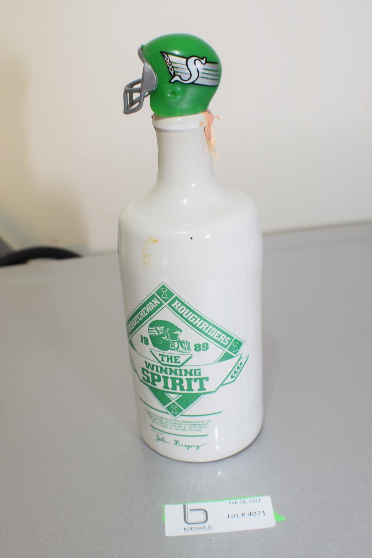SASKATCHEWAN ROUGHTRIDERS / HUDSON BAY CO POTTERY WHISKEY BOTTLE