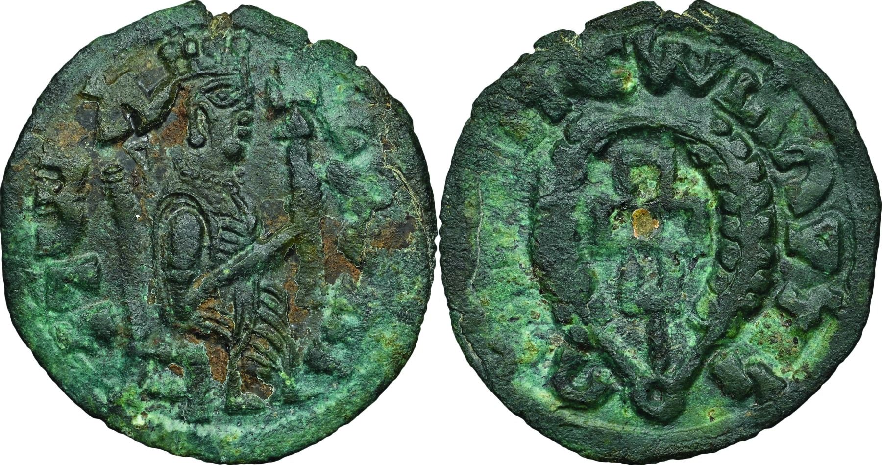Avers : Armah, portant une couronne crénelée, des robes et tenant un long sceptre croisé, assis droit sur un trône à dossier élevé.