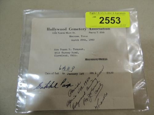 SATCHEL PAIGE SIGNATURE AUOTGRAPH ON DOCUMENT. NO COA. AS SHOWN. VIEW PICTURE FOR DETAIL. PLEASE BE ADVISED, AND INFORMED REGARDING SIGNATURES OR AUTOGRAPHS THAT WE SELL AT AUCTION: WE ARE NOT AUTHENTICATORS, AND WE DO NOT AUTHENTICATE, OR VALIDATE ANY AUTOGRAPHS OR SIGNATURES THAT WE OFFER AT AUCTION. SOME AUTOGRAPHS OR SIGNATURES MAY COME WITH AN AUTHENTICATION FROM ANY ONE OF LITERALLY HUNDREDS OF AUTHENTICATORS ACROSS THE COUNTRY, AND AROUND THE WORLD. WE DO NOT ENDORSE ANY AUTHENTICATOR, NOR DO WE GUARANTEE THAT ANY AUTOGRAPH OR SIGNATURE IS AUTHENTIC, OR THAT IT WILL PASS AUTHENTICATION BY ANY AUTHENTICATOR. ALL AUTOGRAPHS OR SIGNATURES ARE SOLD