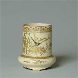 Lot 0571A. SATSUMA BRUSH JAR. Rare Satsuma pottery brush jar is enameled with gold and green bamboo stalks with a beautiful green and gold bird. A branch extends forward holding red and white flowers. Signed on the side in gold and red Oriental letters. SIZE: The footed jar is 4-1/4” t. CONDITION: Very good to excellent. 5-69143 (400-600)