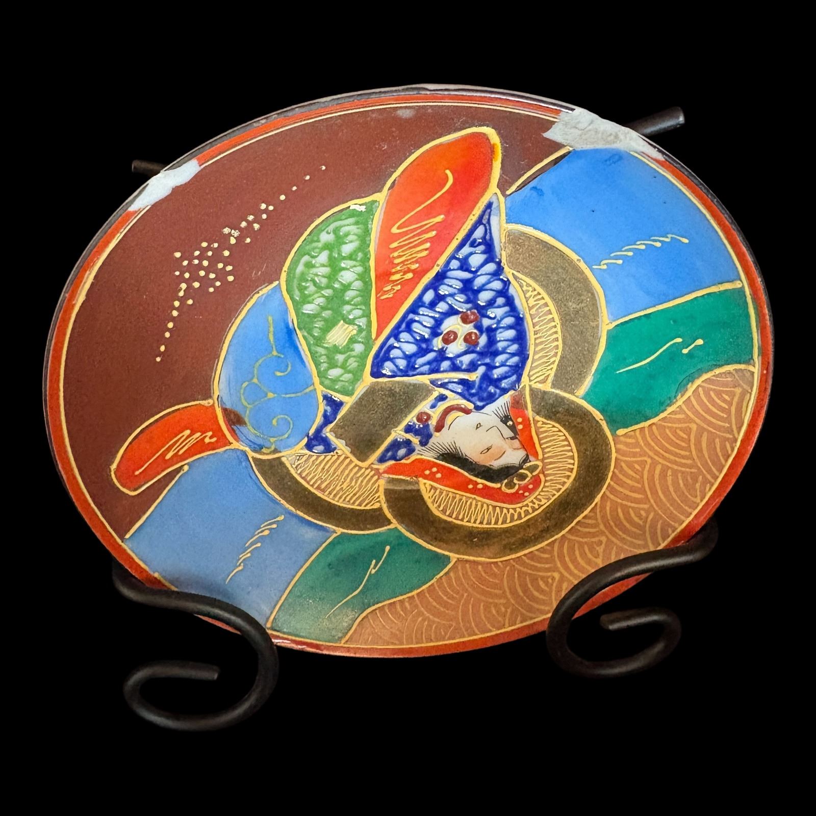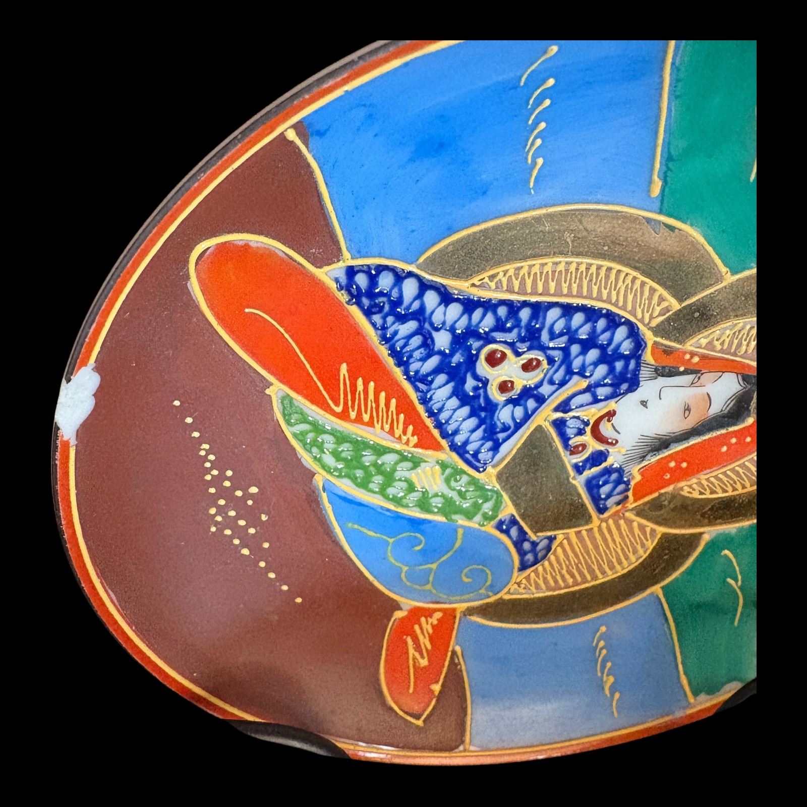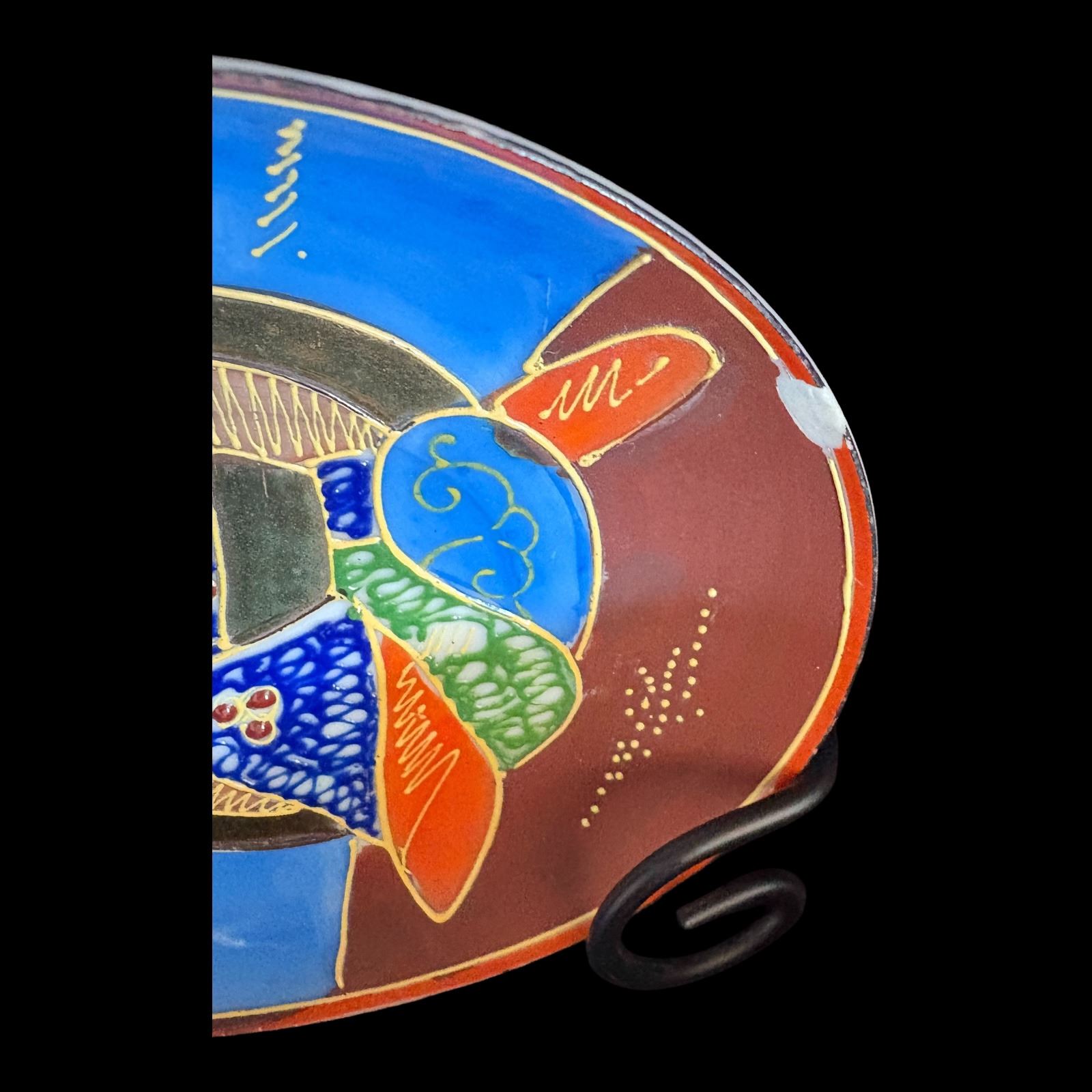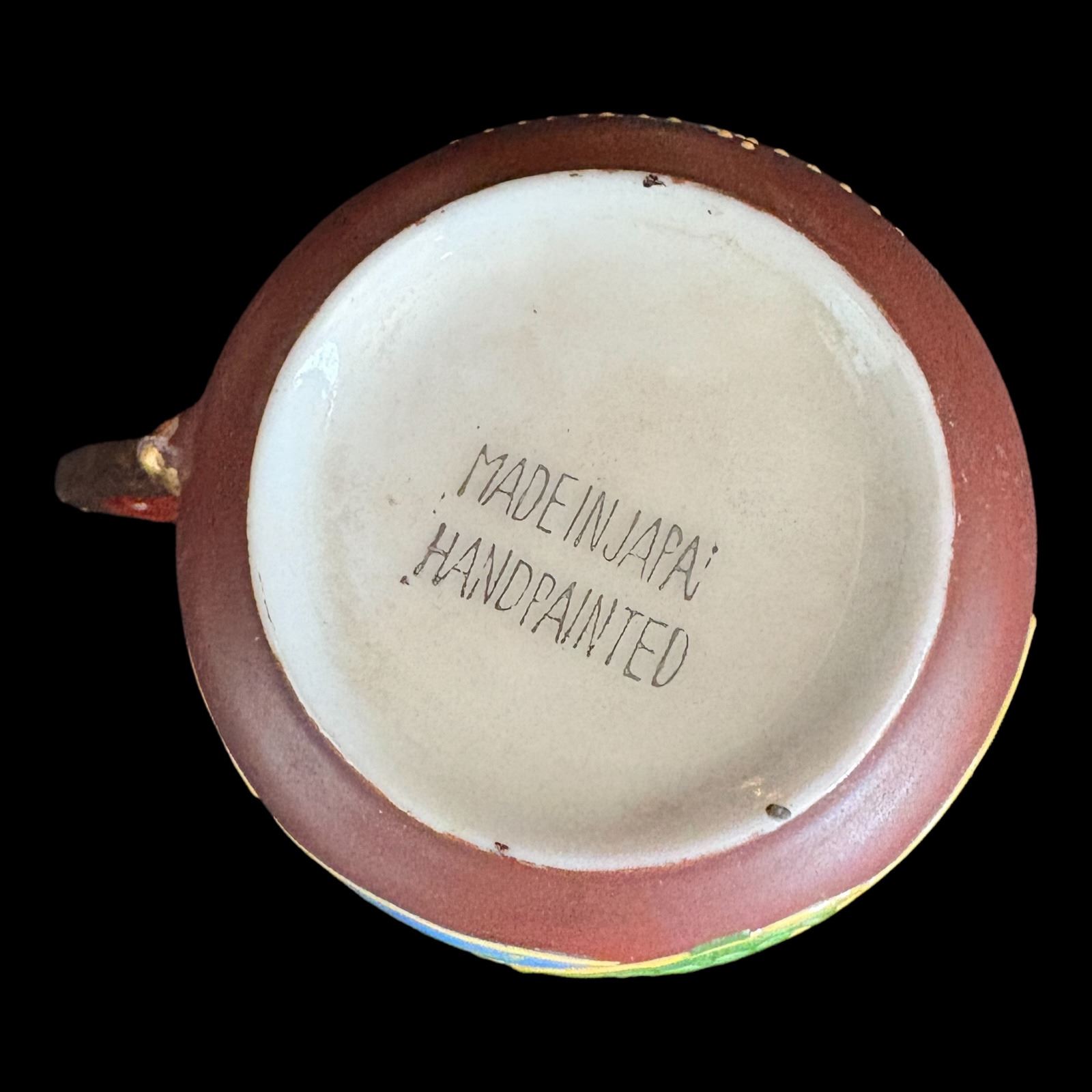 Hand painted, missing 1 cup, 3 plates have chips - teapot 7 in., plates 4.25 in. diameter