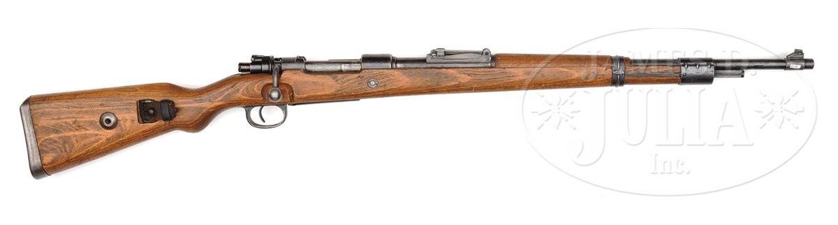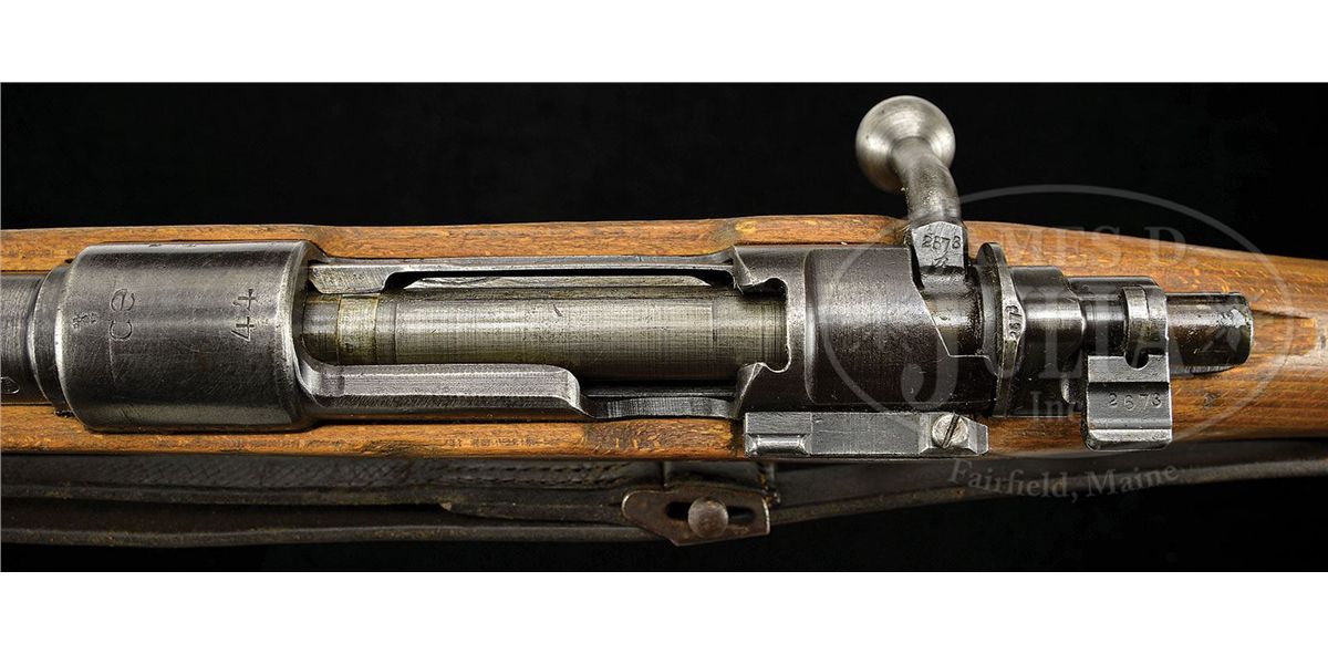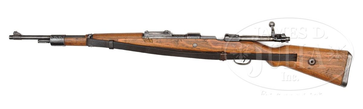 SN 2673. Cal. 8mm. K98k manufactured by J.P. Sauer, late WWII, nearly all matching to include bolt, and has unmarked replacement trigger guard. Top receiver marked WaA 37 "ce 44" and left bbl and receiver marked with Nazi era firing proofs, British proofs and old German Fraktur "Mod. 98". White glue laminate stock is marked Eagle/H, no SN. Comes with authentic wartime leather sling. PROVENANCE: Collection of Dr. Geoffrey Sturgess. CONDITION: Good. Bore is dark with strong lands. Stock shows shrapnel damage to left side by rear sight with scattered dings and handling marks. 4-53179 DW20