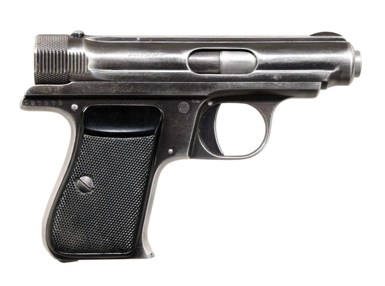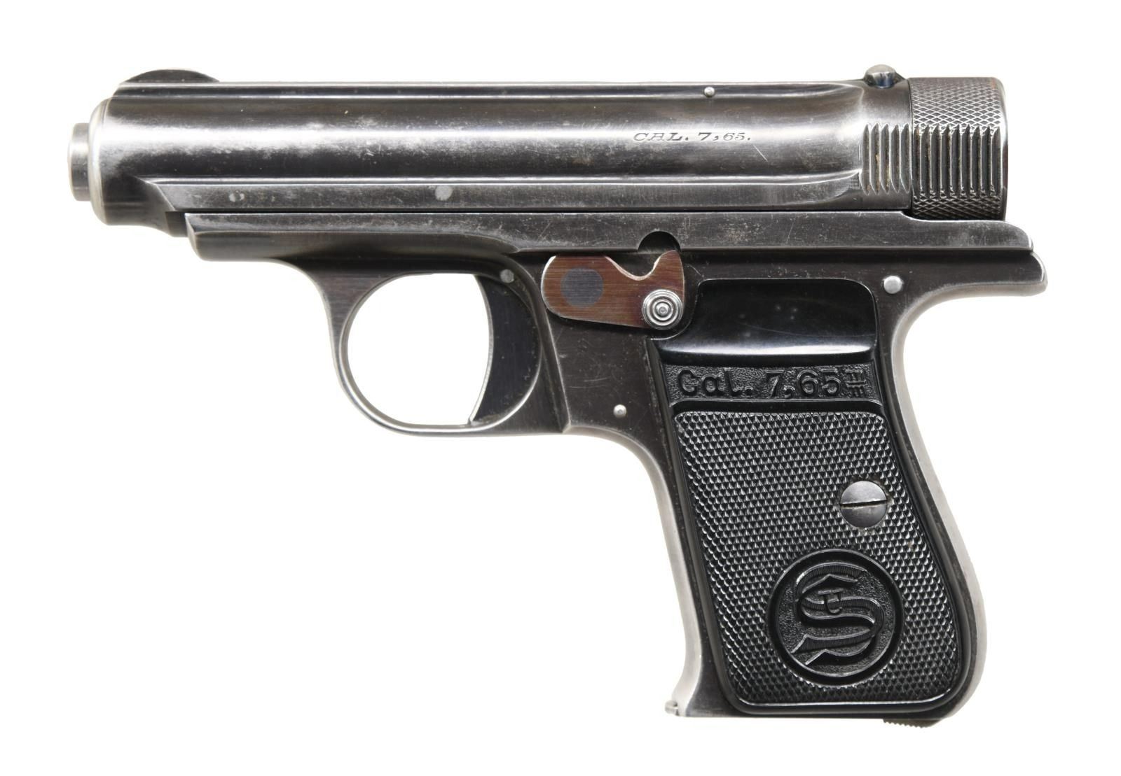 Cal. 7.65mm (32 ACP). S# 187575. Bbl. 3". Round blade front sight. Low profile fixed rear sight. Blue finish. Right side of frame & rear of cocking piece have crown "N" proofs. Checkered black grips w/ intertwined Sauer logo on left panel. MAGS: 1-8 rd. CONDITION: grips show a couple light chips around screw holes, scattered dings & handling wear. Metal retains 65% original blue w/ scattered fading most notably on the straps & edge wear. Very good bore w/ strong rifling. PROVENANCE: The Collection of Curtis H Halvorson. (23-5835/MJC). CURIO. $300-500.