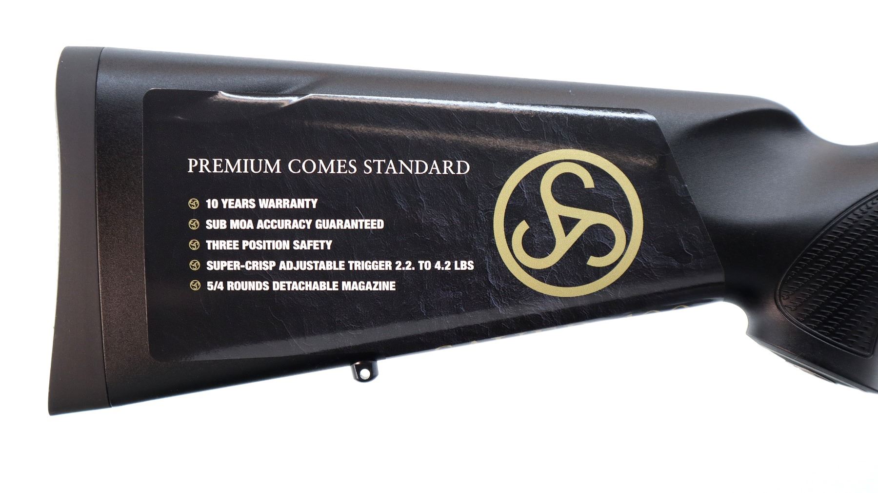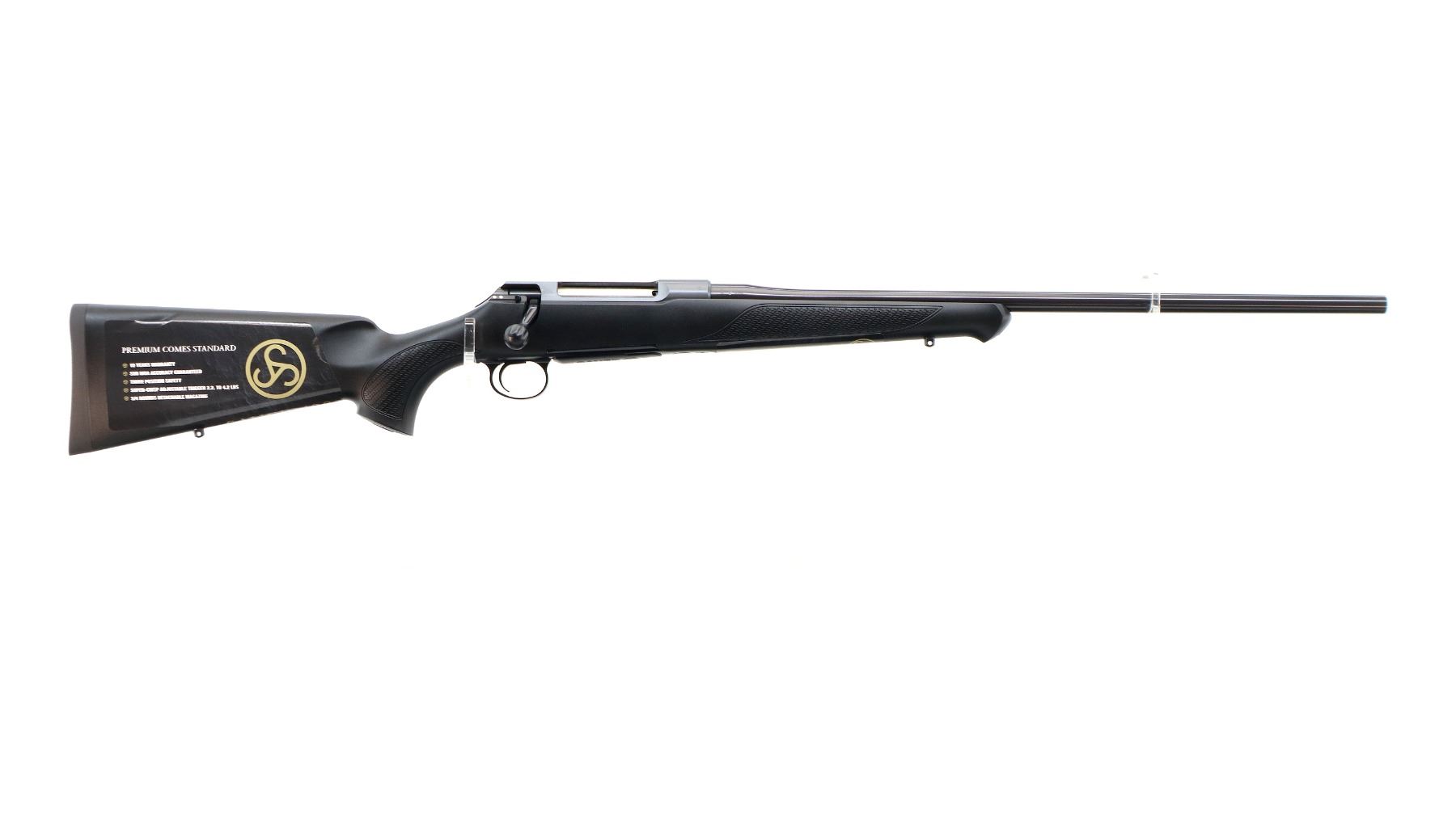 Main Description: No sights, blued tapered round barrel, Satin finish receiver drilled and tapped with no plug screws installed, grooved black polymer bolt knob. One piece black synthetic Ergo Max synthetic stock, checkered forearm and pistol grip panels with ambi palm swells, black rubber recoil pad, grip cap, swivel studs, retains factory stickers.
