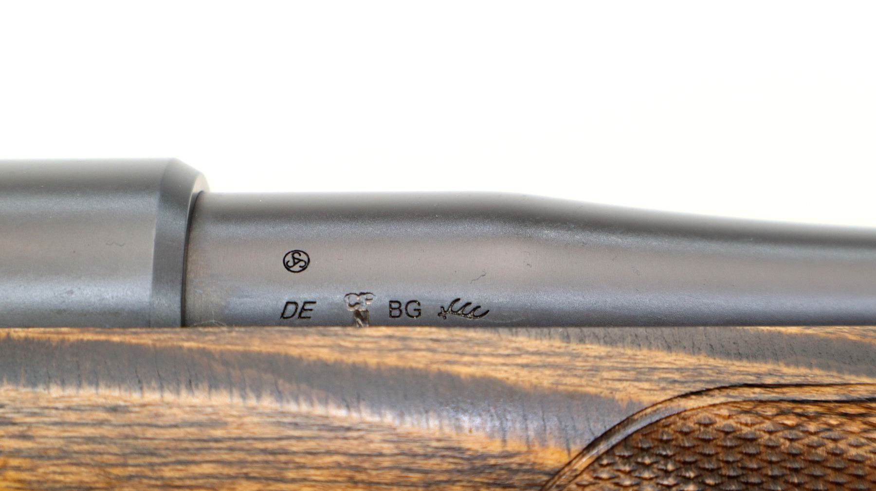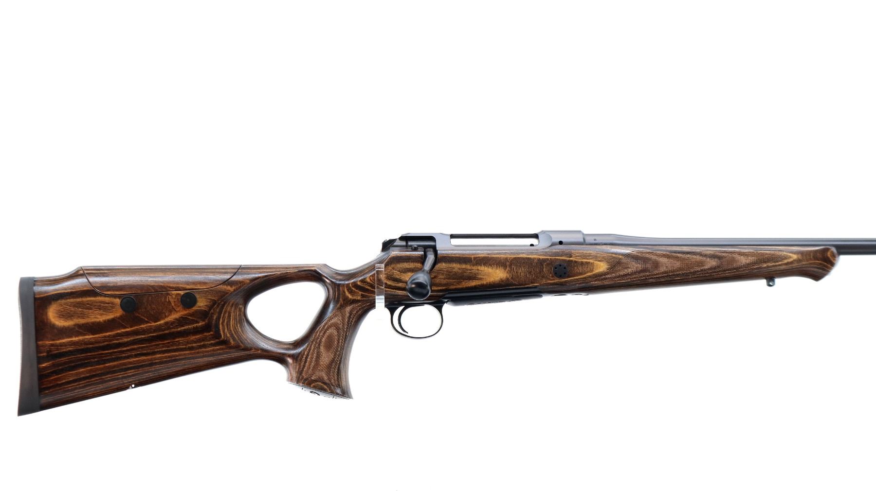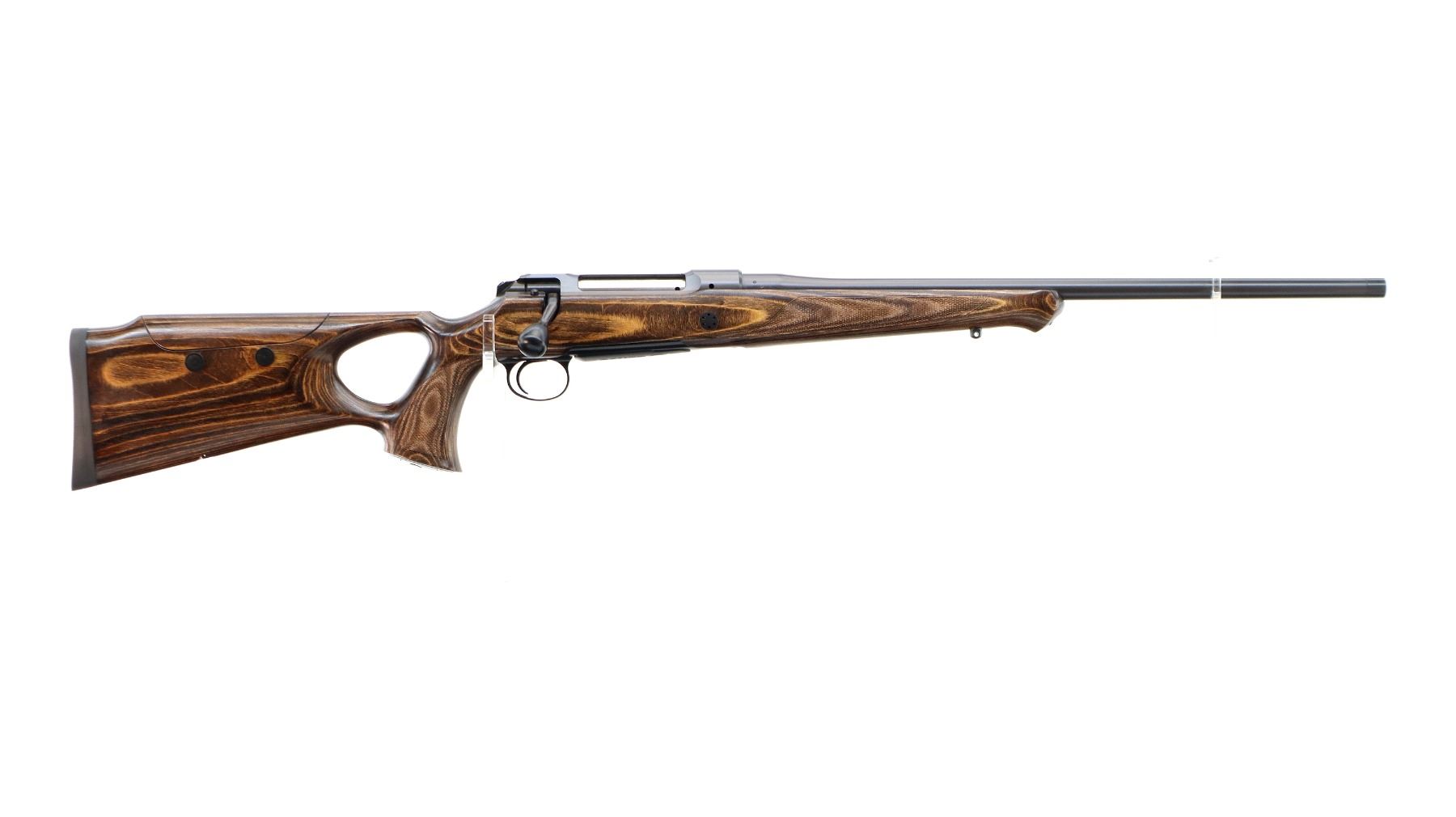 Main Description: No sights, Satin blued finish, tapered round barrel threaded at muzzle with cap, receiver drilled and tapped with plug screws installed, smooth black polymer bolt knob. One piece brown laminate wood stock, Schnabel forend tip, checkered forearm and thumb hole pistol grip, adjustable comb, black rubber recoil pad. Two QD sling points and one swivel stud on forearm.