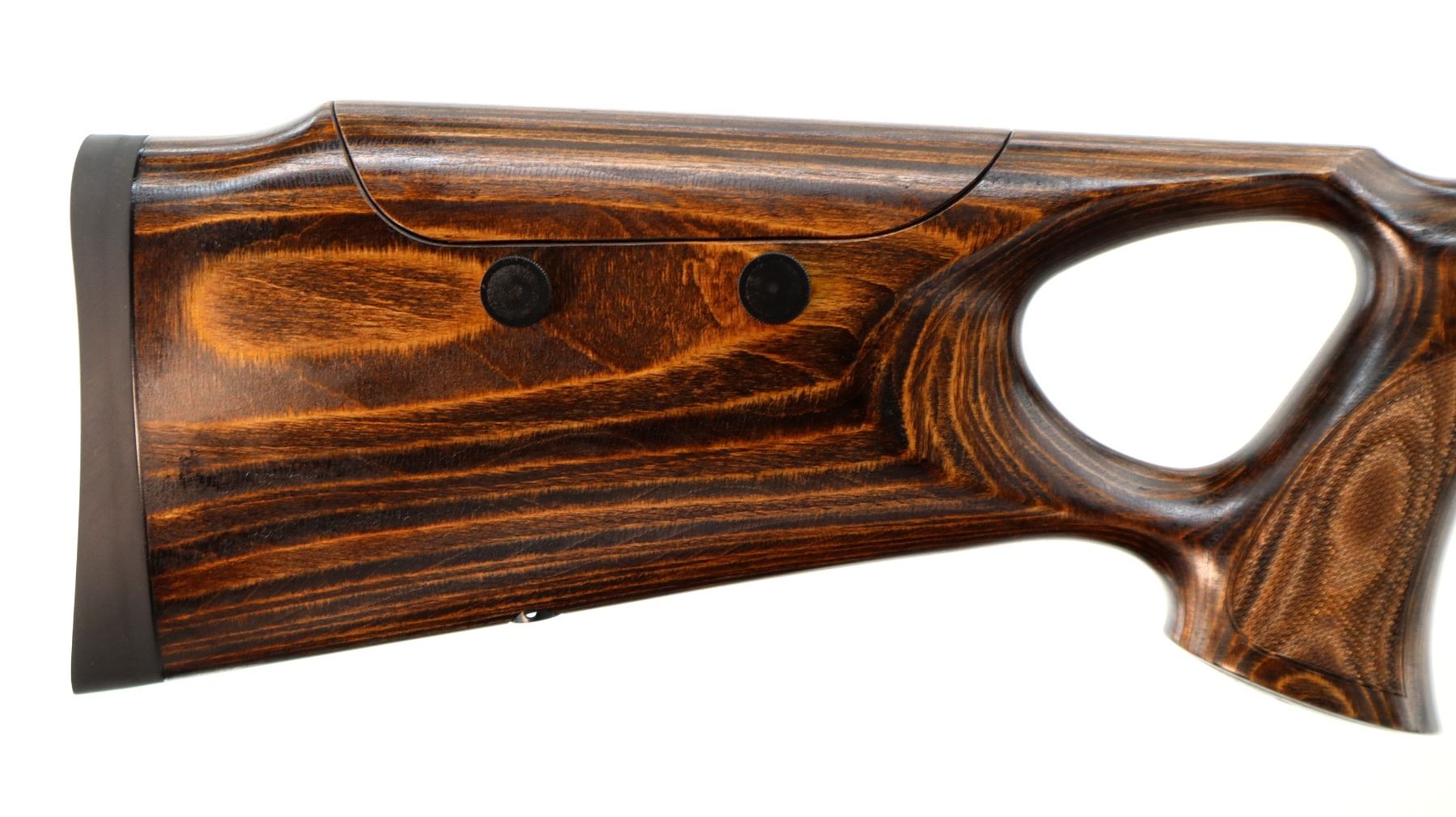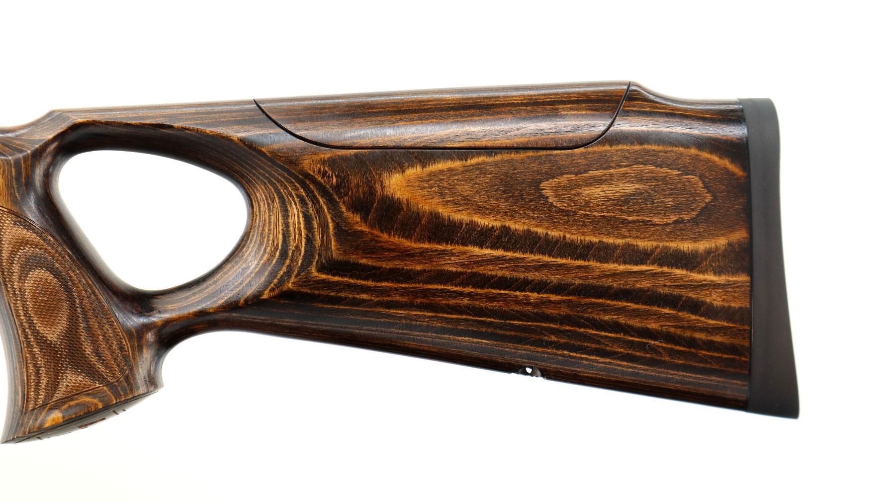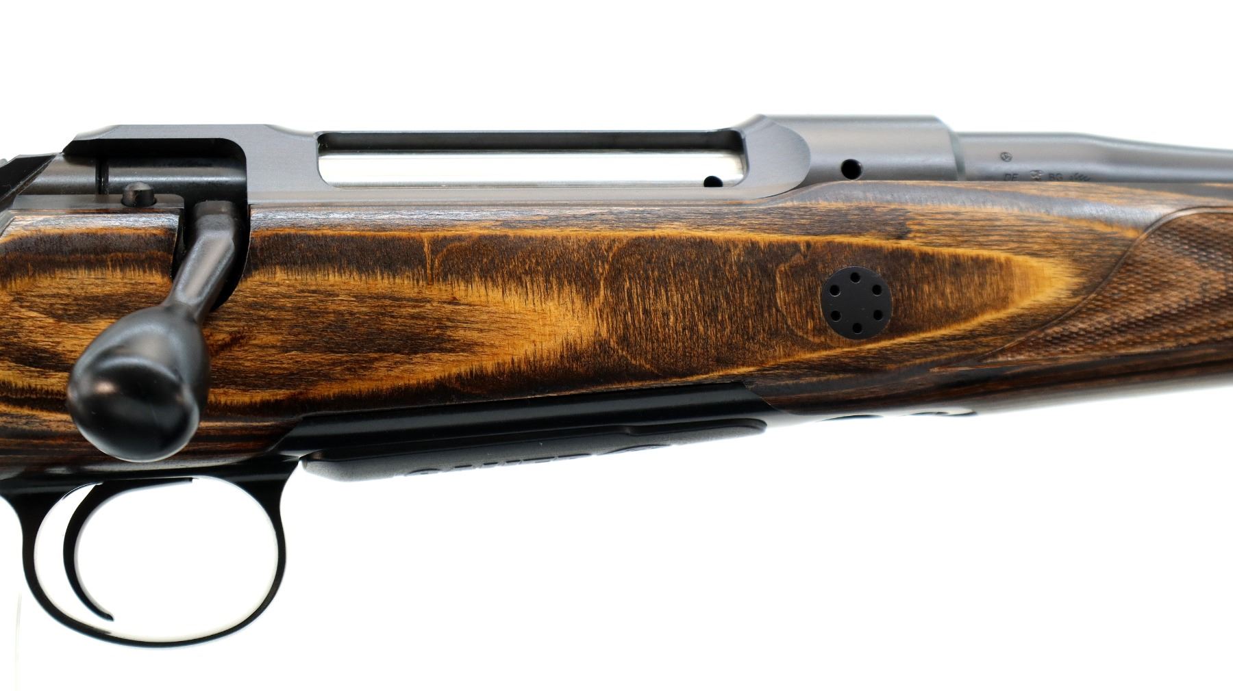 Main Description: No sights, Satin blued finish, tapered round barrel threaded at muzzle with cap, receiver drilled and tapped with plug screws installed, smooth black polymer bolt knob. One piece brown laminate wood stock, Schnabel forend tip, checkered forearm and thumb hole pistol grip, adjustable comb, black rubber recoil pad. Two QD sling points and one swivel stud on forearm.