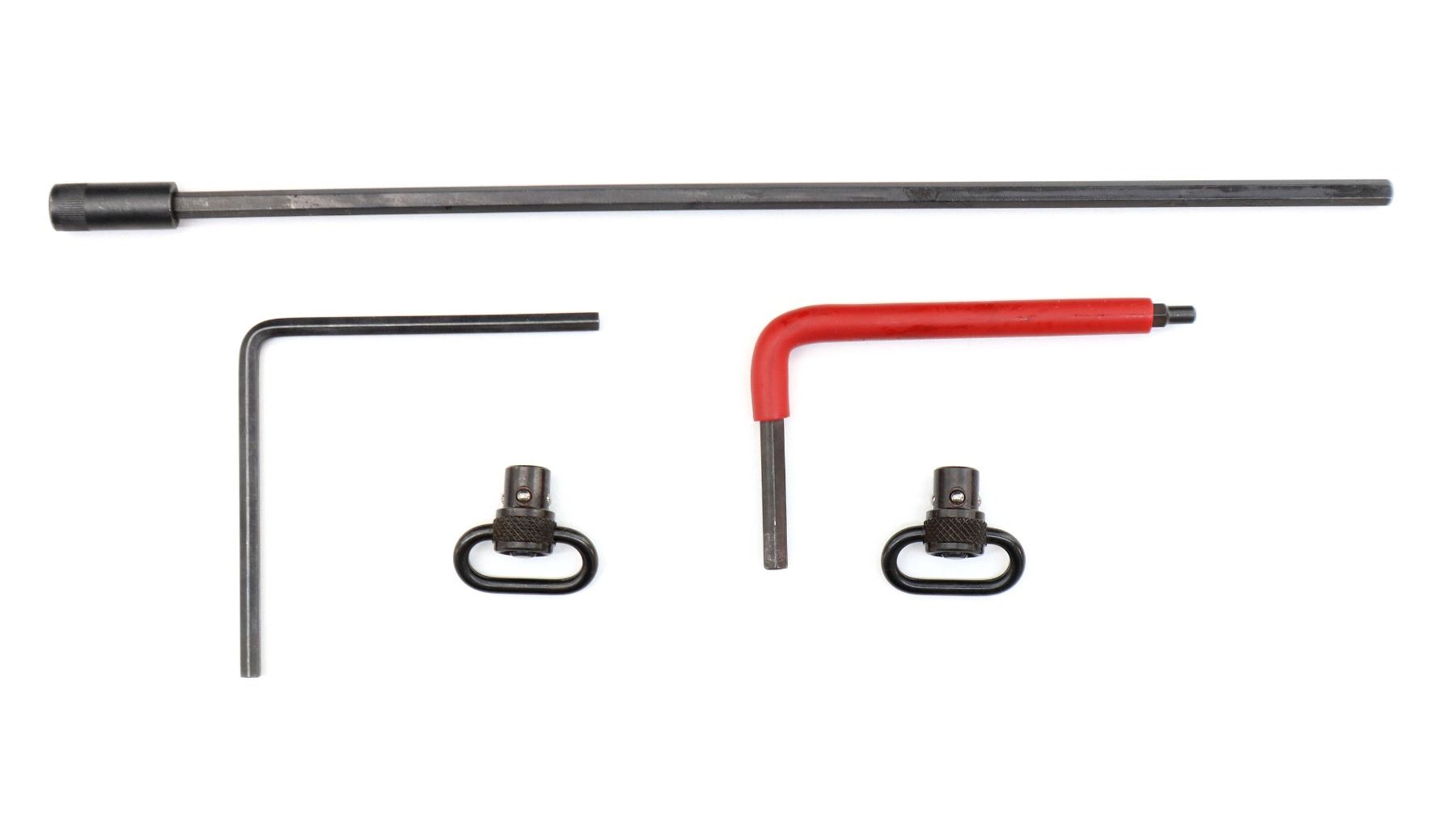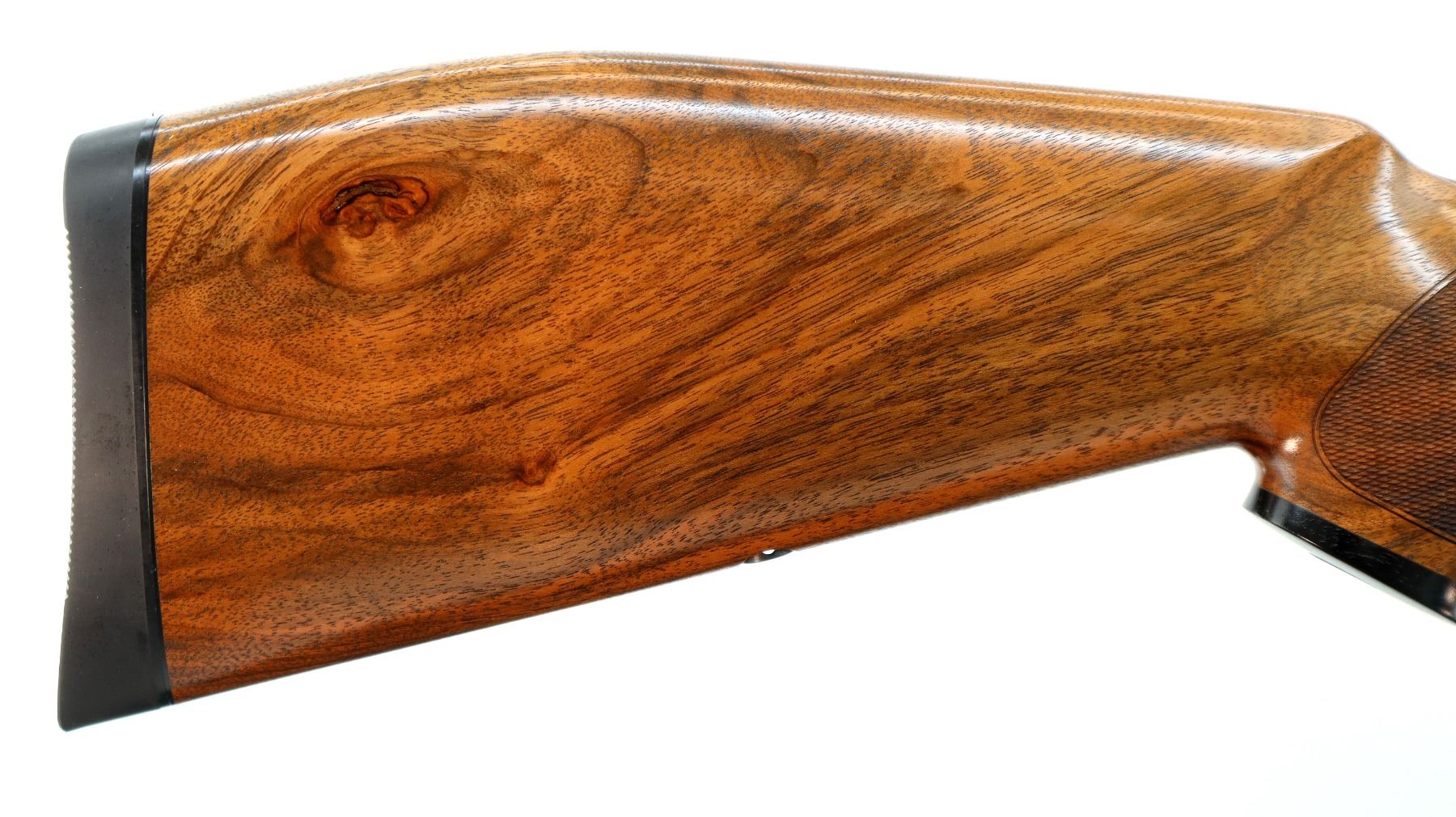 Main Description: Red fiber optic blade front sight with ramp, adjustable V notched rear sight with ramp, Parkerized metal finish, receiver drilled and tapped with plug screws installed, smooth bolt knob. Two piece gloss finish wood stocks, black forend and pistol grip caps, checkered forearm and pistol grip with right hand palm swell, European cheek rest, black rubber recoil pad, QD sling points.
