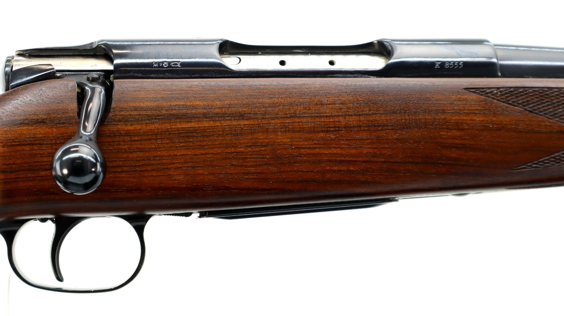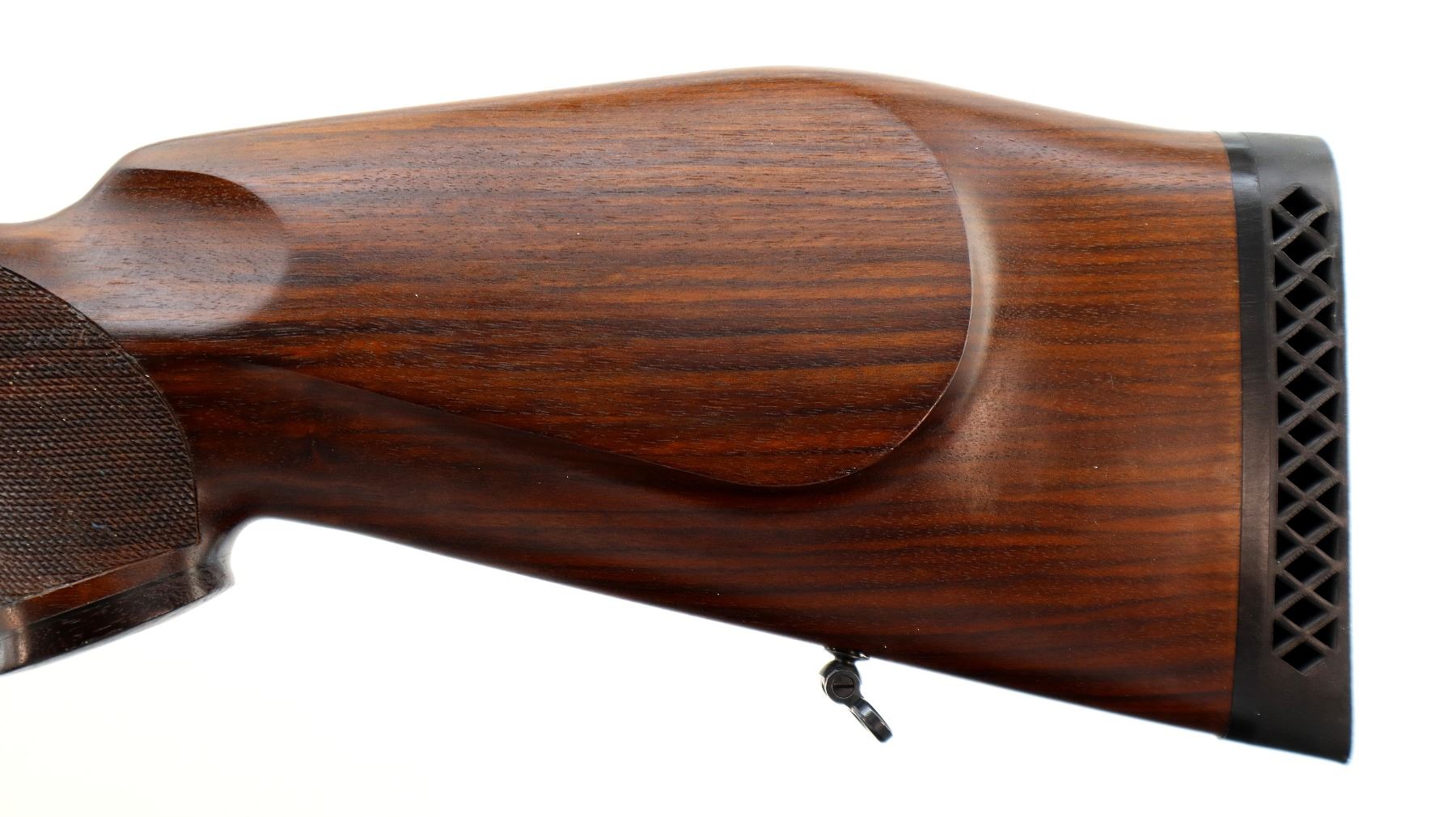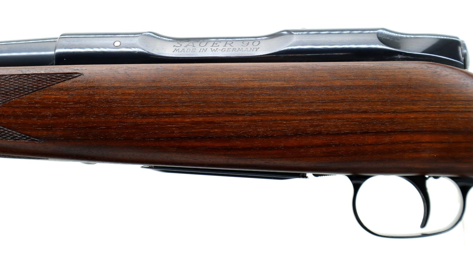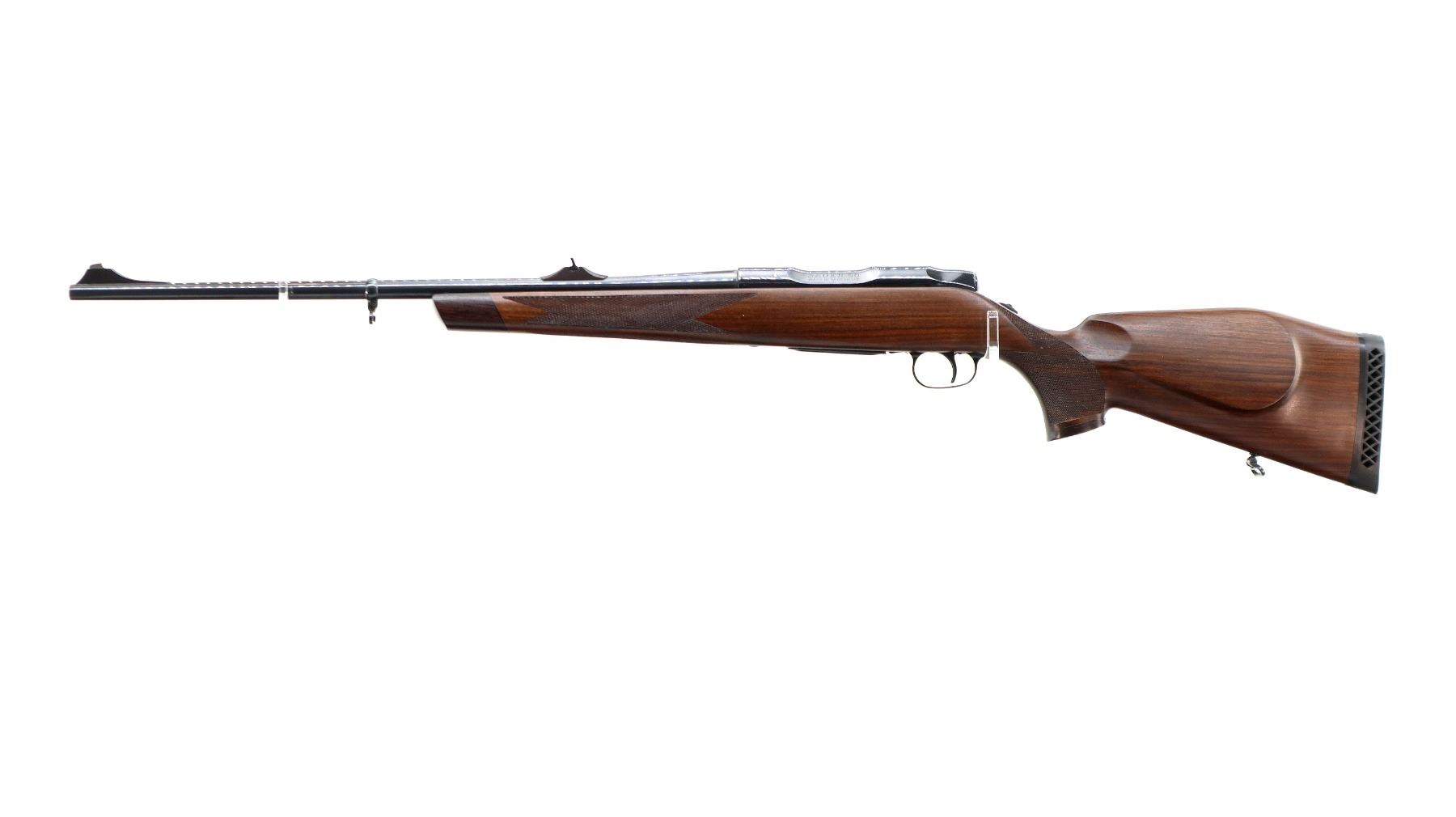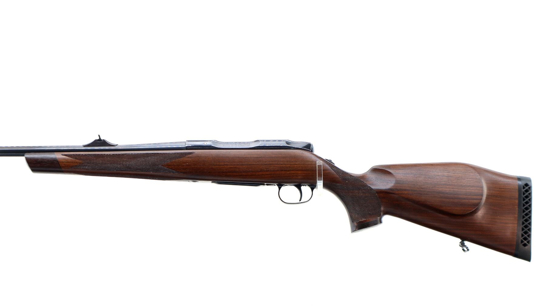 Main Description: Blade front sight with ramp, adjustable u notched rear sight with ramp, polish blued finish, receiver drilled and tapped with plug screws installed, smooth bolt knob, tang safety. One piece Satin finish wood stock, Rosewood forend and pistol grip caps with Sauer Medallion, checkered forearm and pistol grip with right hand palm swell, cheek rest, black vented rubber recoil pad, sling swivels.