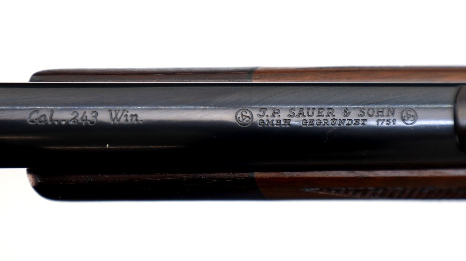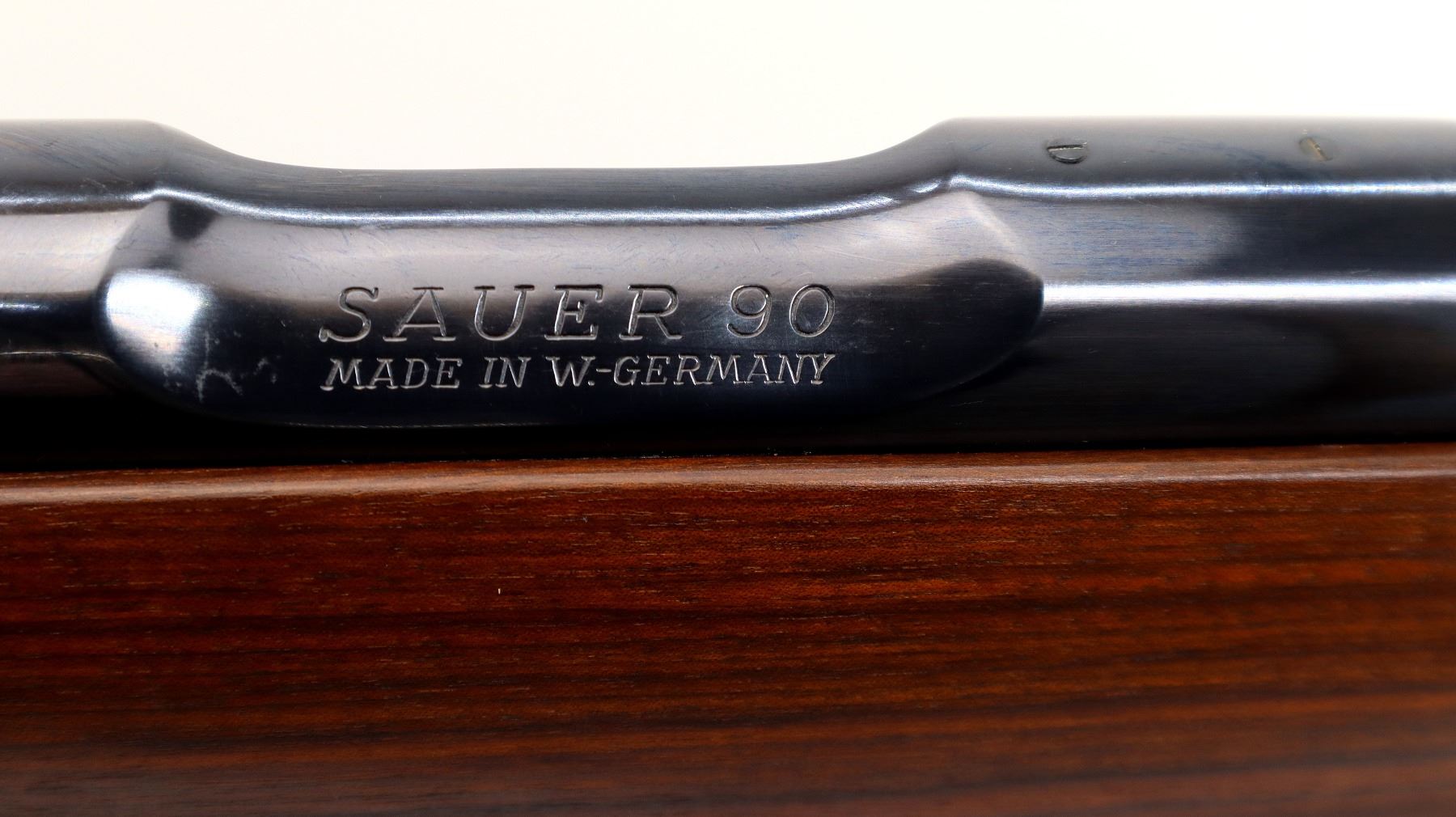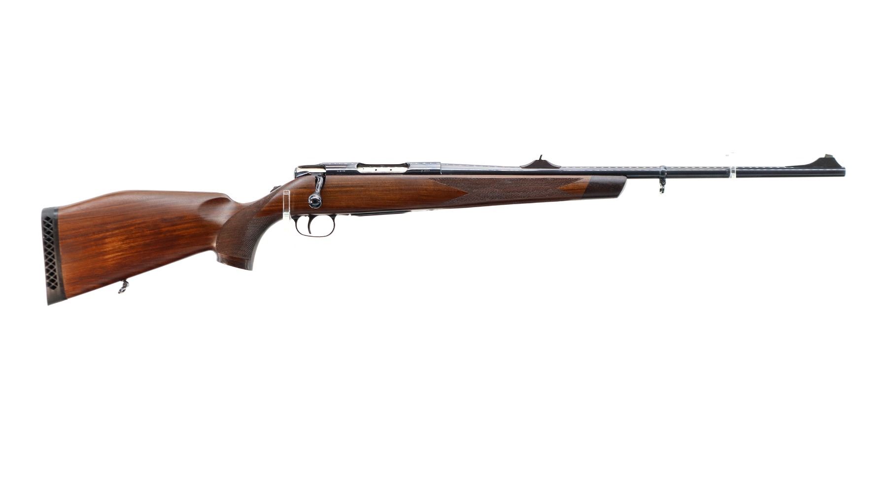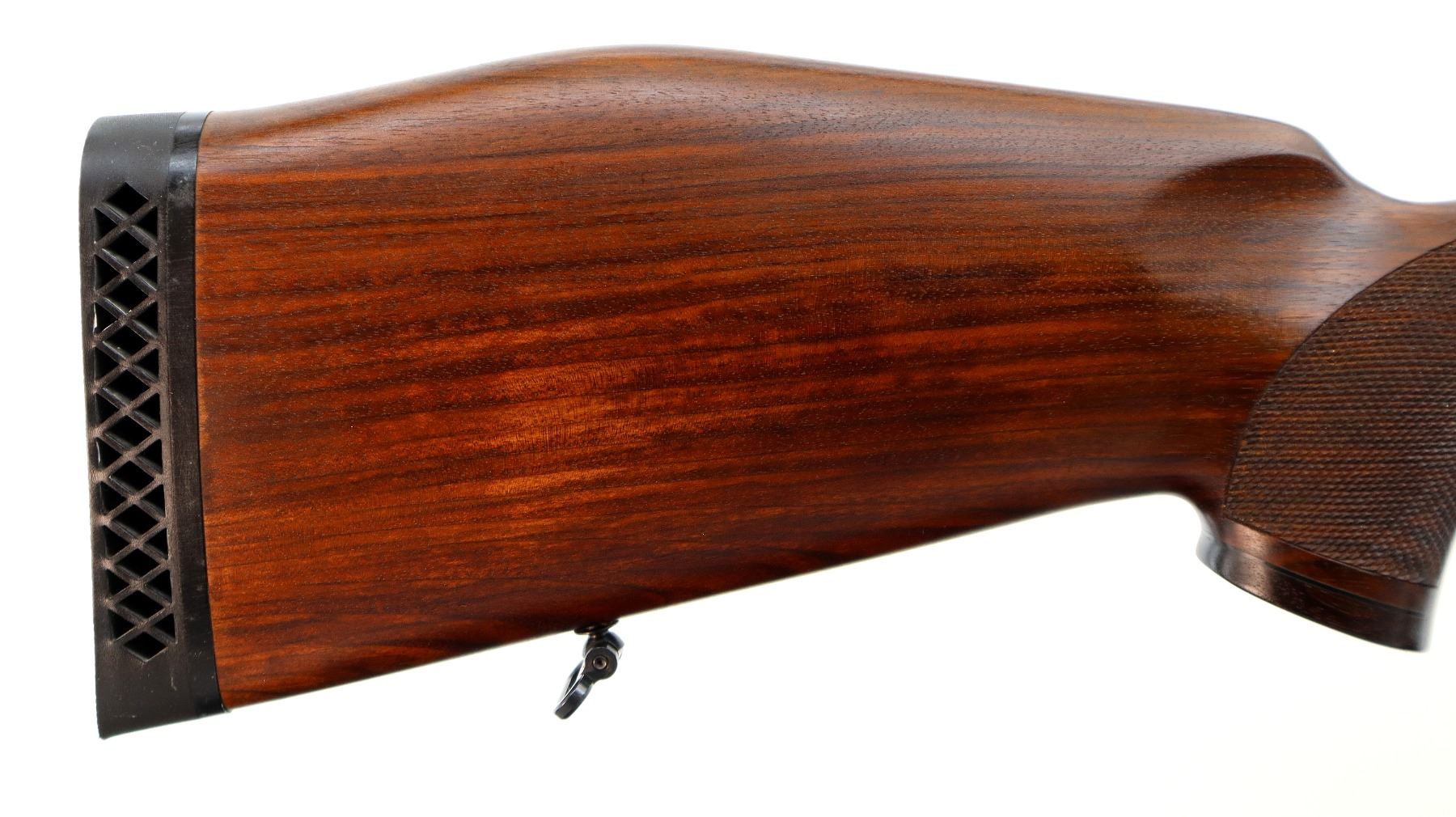 Main Description: Blade front sight with ramp, adjustable u notched rear sight with ramp, polish blued finish, receiver drilled and tapped with plug screws installed, smooth bolt knob, tang safety. One piece Satin finish wood stock, Rosewood forend and pistol grip caps with Sauer Medallion, checkered forearm and pistol grip with right hand palm swell, cheek rest, black vented rubber recoil pad, sling swivels.