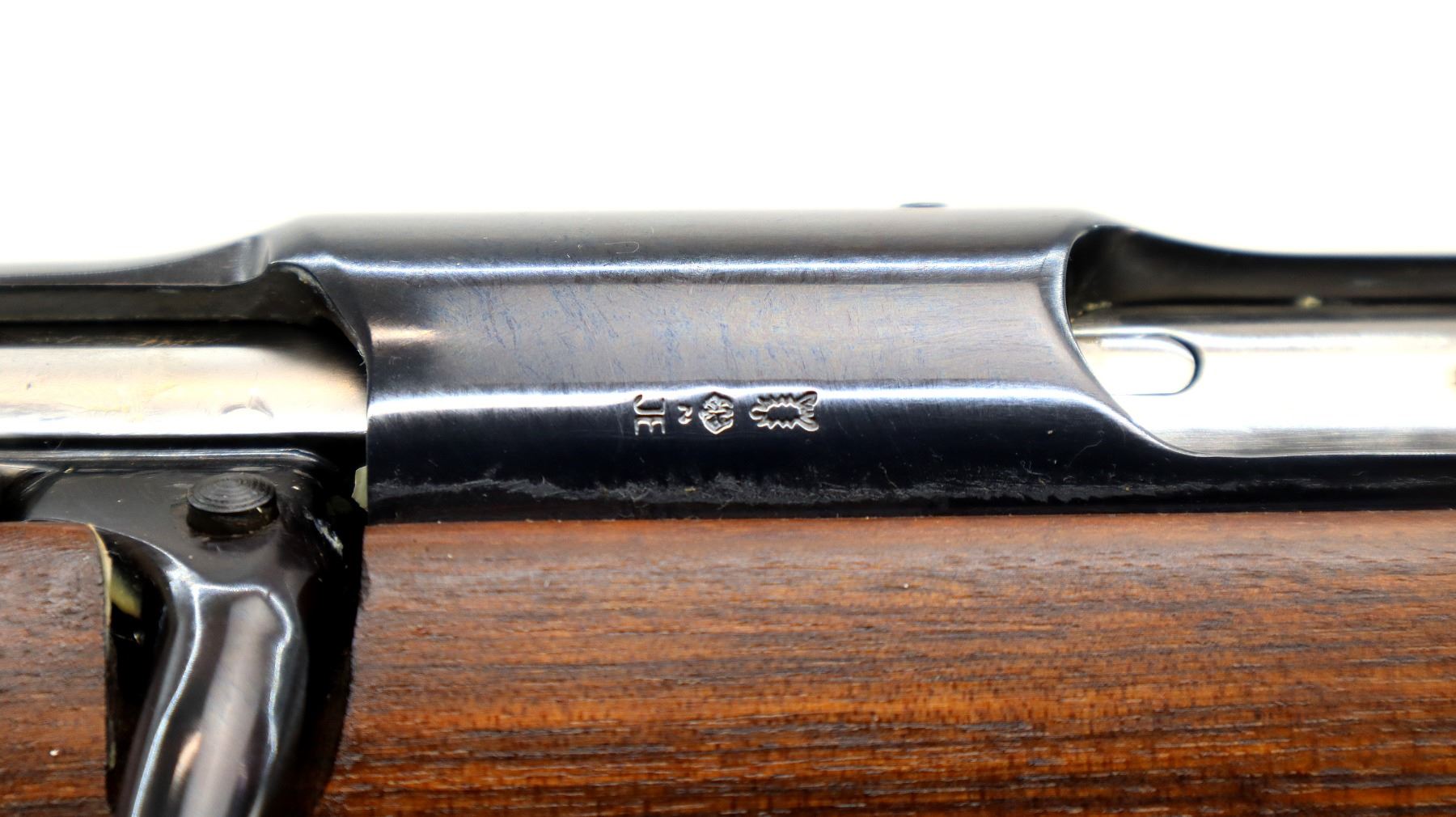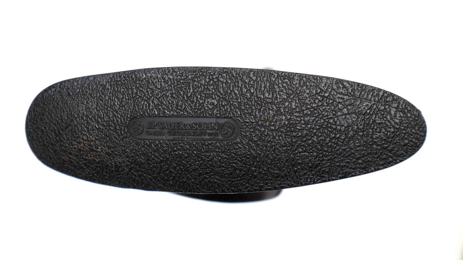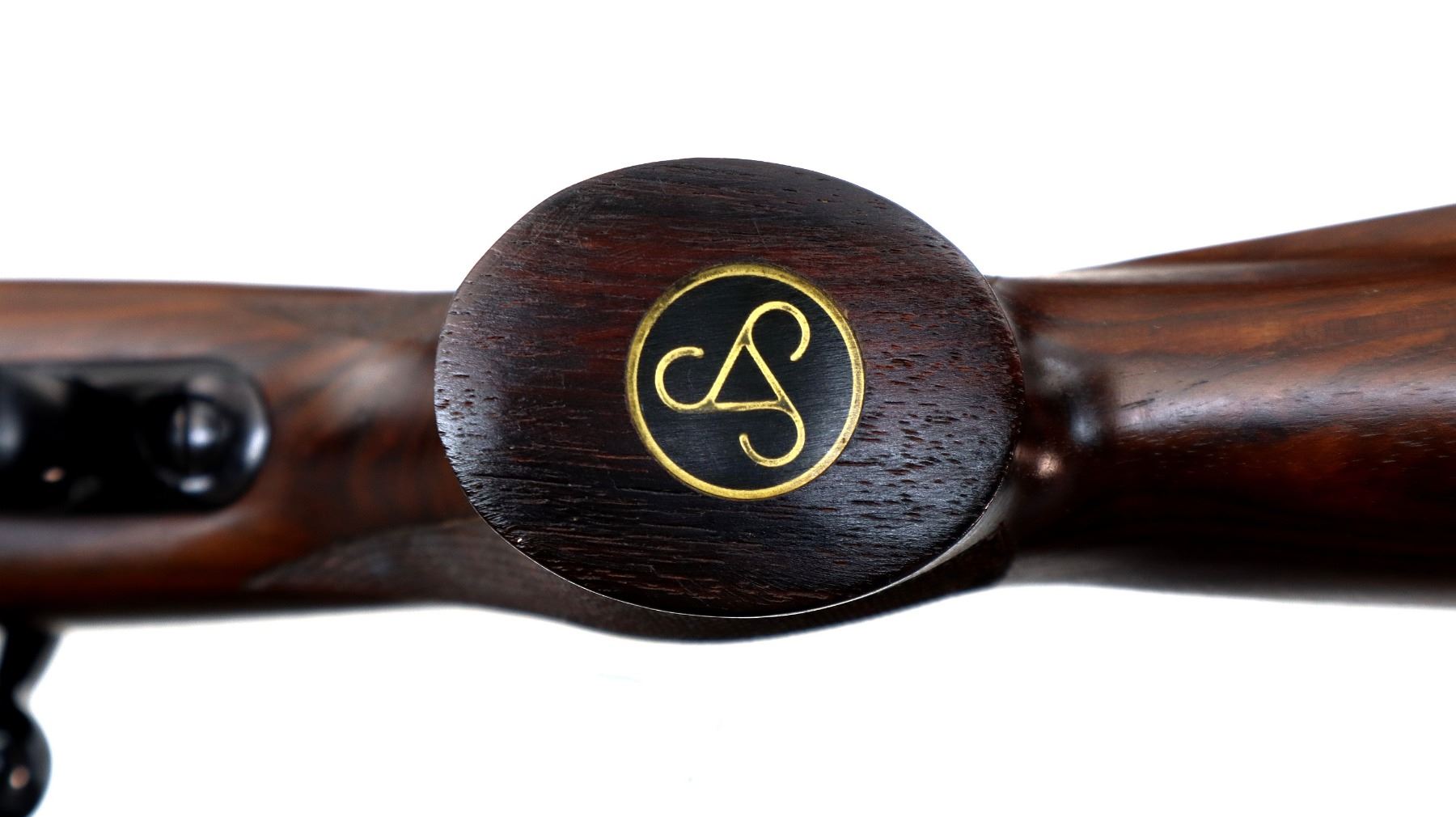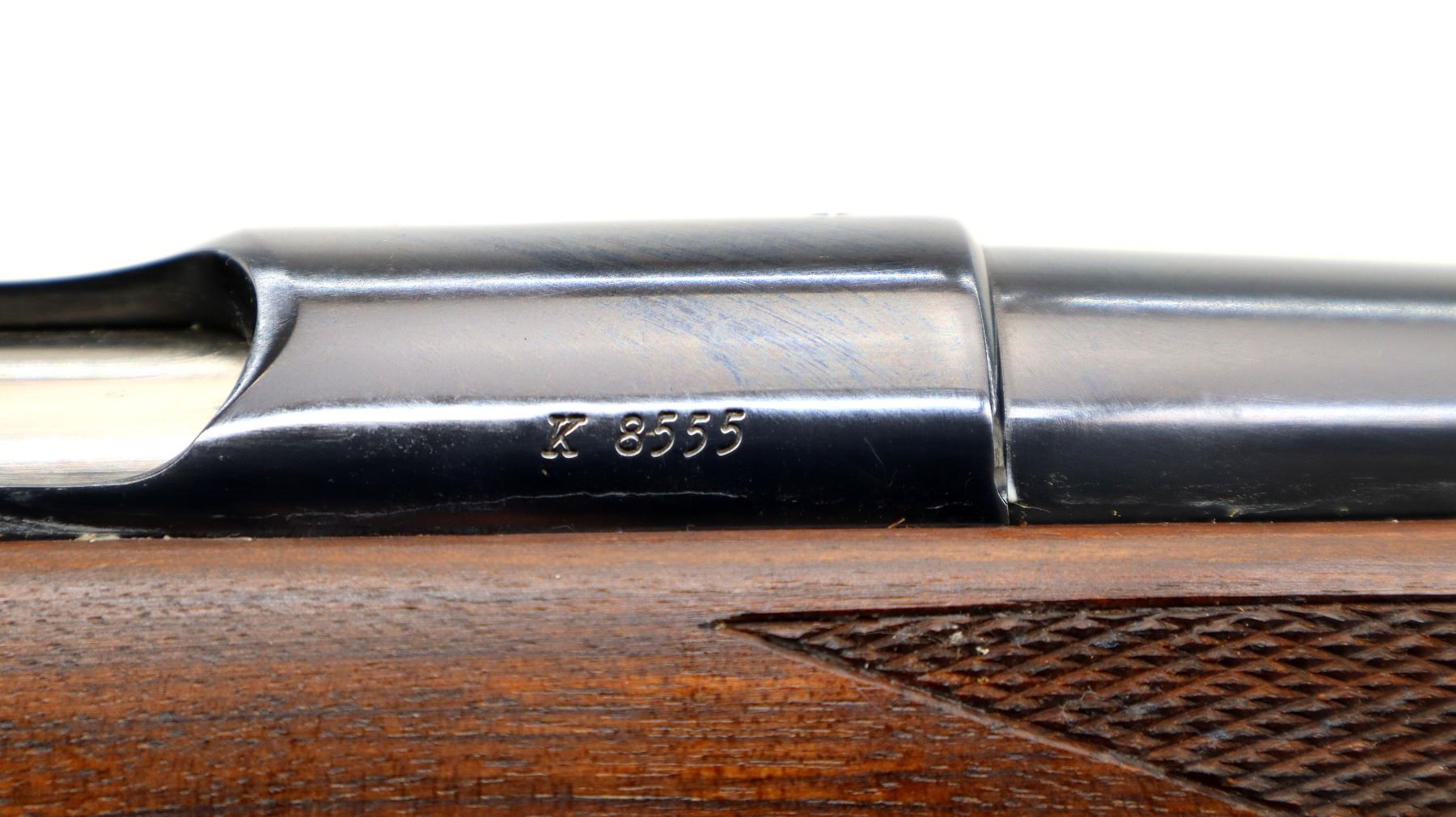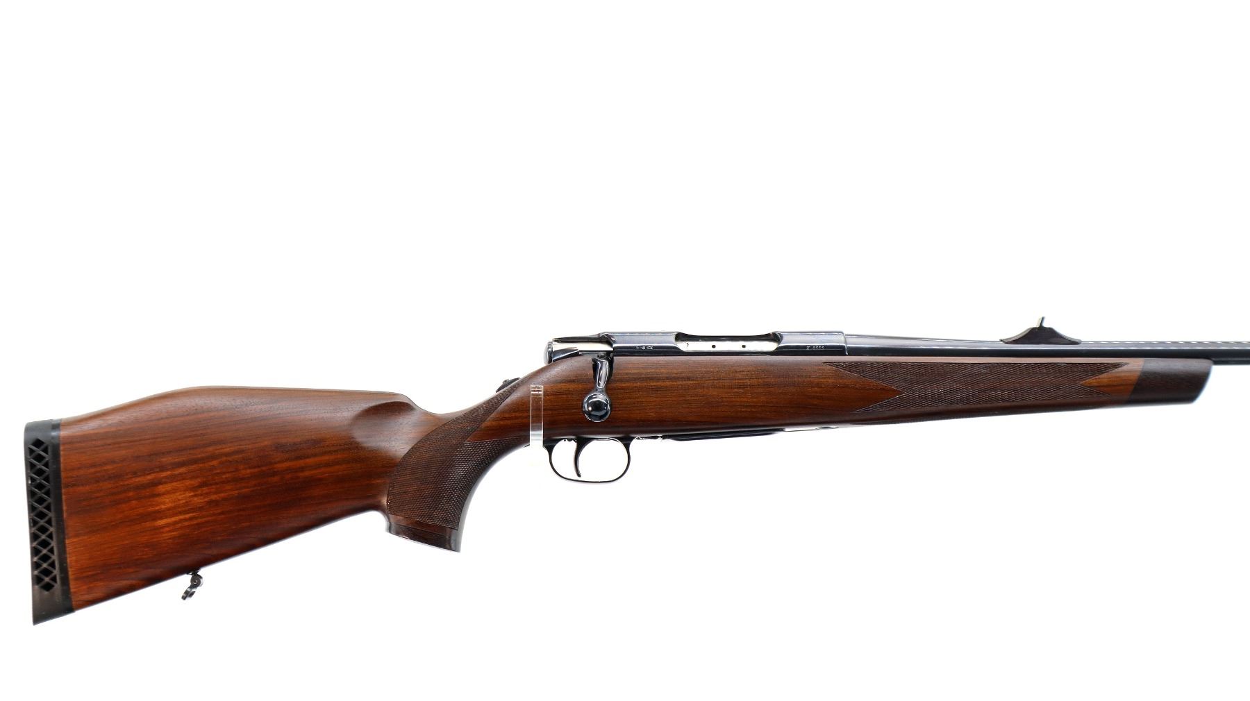 Main Description: Blade front sight with ramp, adjustable u notched rear sight with ramp, polish blued finish, receiver drilled and tapped with plug screws installed, smooth bolt knob, tang safety. One piece Satin finish wood stock, Rosewood forend and pistol grip caps with Sauer Medallion, checkered forearm and pistol grip with right hand palm swell, cheek rest, black vented rubber recoil pad, sling swivels.