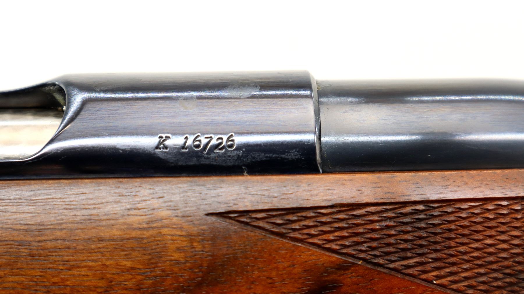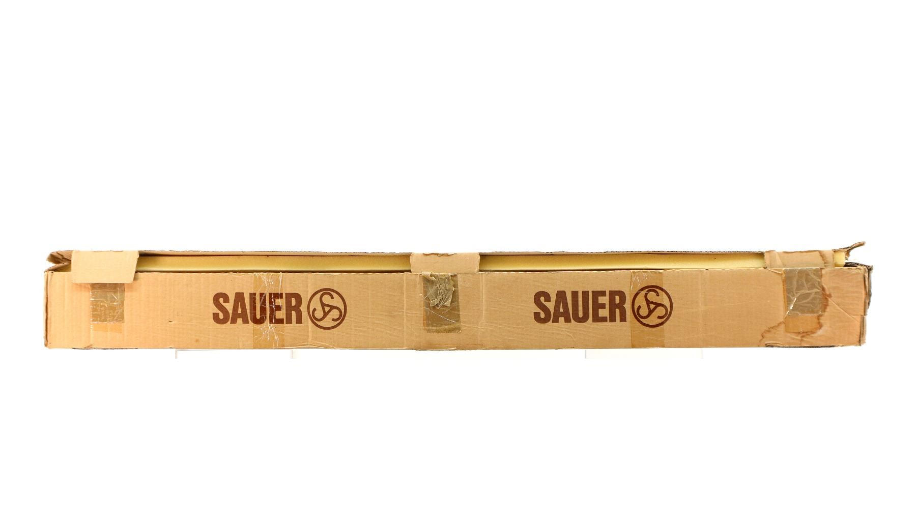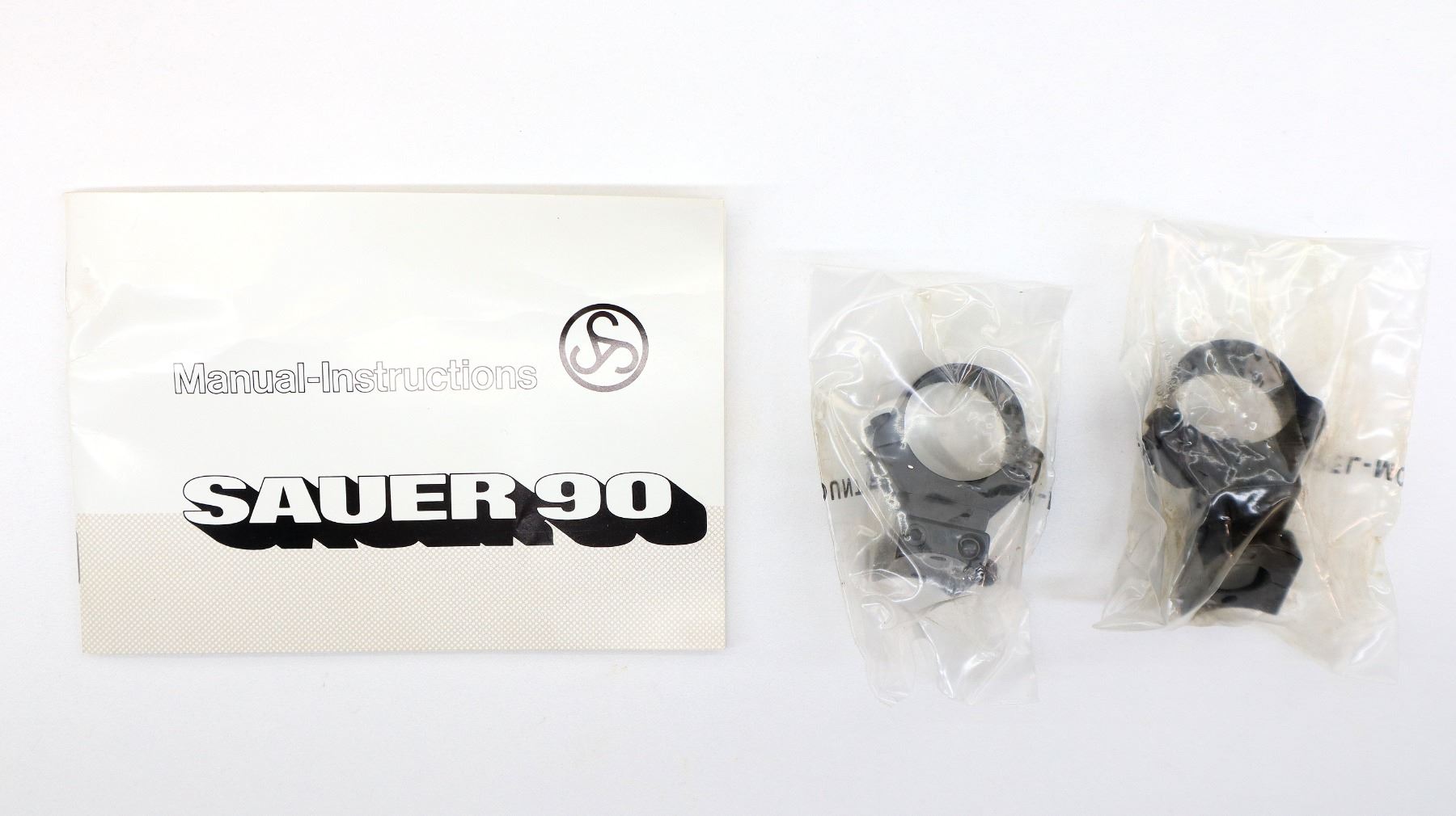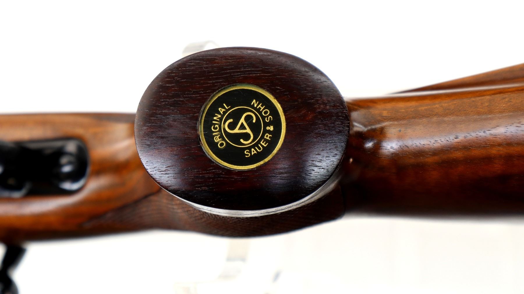 Main Description: Blade front sight with ramp, adjustable u notched rear sight with ramp, polish blued finish, receiver drilled and tapped with plug screws installed, jeweled bolt, smooth knob, tang safety. One piece Satin finish wood stock, Rosewood forend and pistol grip caps with Sauer & Sohn Medallion, checkered forearm and pistol grip with right hand palm swell, cheek rest, black vented rubber recoil pad, grooved gold trigger, sling swivels. Accessories include: EAW blued steel 1" QD rings and bases in Original box.