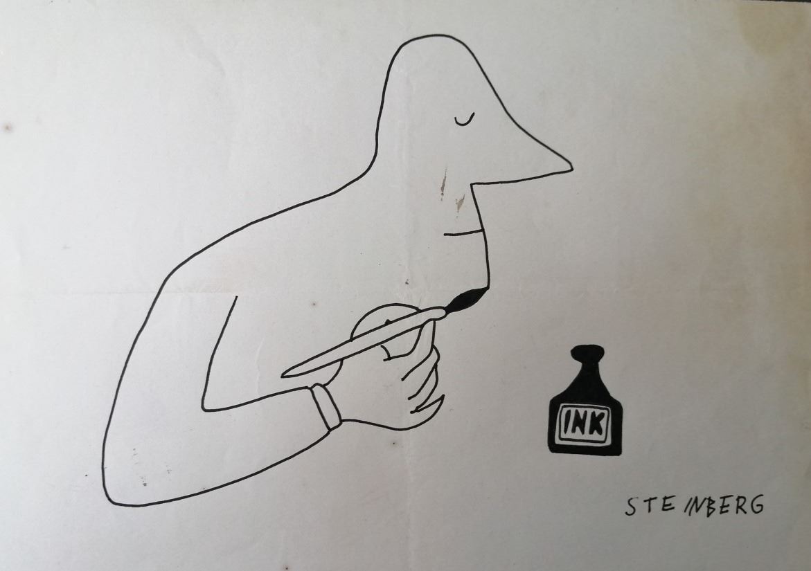 Vintage drawing by Romanian American cartoonist Saul Steinberg. Saul Steinberg defined drawing as "a way of reasoning on paper," and he remained committed to the act of drawing. Throughout his long career, he used drawing to think about the semantics of art, reconfiguring stylistic signs into a new language suited to the fabricated temper of modern life. Sometimes with affection, sometimes with irony, but always with virtuoso mastery, Saul Steinberg peeled back the carefully wrought masks of 20th-century civilization. The Steinberg signed drawing measures 11.5x7 inches and comes supplied with coa. Please note there is a large crease through the image.