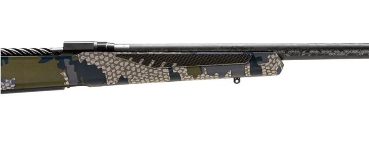 The carbon fiber wrapped stainless steel barrel and melonite skeltonized receiver minimize weight for success on any mountain hunt.
