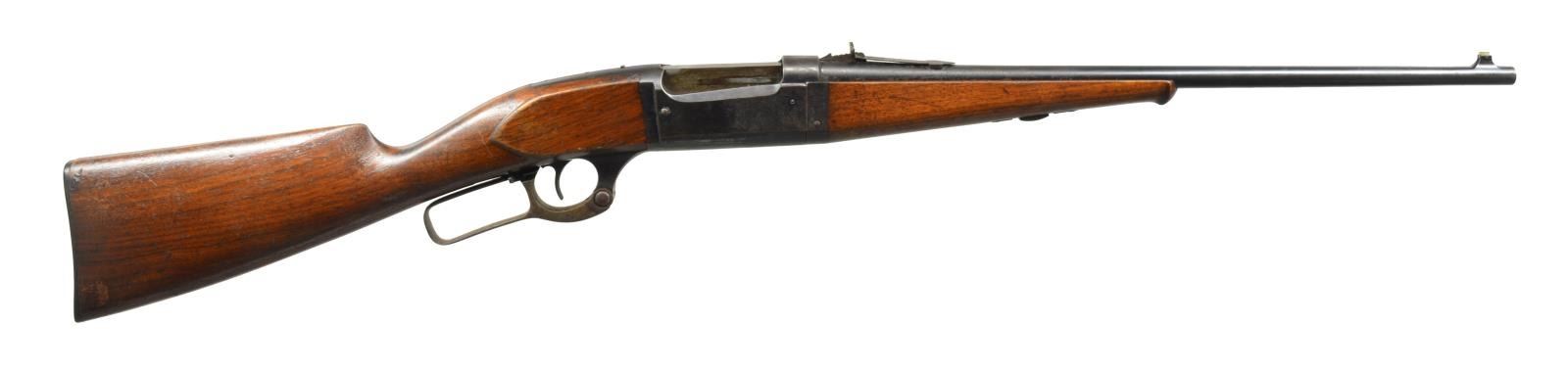 RIFLE. Cal. 22 Hi-Power. S# 140096. Bbl. 22" of tapered light weight. Pinned German silver bead front sight w/ elevator adj. U notch sporting rear sight. Takedown style action w/ brass rotary mag., cocking indicator, case colored lever & bent tab safety. Schnabel tipped walnut forearm & straight grip perch belly walnut stock w/ buttplate. 1913 Mfg. CONDITION: 70% dull blue fading to brown showing surface corrosion. Wood shows finish wear w/ scratches & handling marks. Stock has a sm. chip at right side of action. Bore retains intact rifling showing some light pitting. (20-2811/DS). CURIO. $700-1,000.