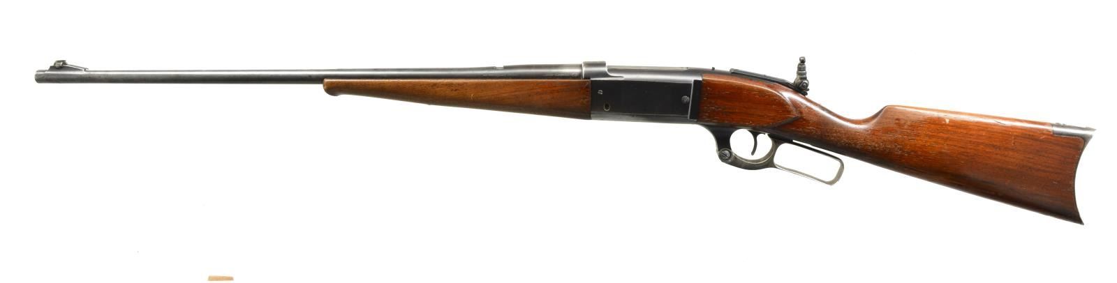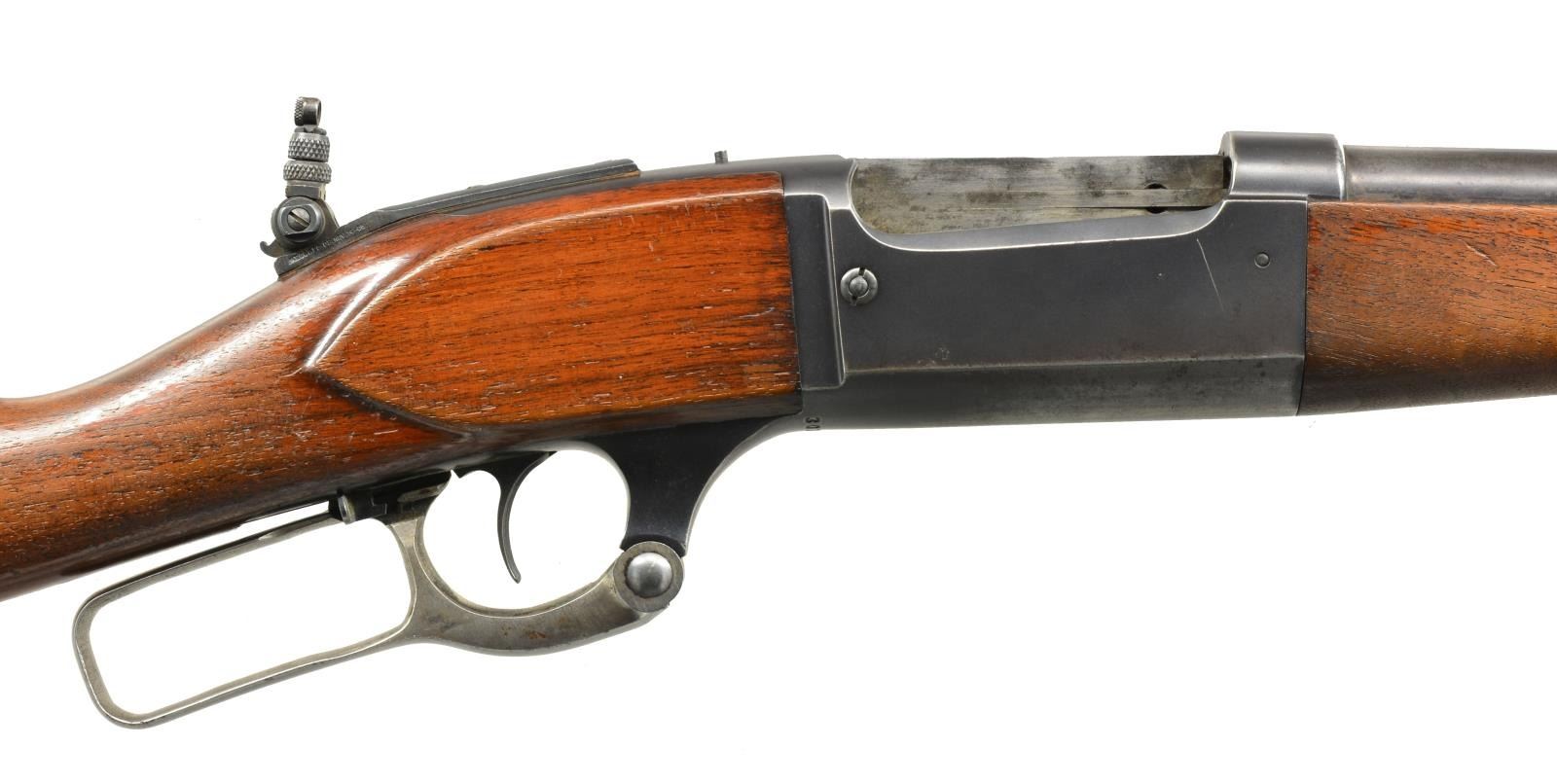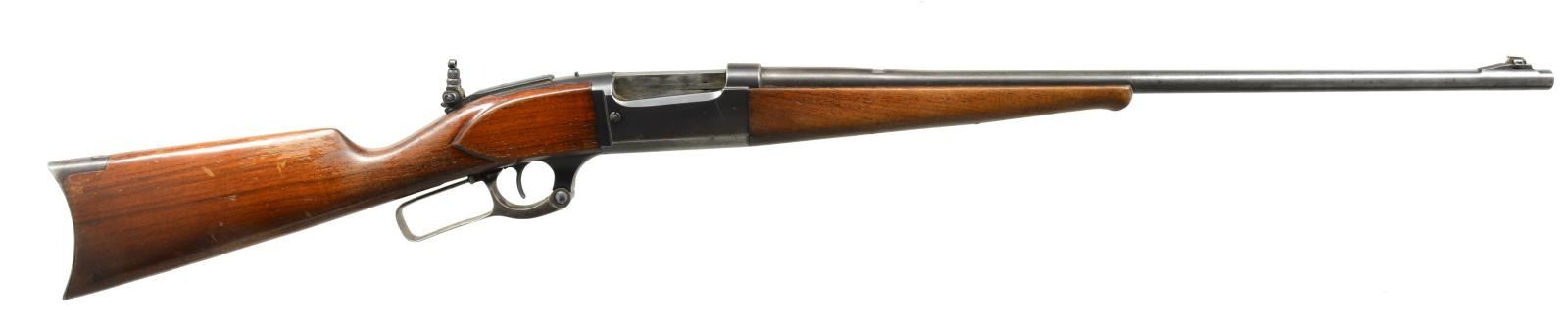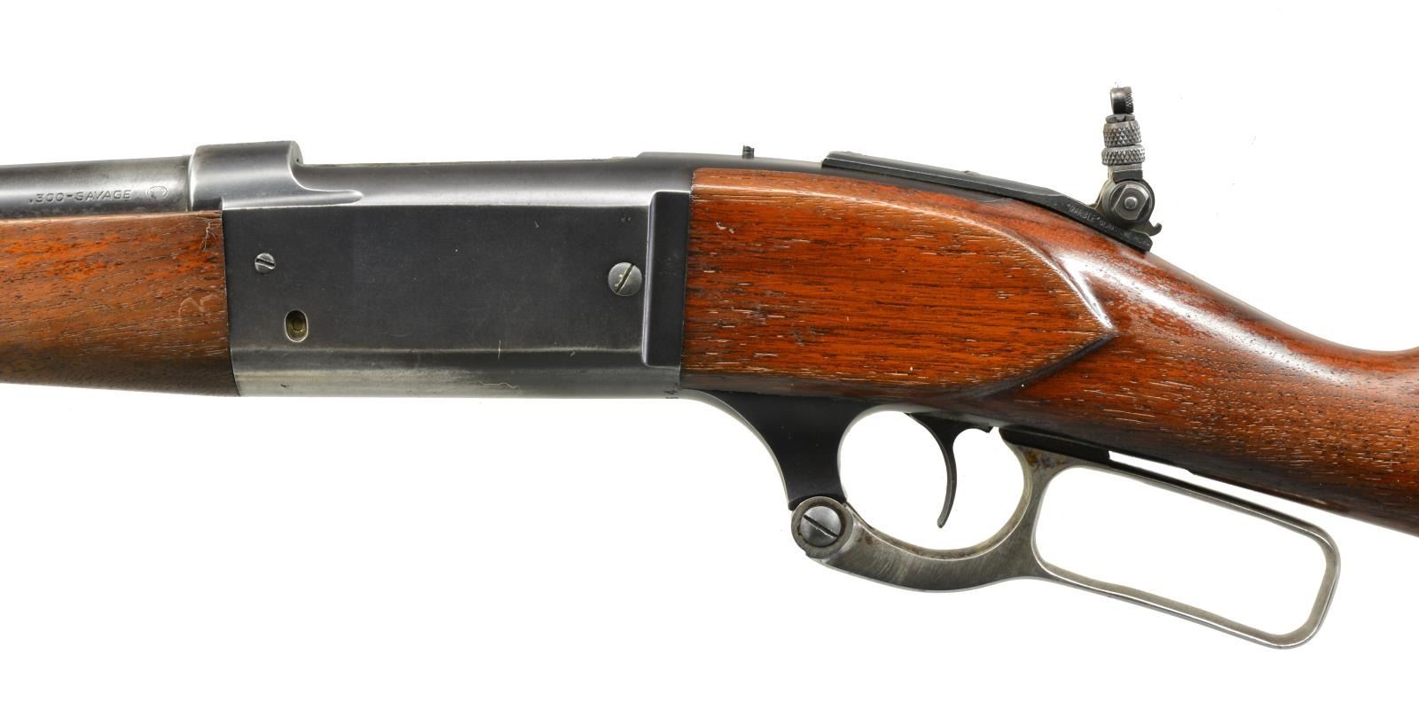 Cal. 300 Sav. S# 303564. Bbl. 24" rnd. w/ ramp mounted bead front sight, open dovetail for rear sight & Marbles flexible tang sight. Action features brass rotary mag., cocking indicator & bent tab safety. Blue finish w/ case colored lever. Schnabel tipped walnut forearm & straight grip stock w/ crescent steel buttplate. CONDITION: 70% dull lightly worn blue showing spots of light pitting & handling marks. Lever retains traces of case colors. Wood has worn & peeling finish showing light scratches & marks. Good mechanics. Bright bore retains sharp rifling. (20-2304/DS). CURIO. $500-700.