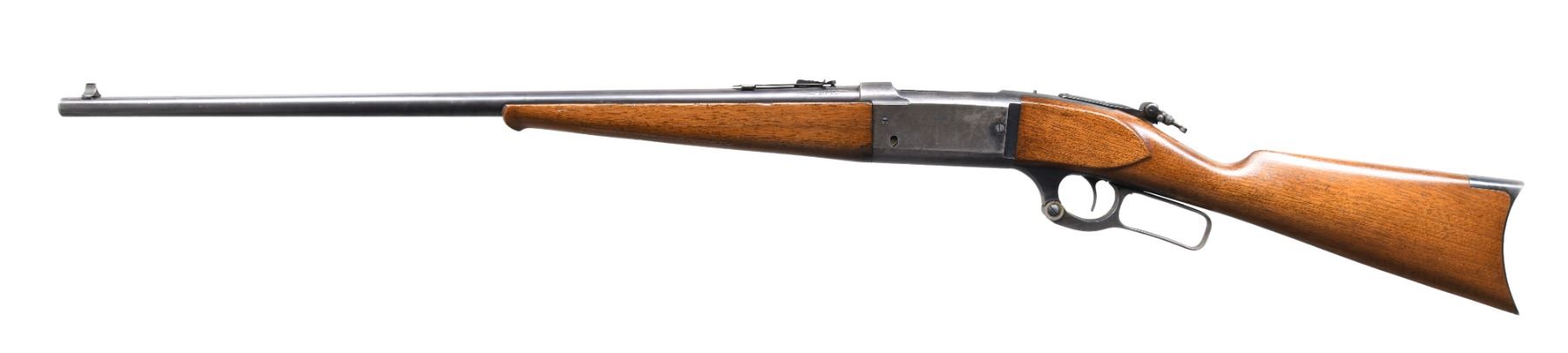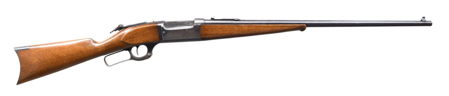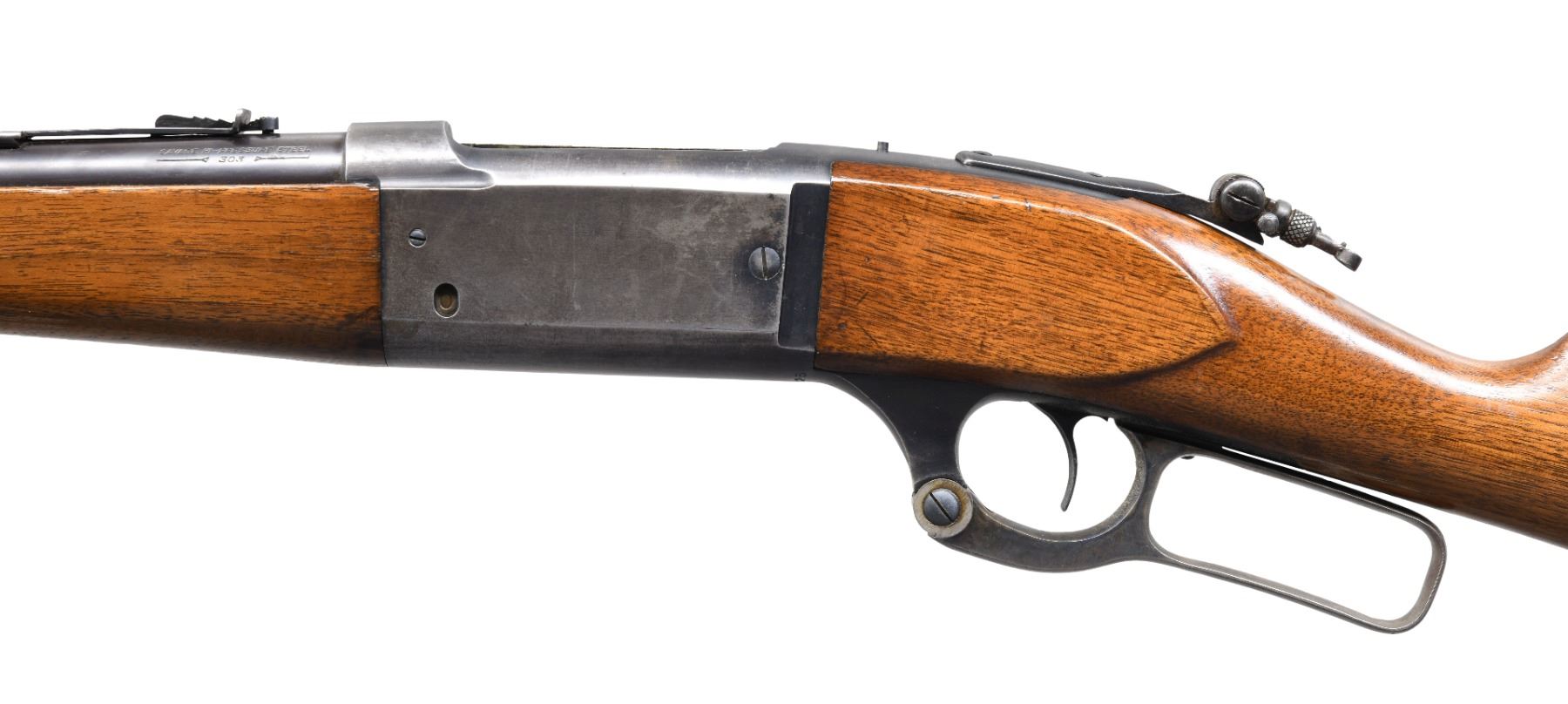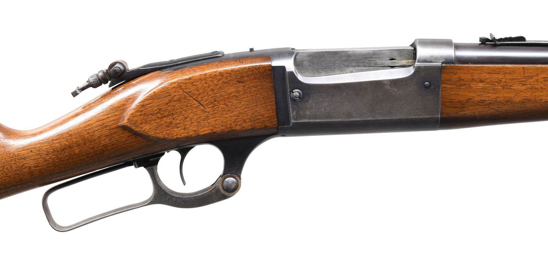 Cal. 303 Savage. S# 231125. Bbl. 26" round. Bead front sight, flat top sporting rear sight & combination tang sight. Action features brass rotary mag., left side shell counter, cocking indicator & bent tab safety. Blue finished w/ case colored lever. Schnable tipped walnut forearm & straight grip stock w/ crescent steel buttplate. Mfg. 1927. CONDITION: 70% lightly faded metal finish showing carry wear. Original wood finish shows wear w/ numerous scratches & marks. Very good bore. (24-6326/DS). CURIO. $1,000-1,300.