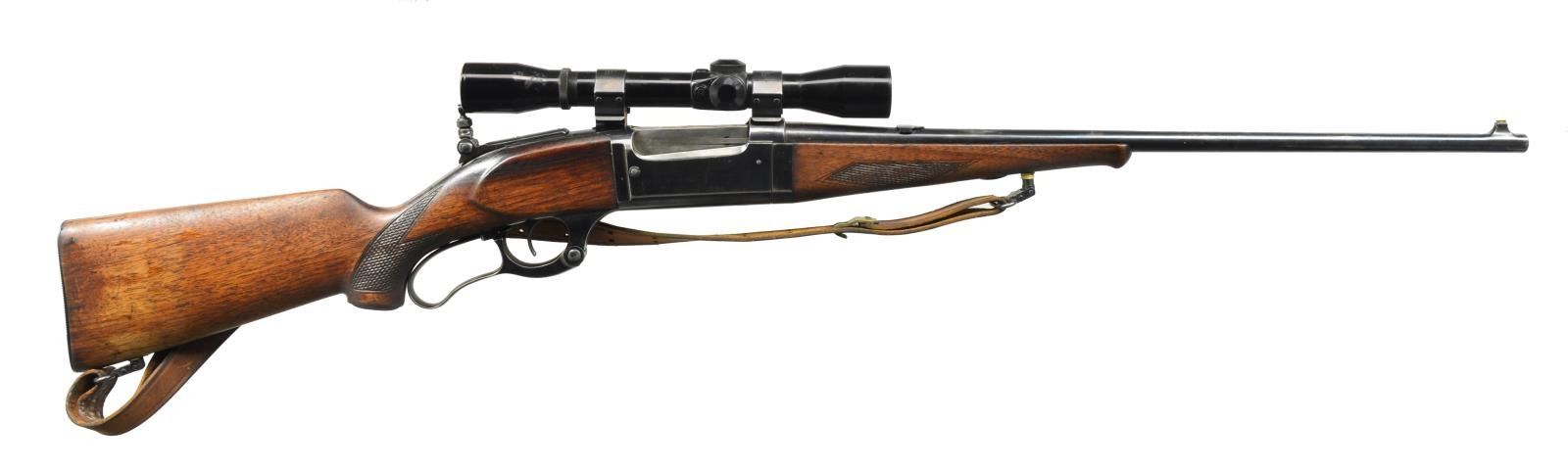 Cal. 250-3000. S# 218408. Bbl. 22" of tapered light weight. Pinned brass blade bead front sight, rear sight is broken to filler length w/ Lyman combination tang sight. Bushnell ScopeChief 4x32 gloss finished scope w/ post reticle on Weaver pivot mts. Takedown style action w/ brass rotary mag., cocking indicator & bent tab safety. Schnable tipped forearm & hard rubber capped pistol grip stock of black walnut w/ hand checkering & steel buttplate. Leather sling on added QD swivels. 1920 Mfg. CONDITION: 80% lightly worn reblued finish. Sanded & refinished stock & forearm show wear spots w/ scratches & marks. Bore retains sound rifling. (20-2847/DS). CURIO. $400-600.