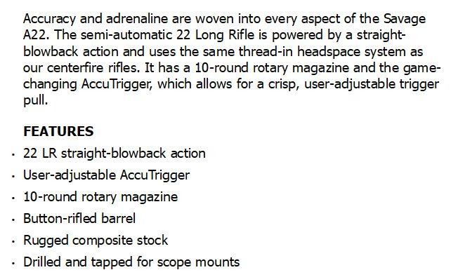 Accuracy and adrenaline are woven into every aspect of the Savage® A22. The semi-automatic 22 Long Rifle is powered by a straight-blowback action and uses the same thread-in headspace system as our centerfire rifles. It has a 10-round rotary magazine and the game-changing AccuTrigger™, which allows for a crisp, user-adjustable trigger pull.