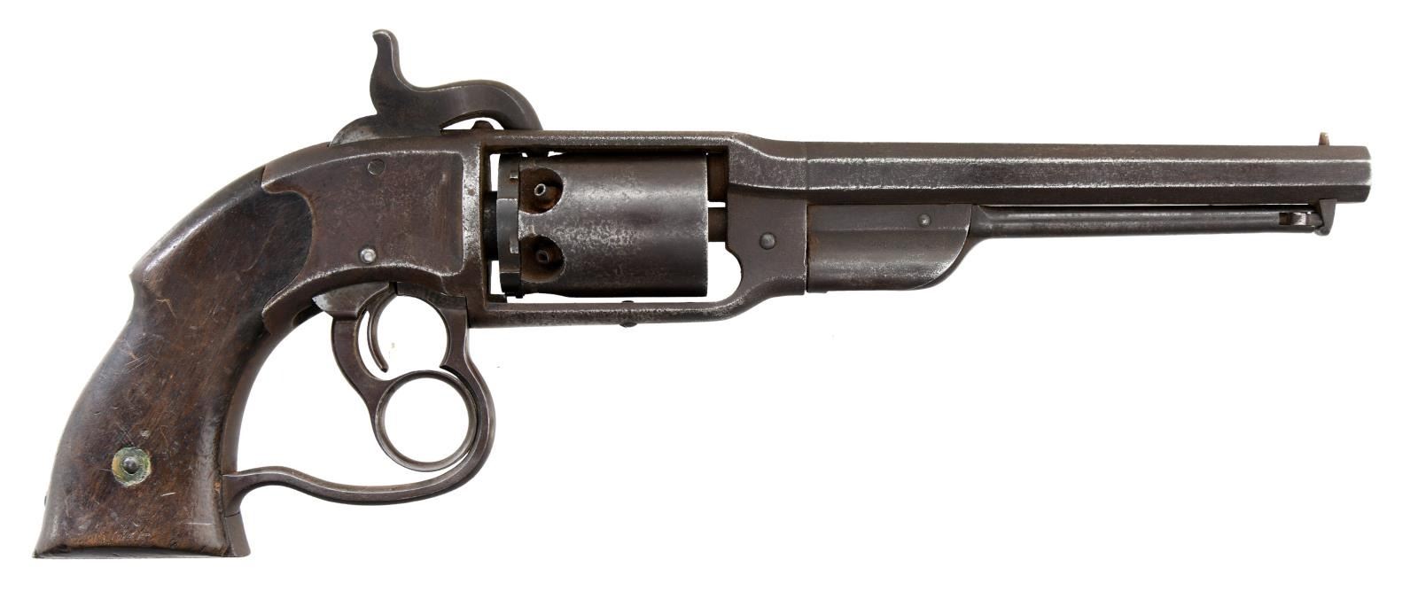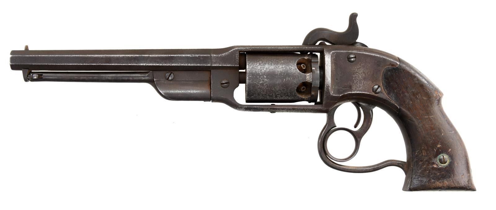 Cal. 36. S# 11179. (under right grip on gripframe) Bbl. 7 1/8" octagon. Brass post front & simple notch rear sights, 6 shot cylinder, hinged type loading lever, flat sides of frame & heart shaped trigger/lever guard. CONDITION: metal is a mix of rust brown, blue/gray patina w/ numerous impact marks & pitting throughout. Markings atop frame still remain legible. Action appears to work properly; pulling the ring places hammer at half cock & then you must thumb the hammer to full cock. Nipples are rusty & peened. Grips are dinged, dented & chipped w/ an exceptionally faint outline of an inspector cartouche bottom of left panel. Bore retains visible rifling but rust throughout. (01-23513/CW). ANTIQUE. $900-1,400.