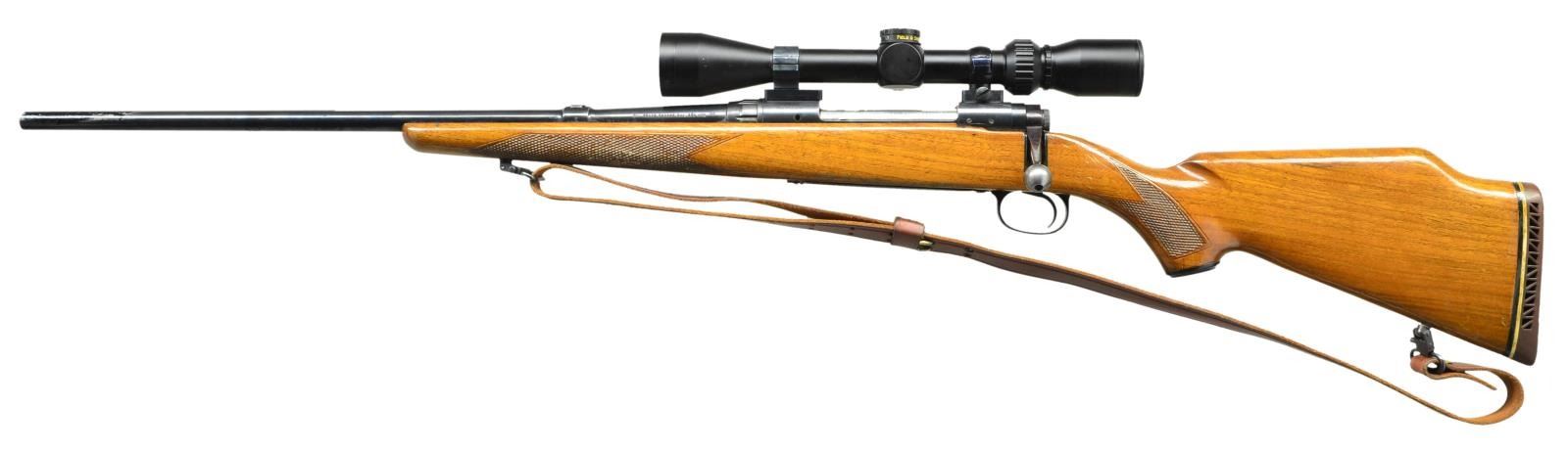 Cal. 270 Win. S# 27384. Bbl. 22" w/ front sight ramp removed plus slot blank in boss. Mfg. 1959-1969 as left handed Sporter having Monte Carlo checkered walnut stock w/ black plastic grip cap. Pachmayr white line ventilated pad added (13 1/4" LOP) plus sling studs & Hunter sporting sling. Early example w/ bolt handle recess of black plastic insert. Redfield 2 piece base set w/ 2 different vintage rings. Field & Stream matte 3.5-10X40 duplex reticle scope. CONDITION: Front sight removed having black paint covering area. Stock inletted for prior installed receiver sight. Light stock marks & added finish. High point metal finish wear w/ scattered peppery oxidation. End of sling cut. Near excellent bore & scope; thinning finish on front ring. (22-4545/NW). MODERN. $350-500.