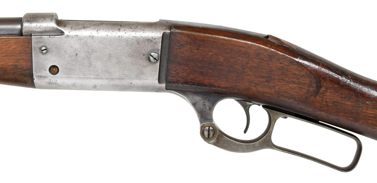 Cal. 303 SAV. S# 7242. Bbl 26". Model 1895 lever action rifle manufactured by Savage. Top of barrel bears Savage's 2 line address. Blued finish with plain wood buttstock and schnabel tip forend. Marble's No. 6 ivory beaded blade front sight with V-notch rear sight. CONDITION: receiver and lever exhibit wear and thinning overall that show through to gray patina and some areas of darker discoloration. Barrel retains large amounts of its original factory blue finish, exhibiting some areas of wear and thinning that show through to brown patina, with a couple scattered spots of light pitting. Bright bore, exhibiting consistent mild pitting in the grooves and retaining strong rifling throughout. Wood furniture shows scattered marks and impressions from storage and handling, with the buttstock exhibiting a gouge on the right and a sizeable repair to the rear of the upper tang. Forend exhibits a small loss on the left side, but otherwise remains sturdy and serviceable. (01-24544/MLW). ANTIQUE. $1,000-1,500.