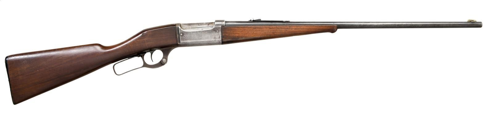 Cal. 303 Savage. S# 77378. Bbl. 26" round. Rocky Mountain blade & buckhorn rear sights. Mfg. 1907 w/ blued finish, 11 1/8" semi Schnabel tip forend, straight grip buttstock & brass round counter left side frame. Cocking indicator atop frame. S# on forend appears to match the frame; but the 5 digits are quite faint. CONDITION: metal surfaces are a gray/blue patina w/ scratches, impact marks, freckling & some scattered pitting. Stock set has an added coat of finish over light marks & some shallow gouges right side wrist. Bore is fair w/ strong rifling but is quite dark & pitted. (23-1282/CW). CURIO. $400-600.