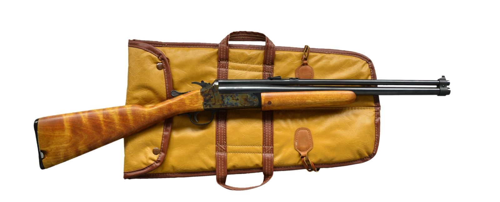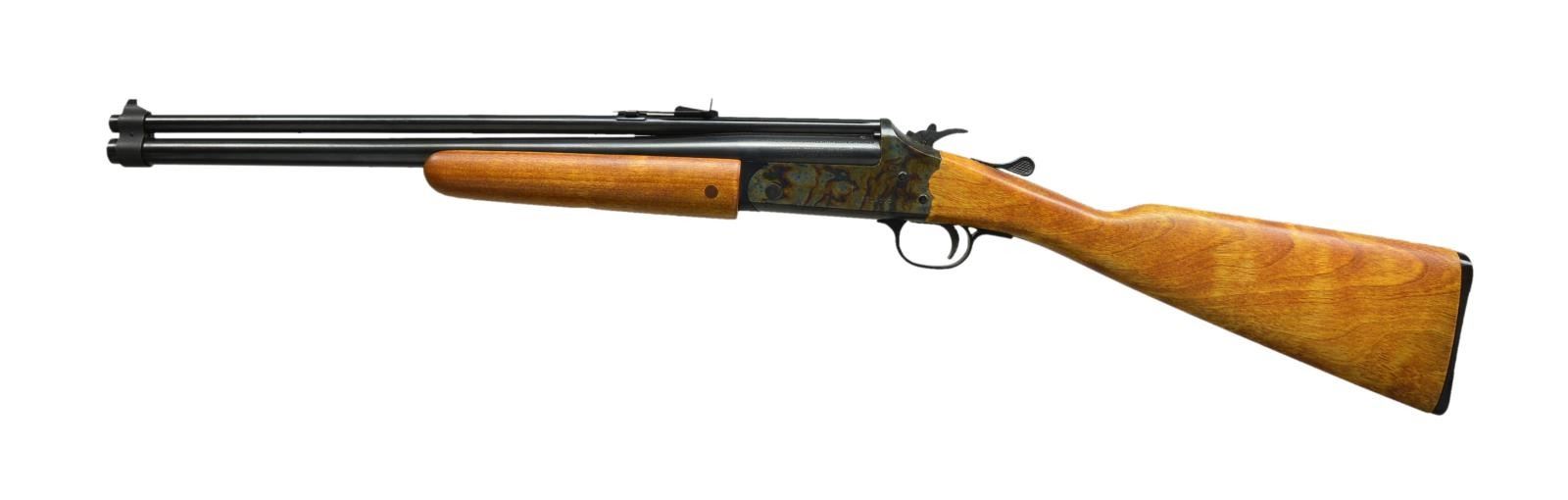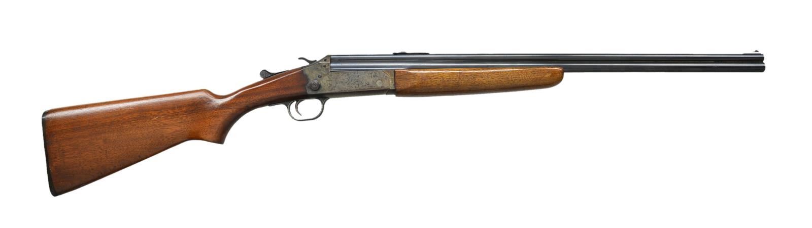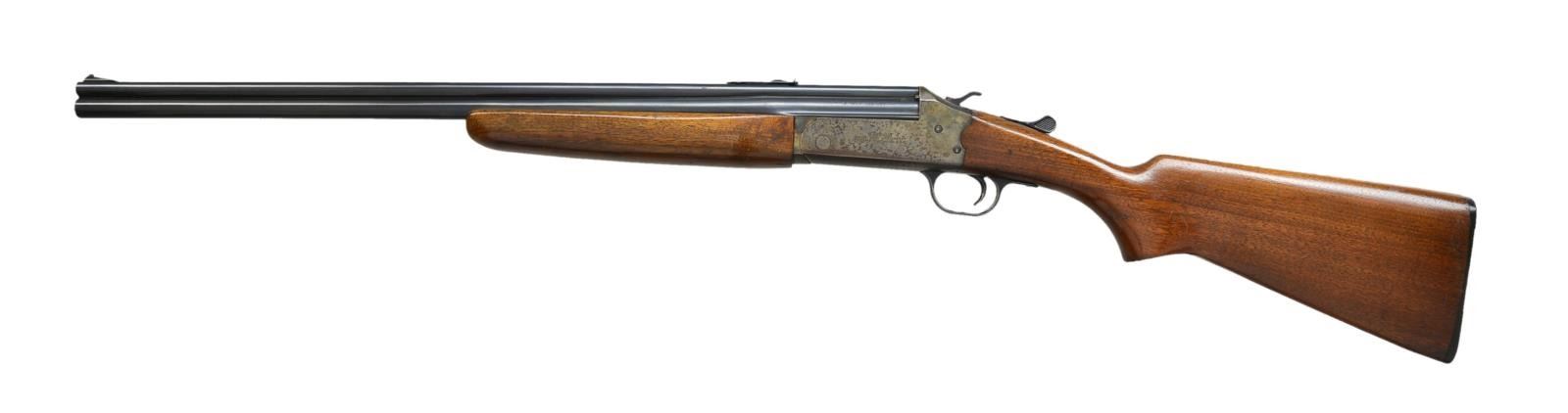 1) MODEL 24C SERIES P CAMPER'S COMPANION. Cal. 22 LR / 20 Ga., 2 3/4". S# B509013. Bbl. 20" w/ separation. Band mounted serrated ramp blade front sight w/ elevator adj. rear sight & groove for tip off scope mts. Case colored action w/ bbl. selector on hammer. Plastic trigger guard. Hardwood forearm & straight grip stock w/ cartridge storage space under aluminum trapdoor in plastic buttplate. Mfg. 1972-1988. UNATTACHED ACCESSORIES: original padded takedown vinyl case. CONDITION: metal retains over 98% blue & case colored finish. Wood has very good refinish. Stock has a hairline crack extending from right side of action. Shotgun bore shows spots of pitting & fouling. Rifle bbl. retains sound rifling. (21-3295/DS). MODERN.