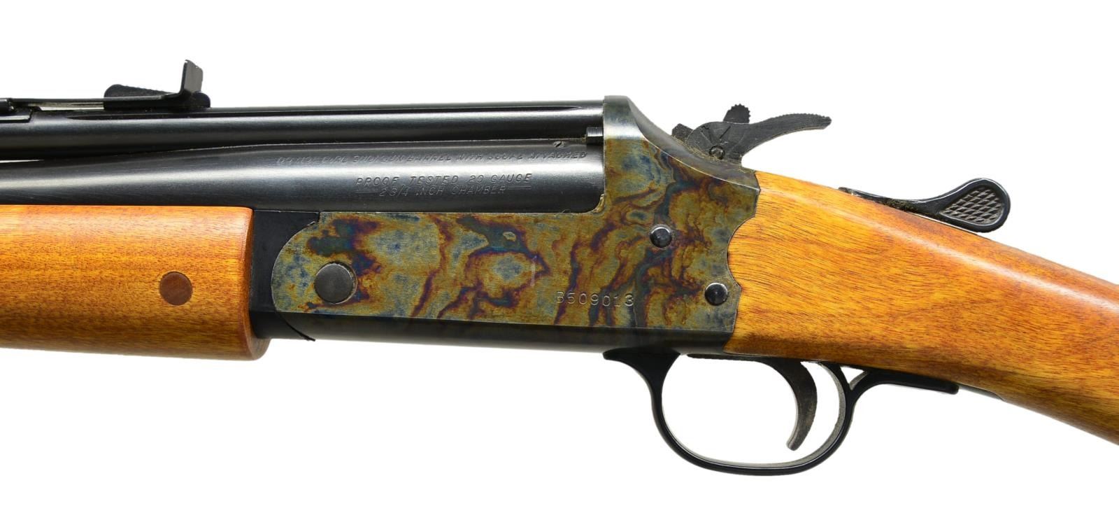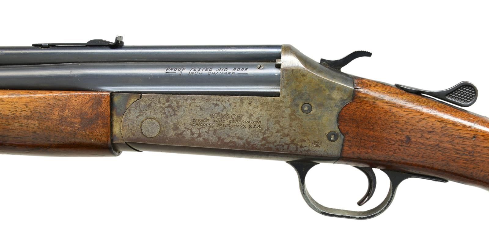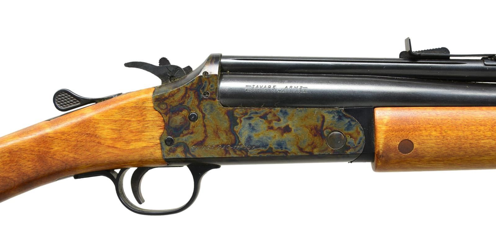 2) MODEL 24. Cal. 22 LR / 410 Ga., 3". NSN. Bbls. 24". w/ full length attachment. Ramp mounted blade front sight. Elevator adj. rear sight. Case colored top lever action w/ selector button on right side. Black anodized alloy trigger guard. Walnut forearm & pistol grip stock w/ original buttplate. CONDITION: bbls. retain 97% blue showing sm. marks. Receiver shows some case colors in protected areas w/ balance fading to a mottled gray brown. Wood has lightly worn finish showing scratches & marks. Stock is cracked through wrist area w/ sm. chips around action. Very good bright bores. (21-3353/DS). CURIO. $800-1,200.