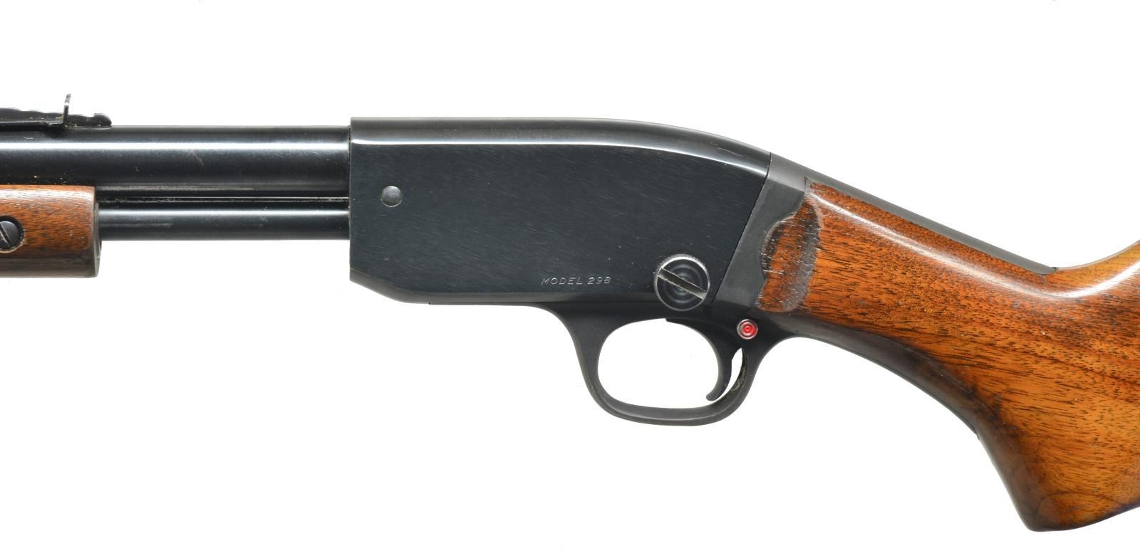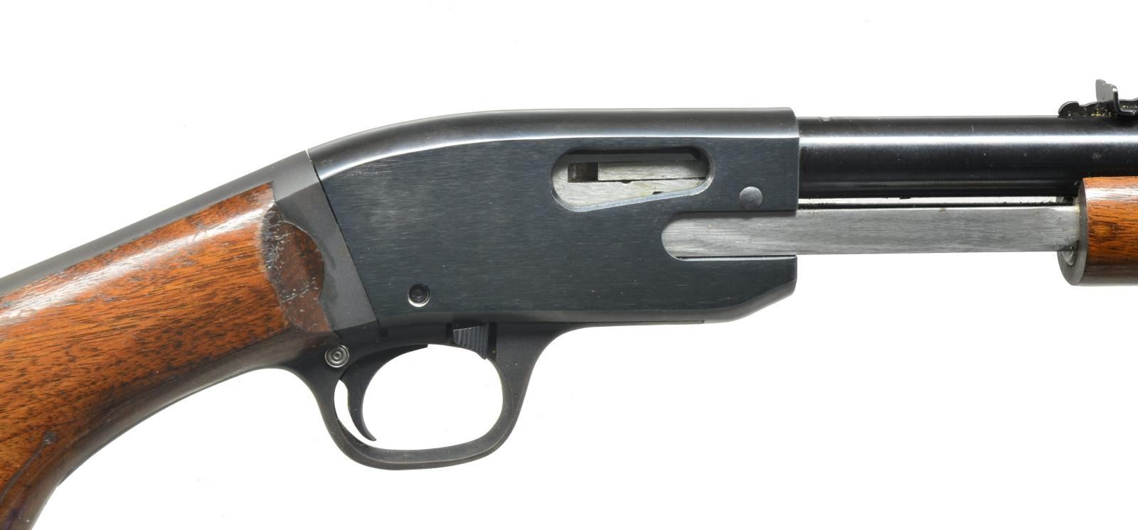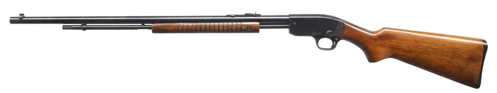 Cal. 22 S, L, LR. NSN. Bbl. 24" rnd. w/ bead front sight & elevator adj. rear sight. Tubular mag. Blue finish. Flat bottom grooved forearm & pistol grip walnut stock w/ grooved hard rubber buttplate. CONDITION: over 95% blue. Wood shows a few scratches & marks. Bright near excellent bore. (20-3388/DS). CURIO. $300-500.