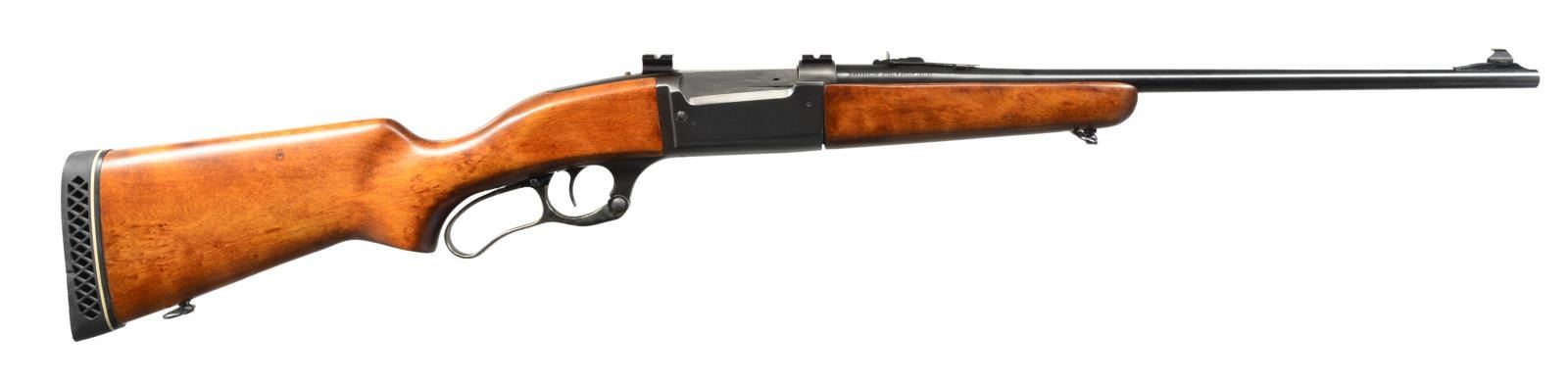 Cal. 308 Win. S# 1049771. Bbl. 20" w/ ramp mounted bead front sight & U notch sporting rear sight. Action is equipped w/ Weaver scope bases. Features include steel rotary mag., case colored lever, cocking indicator & bent tab safety. Hardwood forearm & pistol grip stock w/ sling swivels. LOP: 13 5/8" over aftermarket White Line recoil pad. 98% Blue & case colored metal finish. Sanded & refinished stocks. Forearm has poor fit at receiver. Bright near excellent bore. (20-2879/DS). MODERN. $300-500.
