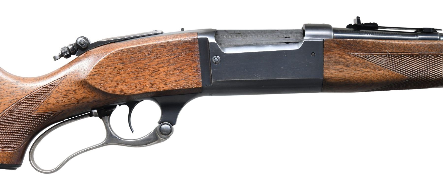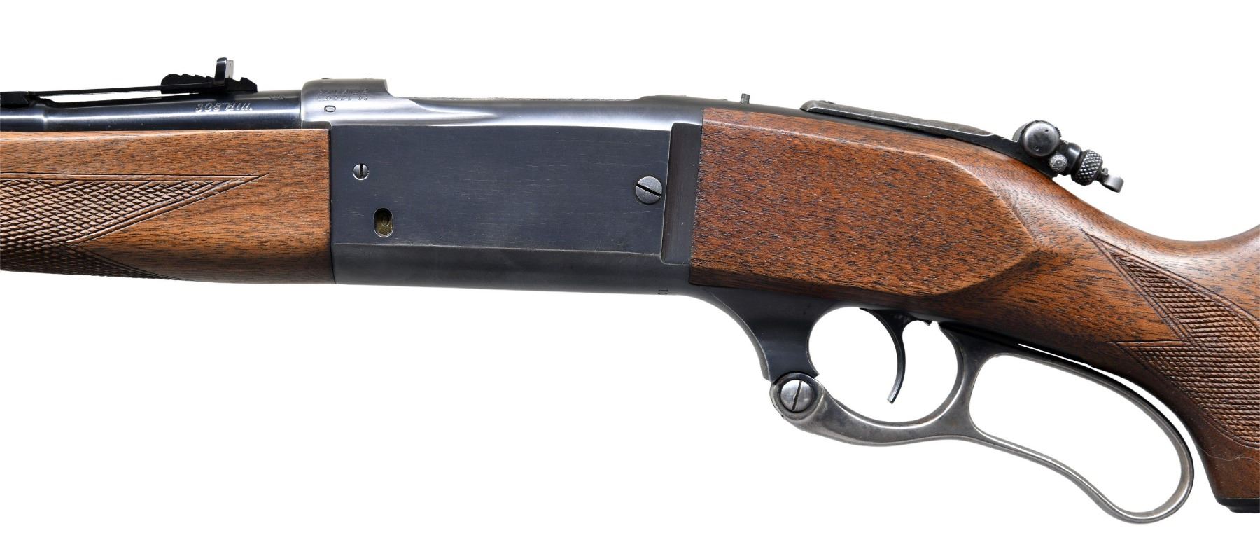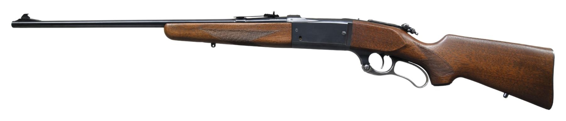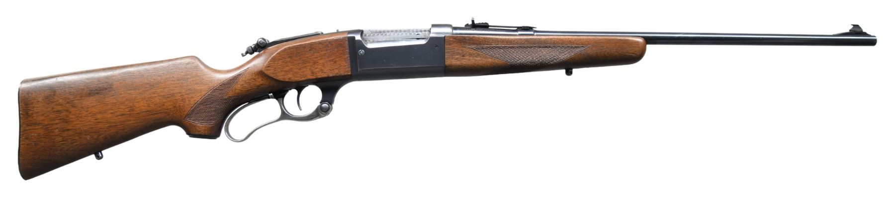 RIFLE. Cal. 308 Win. S# 913101. Bbl. 22". Model 99-F Featherweight lever action rifle mfg. by Savage between 1957-1960. Left side of the receiver is marked "SAVAGE/ MODEL 99", indicating factory drilling and tapping. Receiver and bbl. exhibit a blue finish, with the lever exhibiting a case color hardened finish, and the bolt being jeweled in-the-white. Checkered wood pistol grip buttstock and blunt tip forearm with checkered hard rubber grip cap and grooved steel buttplate. Ramp mounted blackened brass blade front sight with V-notch rear sight and tang mounted Lyman aperture rear sight. CONDITION: metal components retain the majority of their original factory blue finish, exhibiting some spots/areas of light to mild wear and thinning, with mild edge wear present on the receiver. Lever retains traces of its original case colored finish, appearing to have been cleaned and polished at one time and showing scattered handling marks. Bright bore, showing some light pitting, while retaining strong rifling throughout. Wood furniture retains well defined checkering, showing some scattered marks and impressions overall. (25-4017/MLW). CURIO. $600-900.