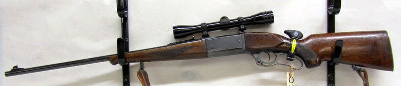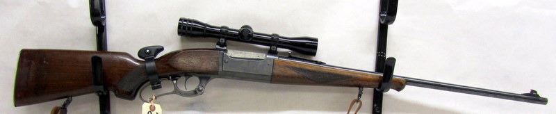 NON-RESTRICTED, LEVER-ACTION, 300 SAVAGE, 24" BARREL, SN 614106. STOCK HAS WOODEN EXTENSION, HANDLING MARKS AND DENTS, SMALL CRACK BEHIND RECEIVER. BLUEING IS WORN ON RECEIVER AND AT MUZZLE, A FEW SCRATCHES ON BARREL. BORE IS EXCELLENT CONDITION EXCEPT FOR A DARK PATCH NEAR THE MUZZLE. COMES WITH REDFIELD FIXED 4X SCOPE AND MILLETT RINGS.