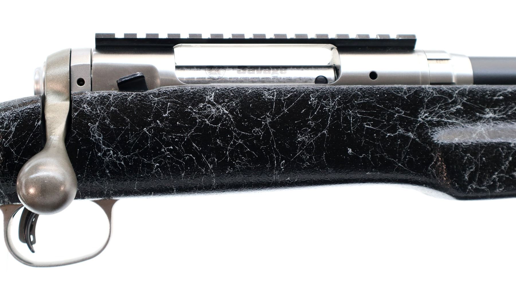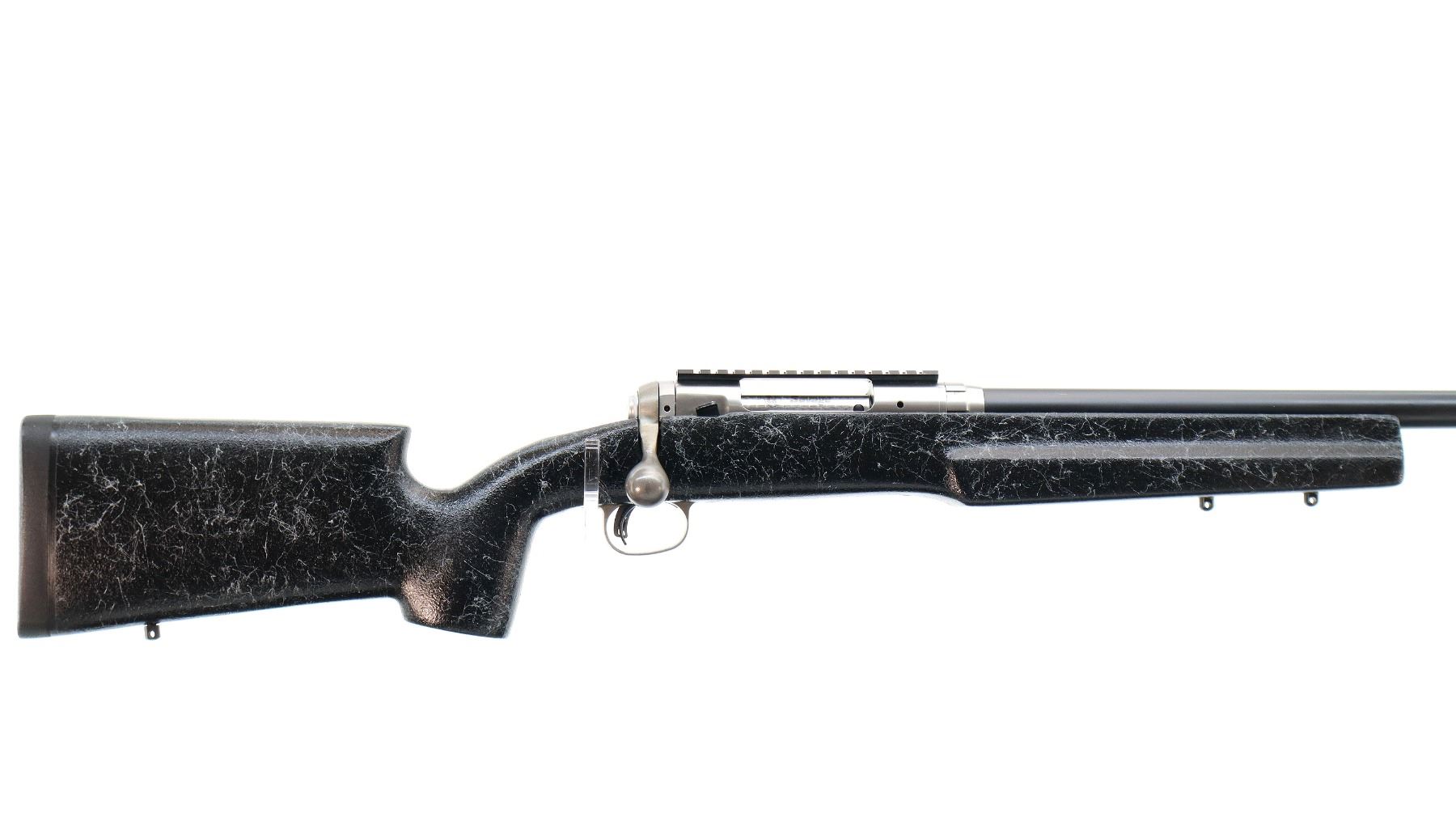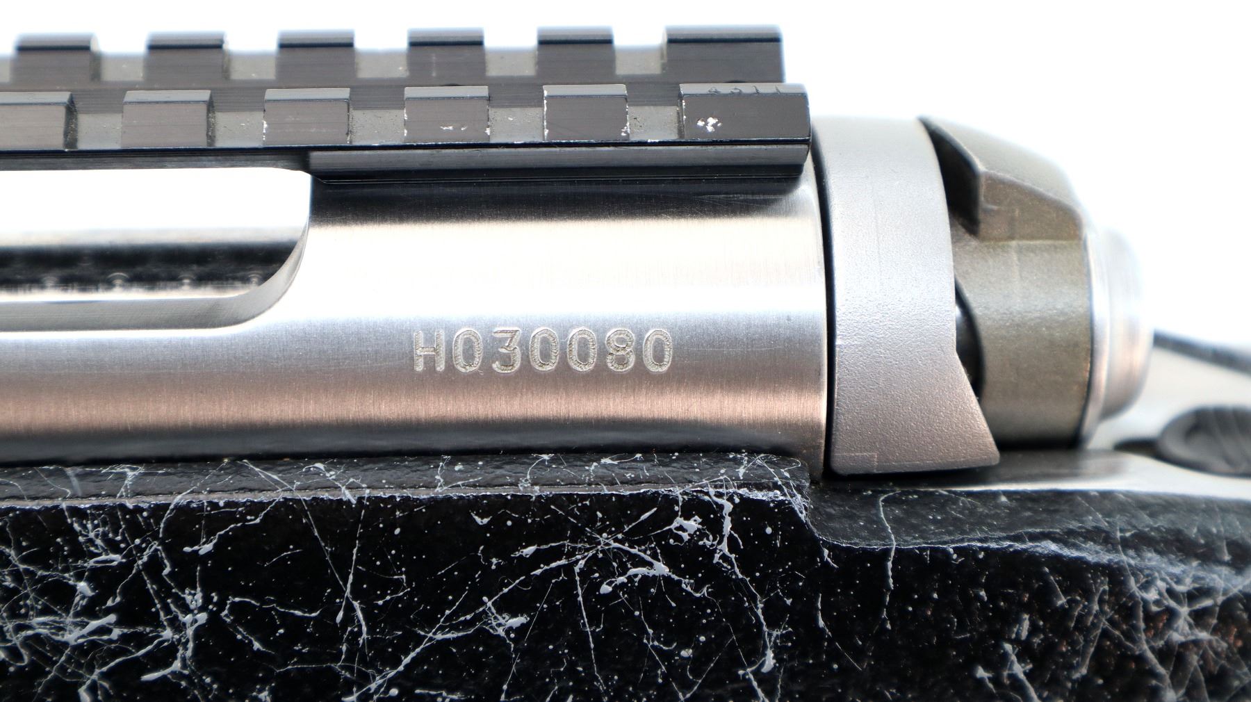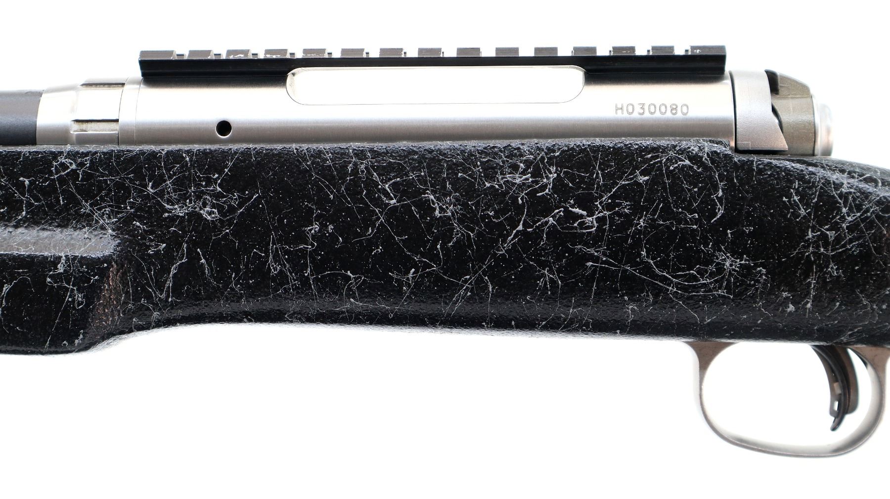 Main Description: No sights, Parkerized heavy barrel, stainless receiver drilled and tapped with one piece scope rail installed, jeweled bolt with smooth large target knob, tang safety. One piece black/grey spiderweb fiberglass stock, finger grooved wide flat bottomed forearm, thumb rest pistol grip, stock finish chipped on front end of comb, black rubber recoil pad, accu trigger, blind magazine, three swivel studs.