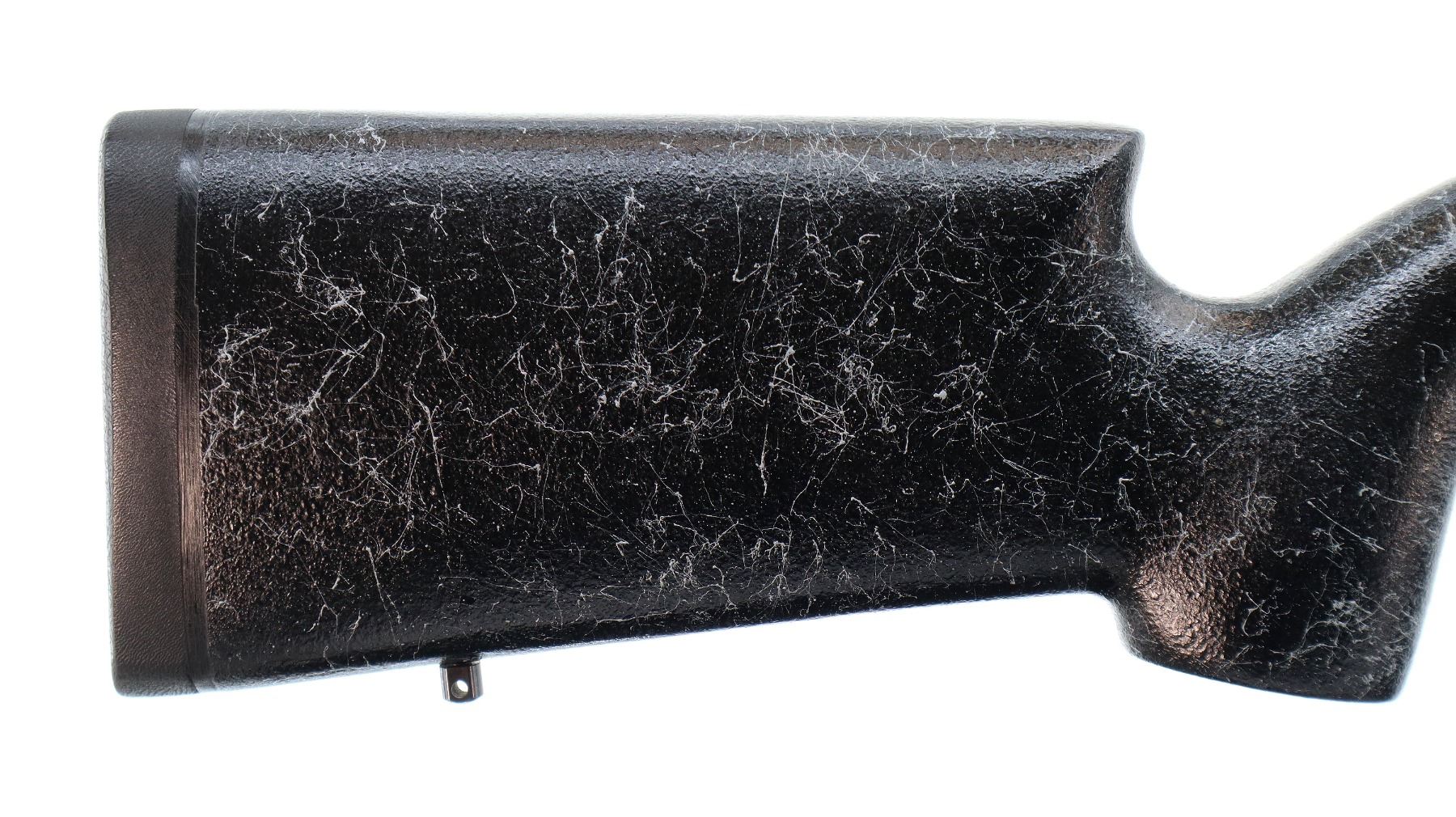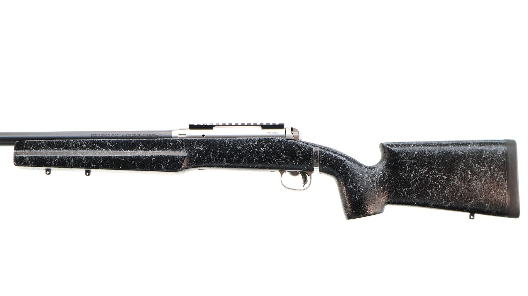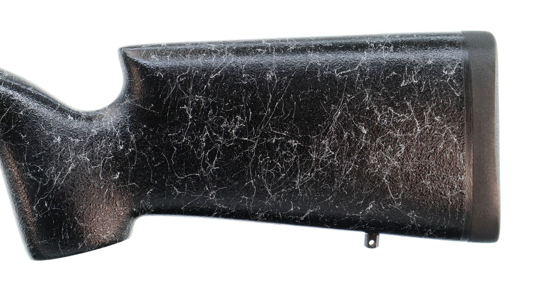 Main Description: No sights, Parkerized heavy barrel, stainless receiver drilled and tapped with one piece scope rail installed, jeweled bolt with smooth large target knob, tang safety. One piece black/grey spiderweb fiberglass stock, finger grooved wide flat bottomed forearm, thumb rest pistol grip, stock finish chipped on front end of comb, black rubber recoil pad, accu trigger, blind magazine, three swivel studs.