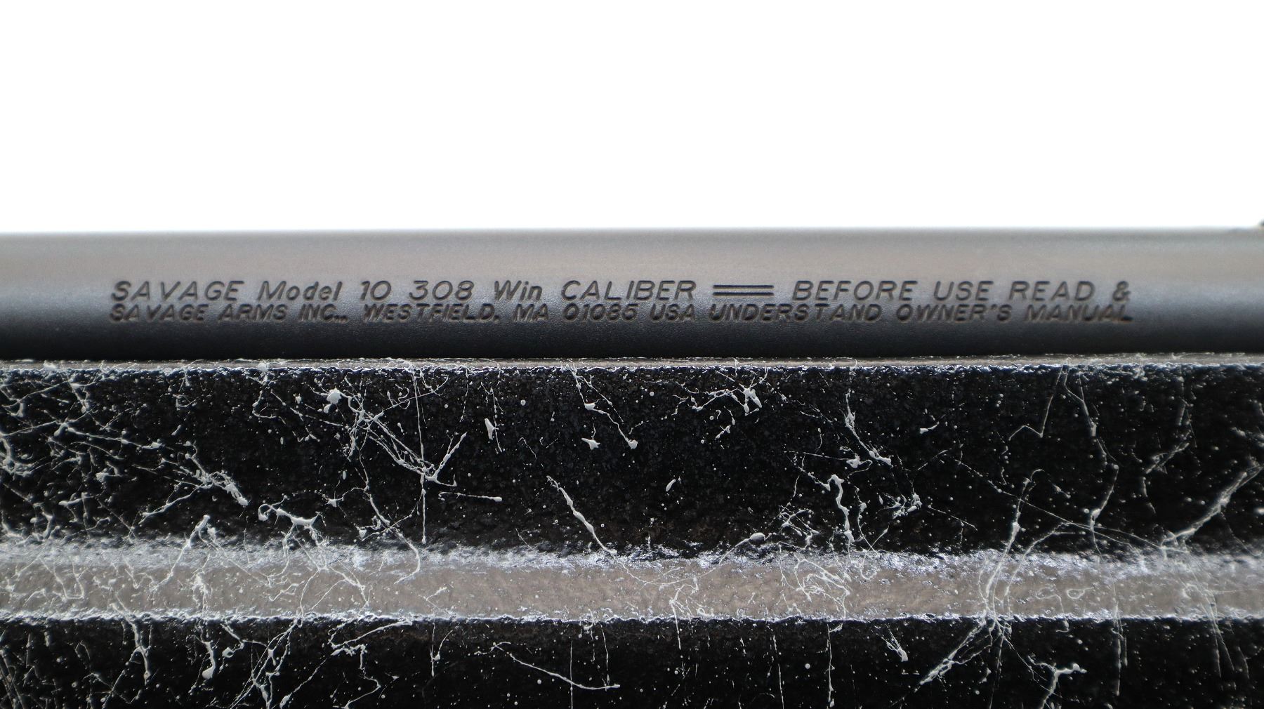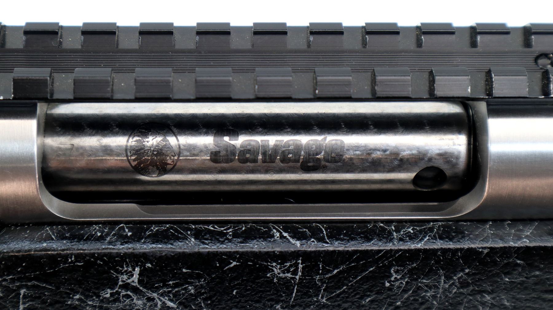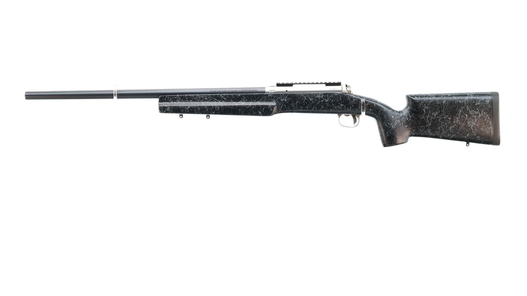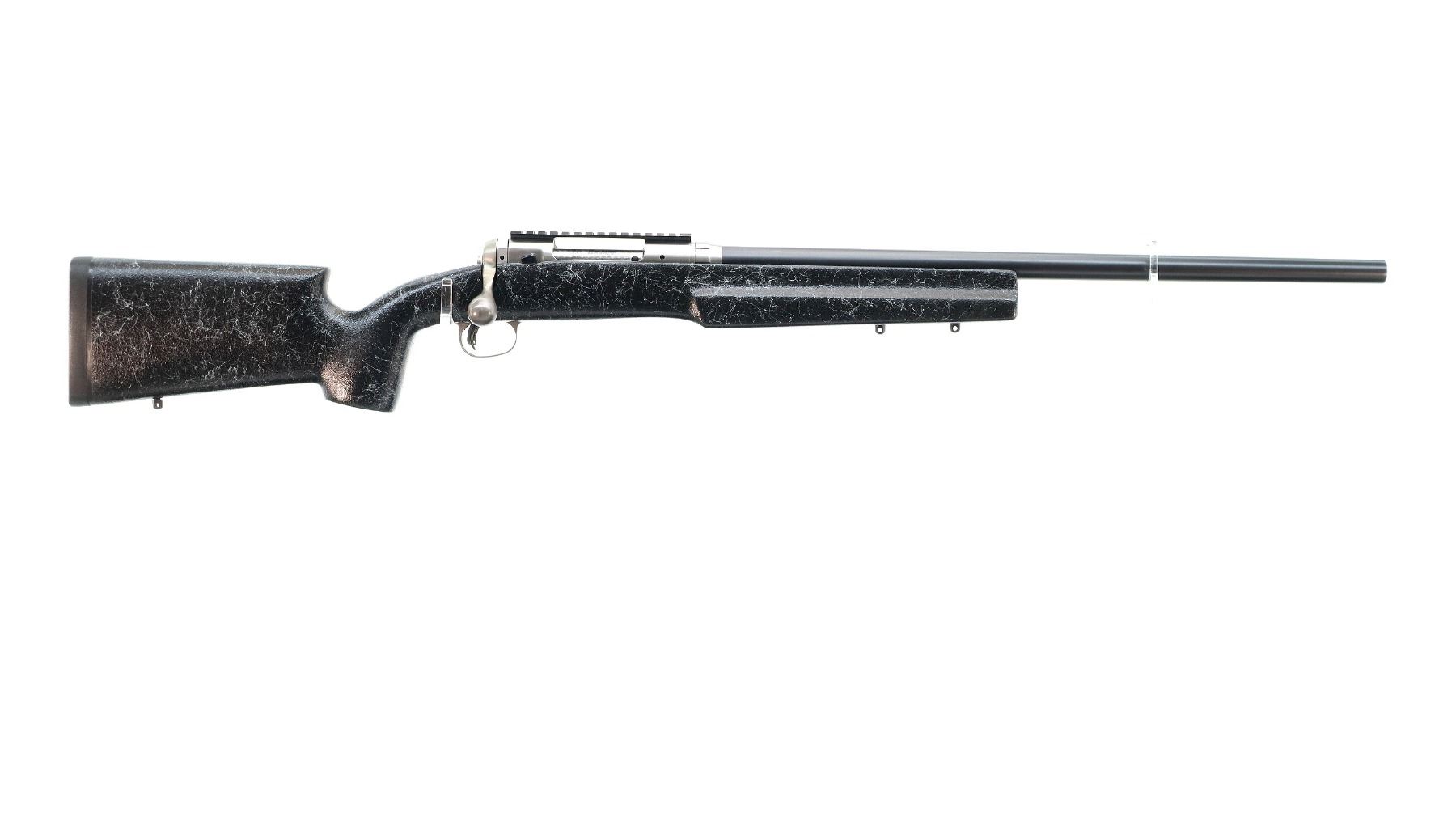 Main Description: No sights, Parkerized heavy barrel, stainless receiver drilled and tapped with one piece scope rail installed, jeweled bolt with smooth large target knob, tang safety. One piece black/grey spiderweb fiberglass stock, finger grooved wide flat bottomed forearm, thumb rest pistol grip, stock finish chipped on front end of comb, black rubber recoil pad, accu trigger, blind magazine, three swivel studs.