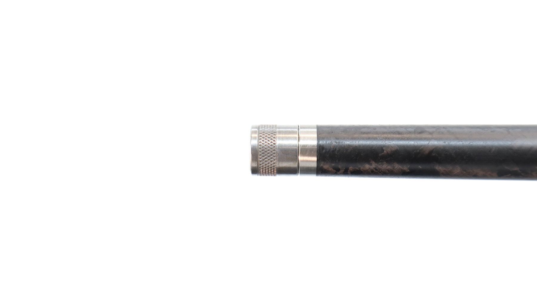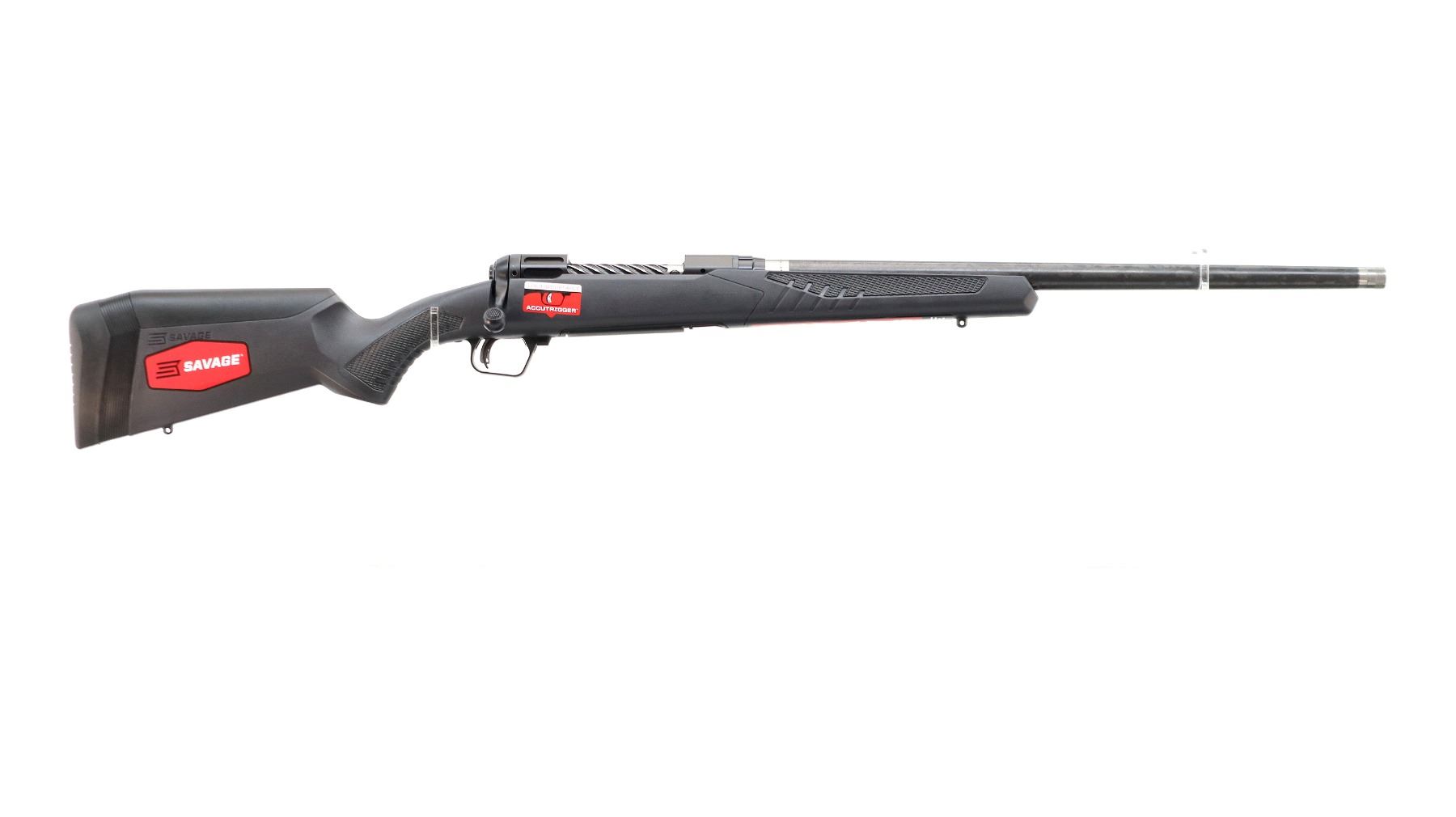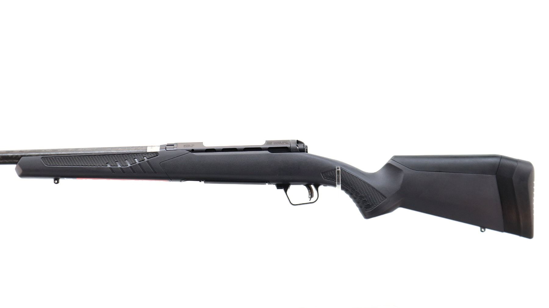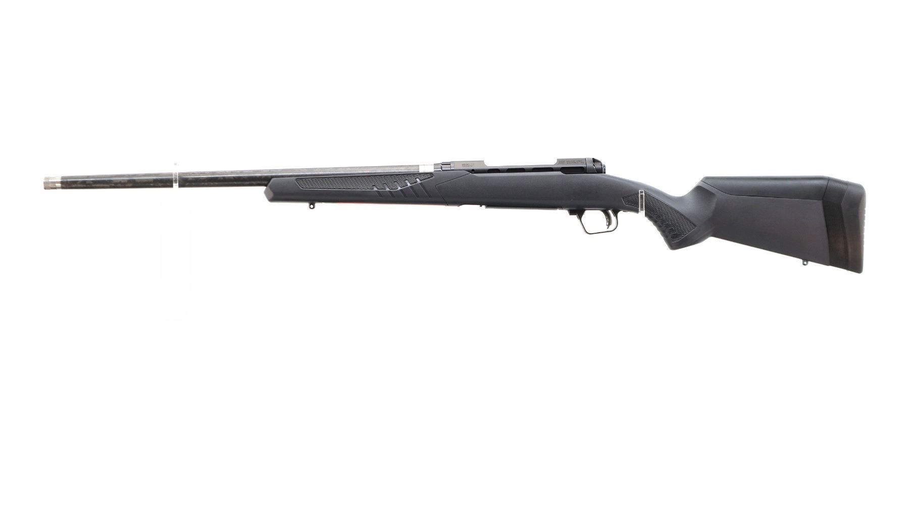 Main Description: No sights, stainless Carbon Fiber wrap barrel threaded at muzzle with cap, Melonite finish lightened receiver drilled and tapped with no plug screws installed, fluted bolt, checkered knob, tang safety. One piece black synthetic stock, checkered forearm and pistol grip panels, black rubber recoil pad, grip cap, accu trigger, swivel studs, retains factory stickers. Accessories include: four replaceable combs with different heights, three different thickness recoil pad spacers.