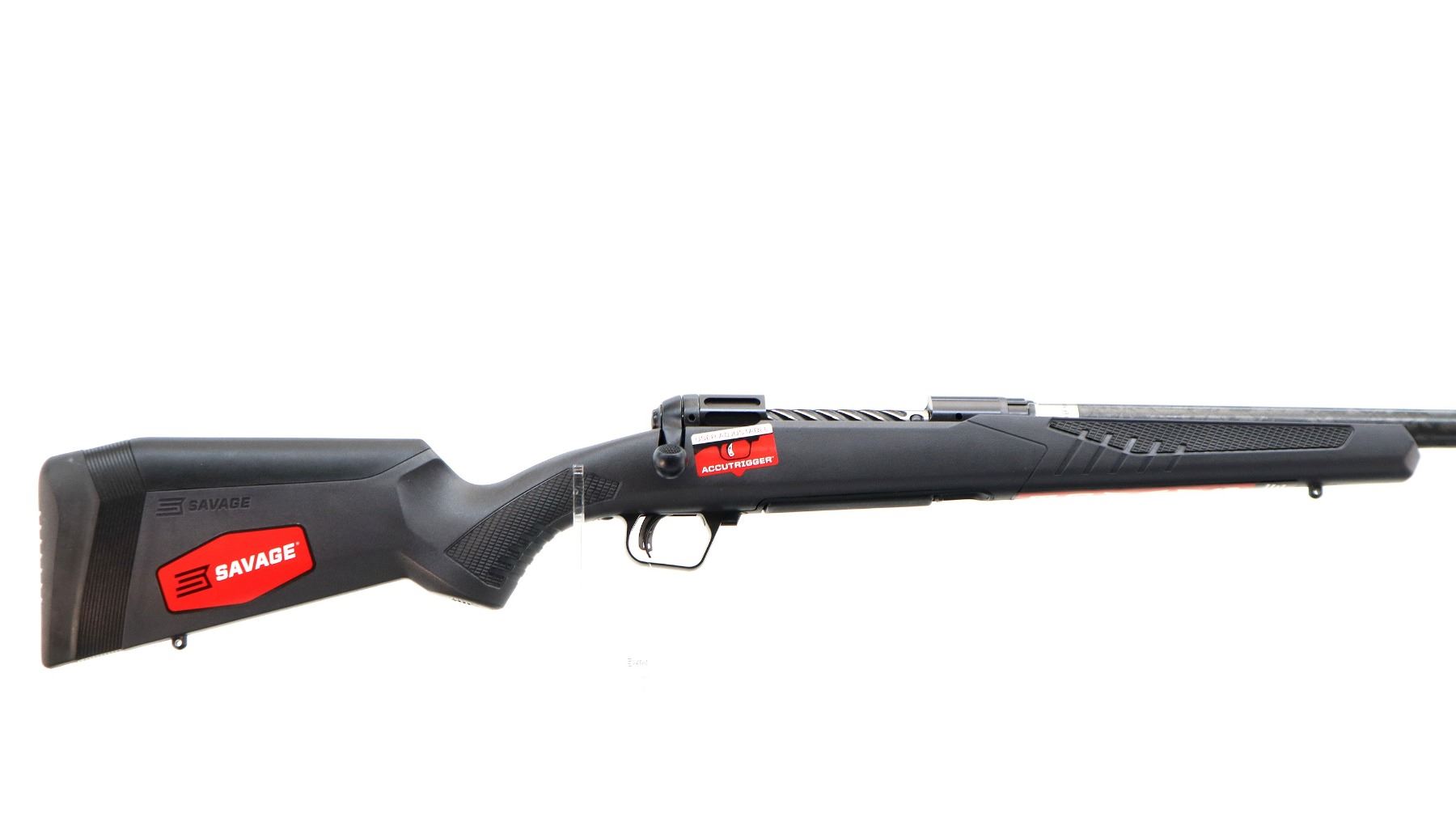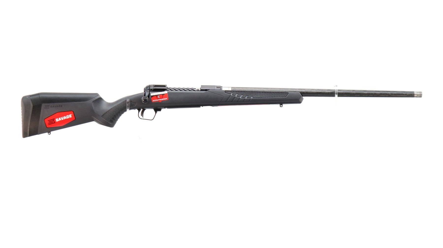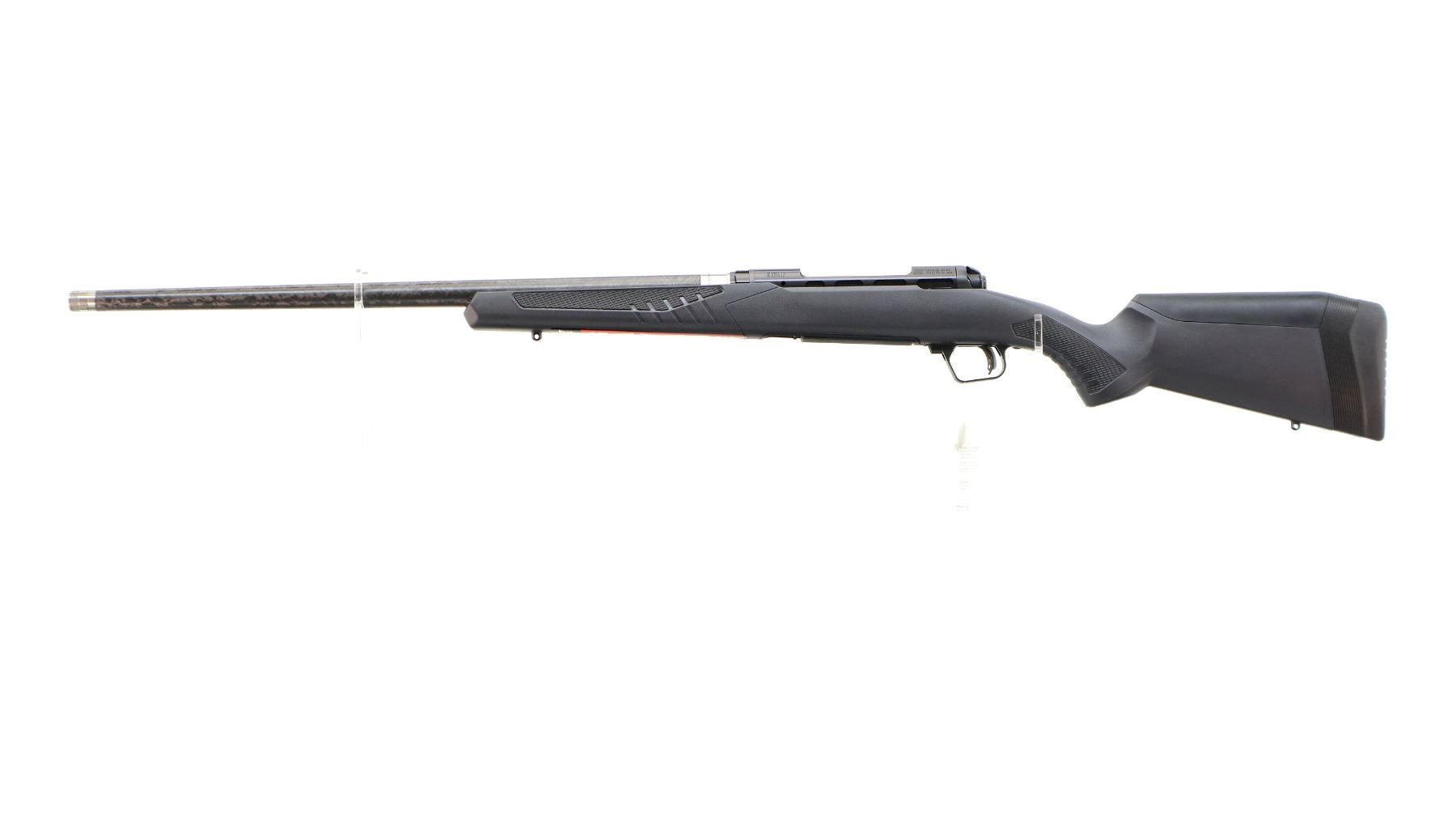 Main Description: No sights, stainless Carbon Fiber wrap barrel threaded at muzzle with cap, Melonite finish lightened receiver drilled and tapped with no plug screws installed, fluted bolt, checkered knob, tang safety. One piece black synthetic stock, checkered forearm and pistol grip panels, black rubber recoil pad, grip cap, accu trigger, swivel studs, retains factory stickers and hang tag. Accessories include: four replaceable combs with different heights, three different thickness recoil pad spacers.