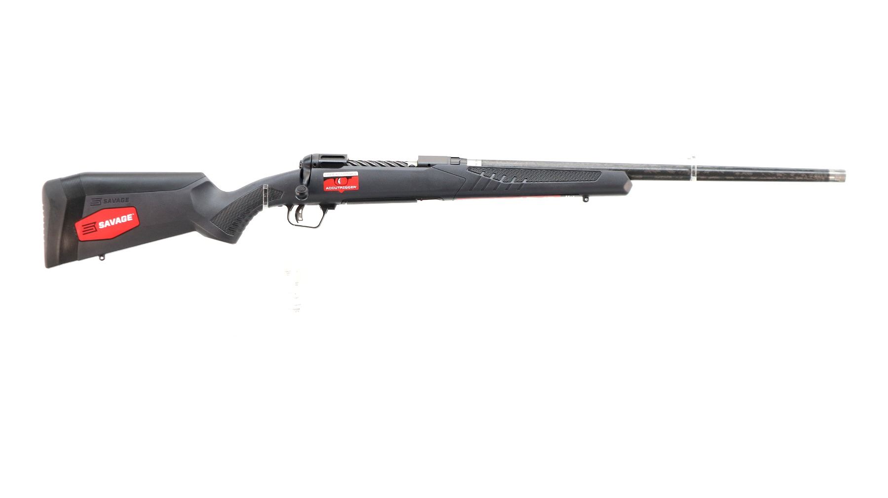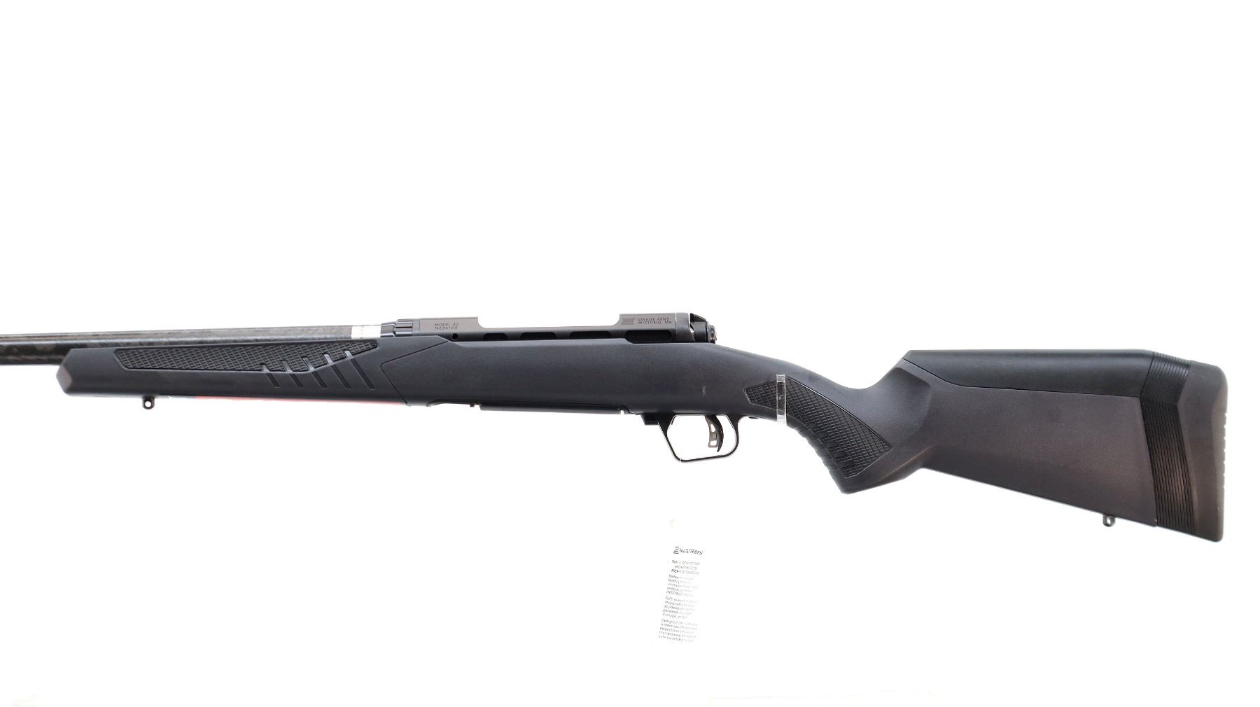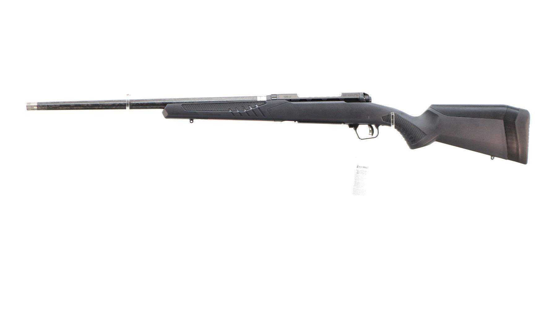 Main Description: No sights, stainless Carbon Fiber wrap barrel threaded at muzzle with cap, Melonite finish lightened receiver drilled and tapped with no plug screws installed, fluted bolt, checkered knob, tang safety. One piece black synthetic stock, checkered forearm and pistol grip panels, black rubber recoil pad, grip cap, accu trigger, swivel studs, retains factory stickers and hang tag. Accessories include: four replaceable combs with different heights, three different thickness recoil pad spacers.