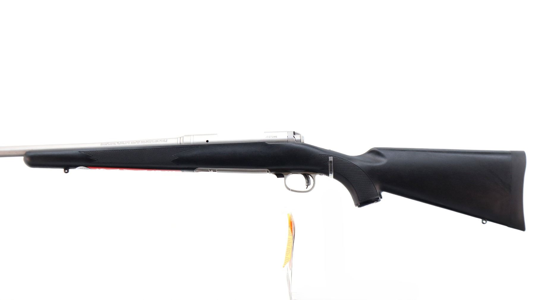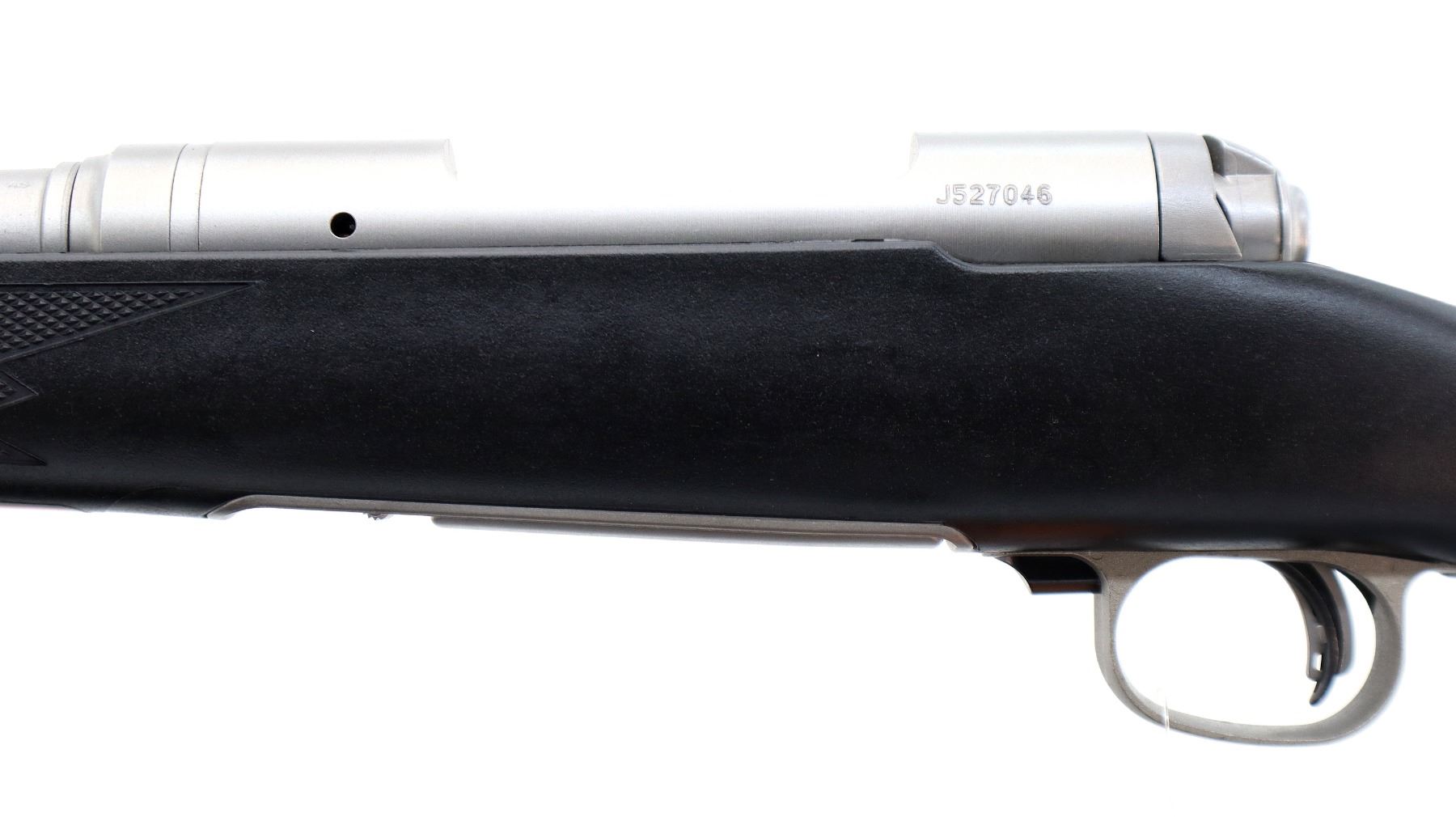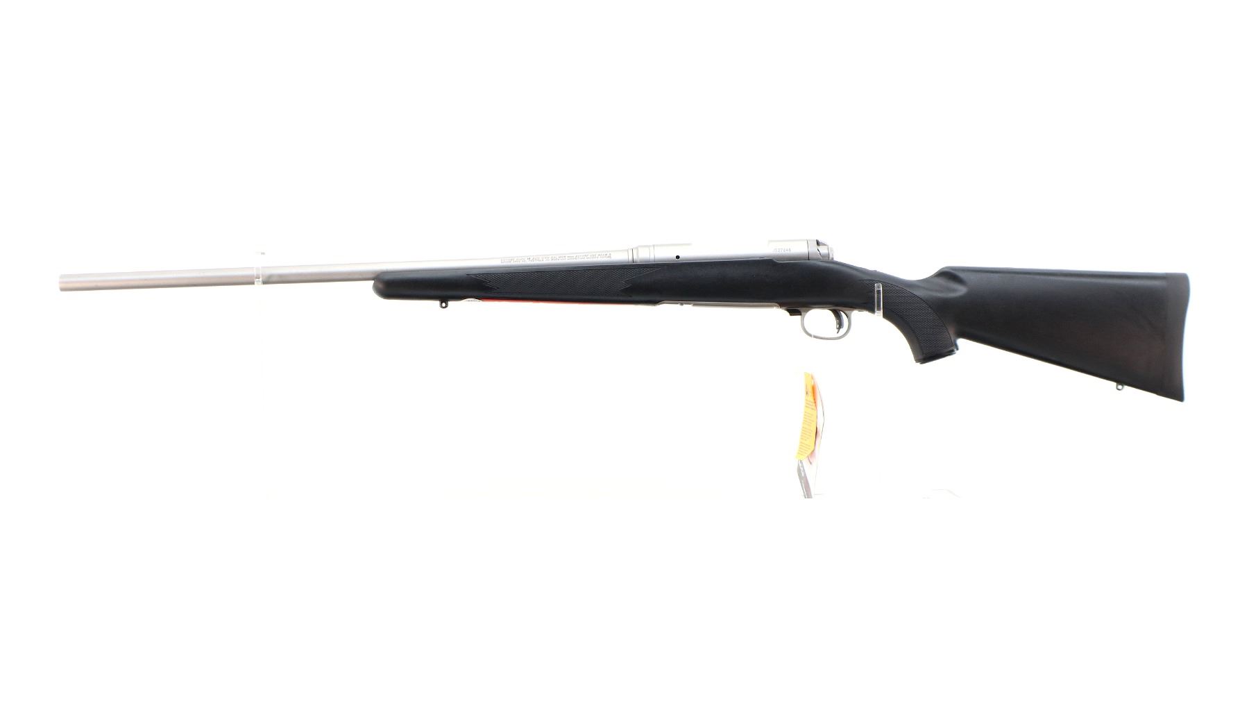 Main Description: No sights, stainless finish, receiver drilled and tapped with no plug screws installed, jeweled bolt with checkered knob, tang safety. One piece black synthetic stock, checkered forearm and pistol grip, black rubber recoil pad, grip cap, accu trigger, swivel studs, retains factory stickers and hang tag.