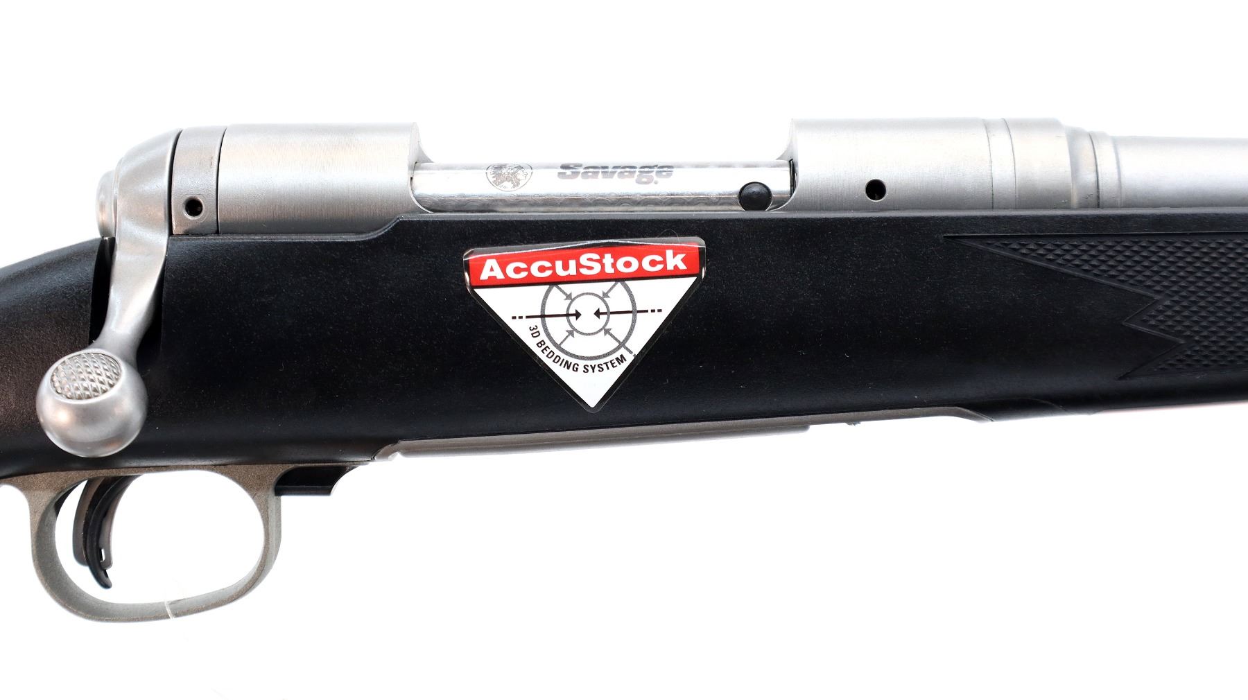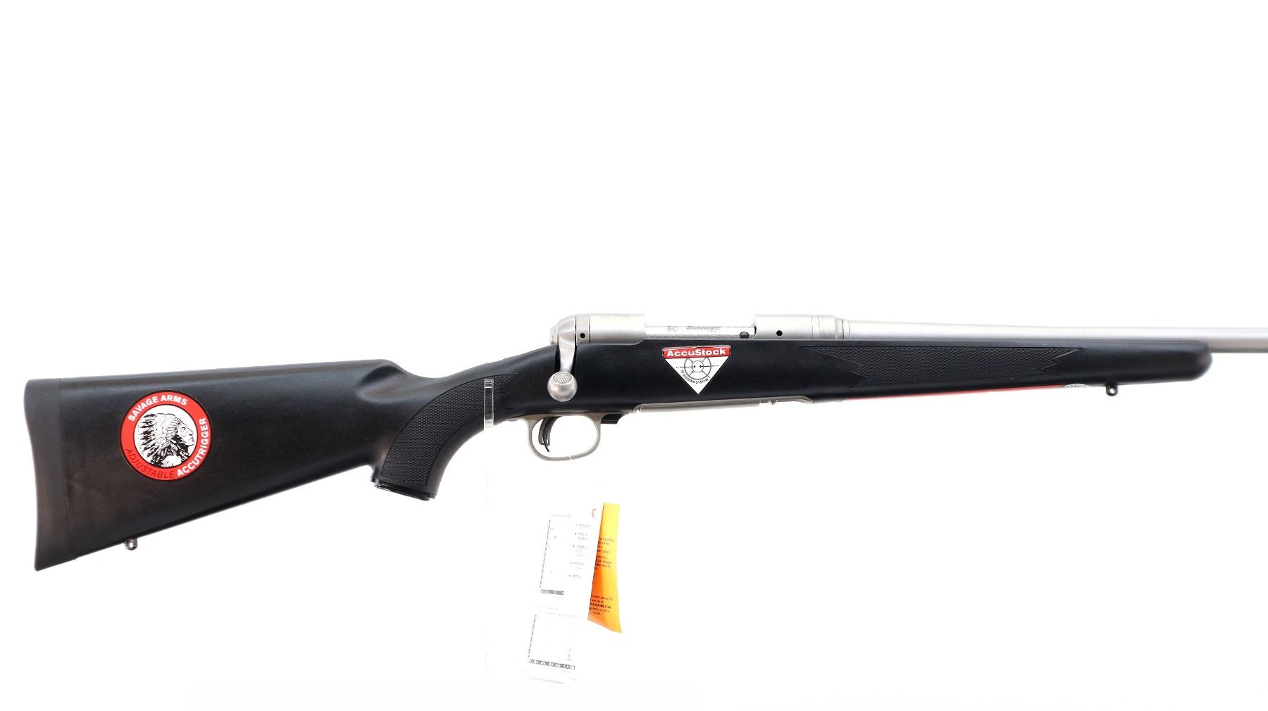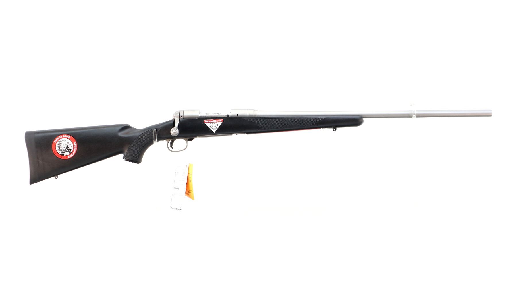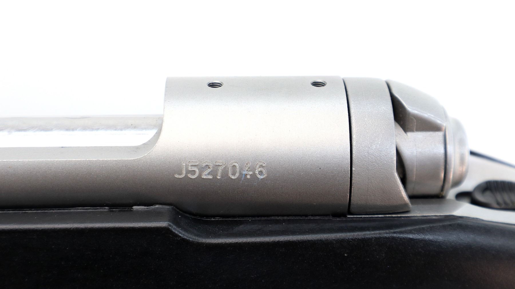 Main Description: No sights, stainless finish, receiver drilled and tapped with no plug screws installed, jeweled bolt with checkered knob, tang safety. One piece black synthetic stock, checkered forearm and pistol grip, black rubber recoil pad, grip cap, accu trigger, swivel studs, retains factory stickers and hang tag.
