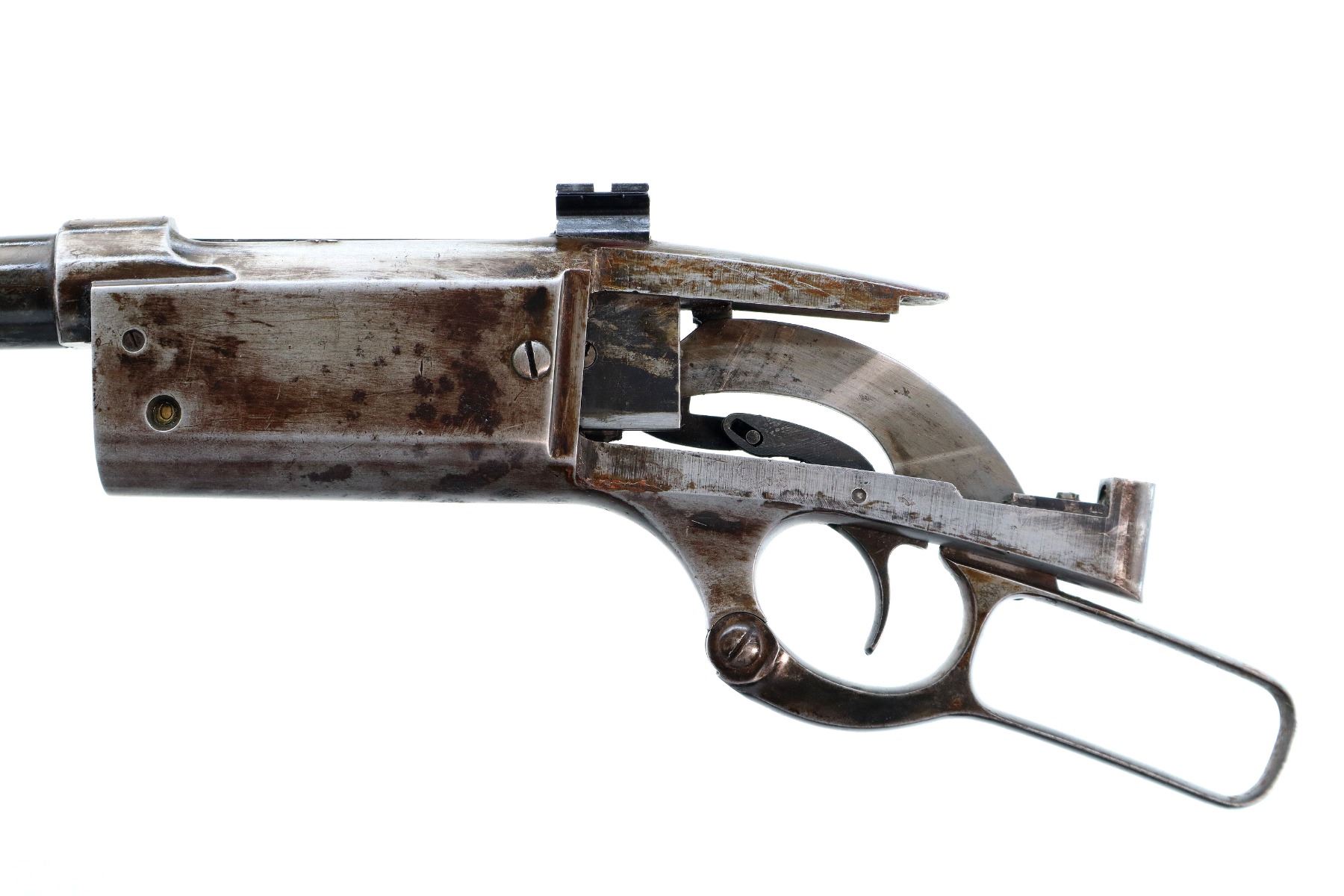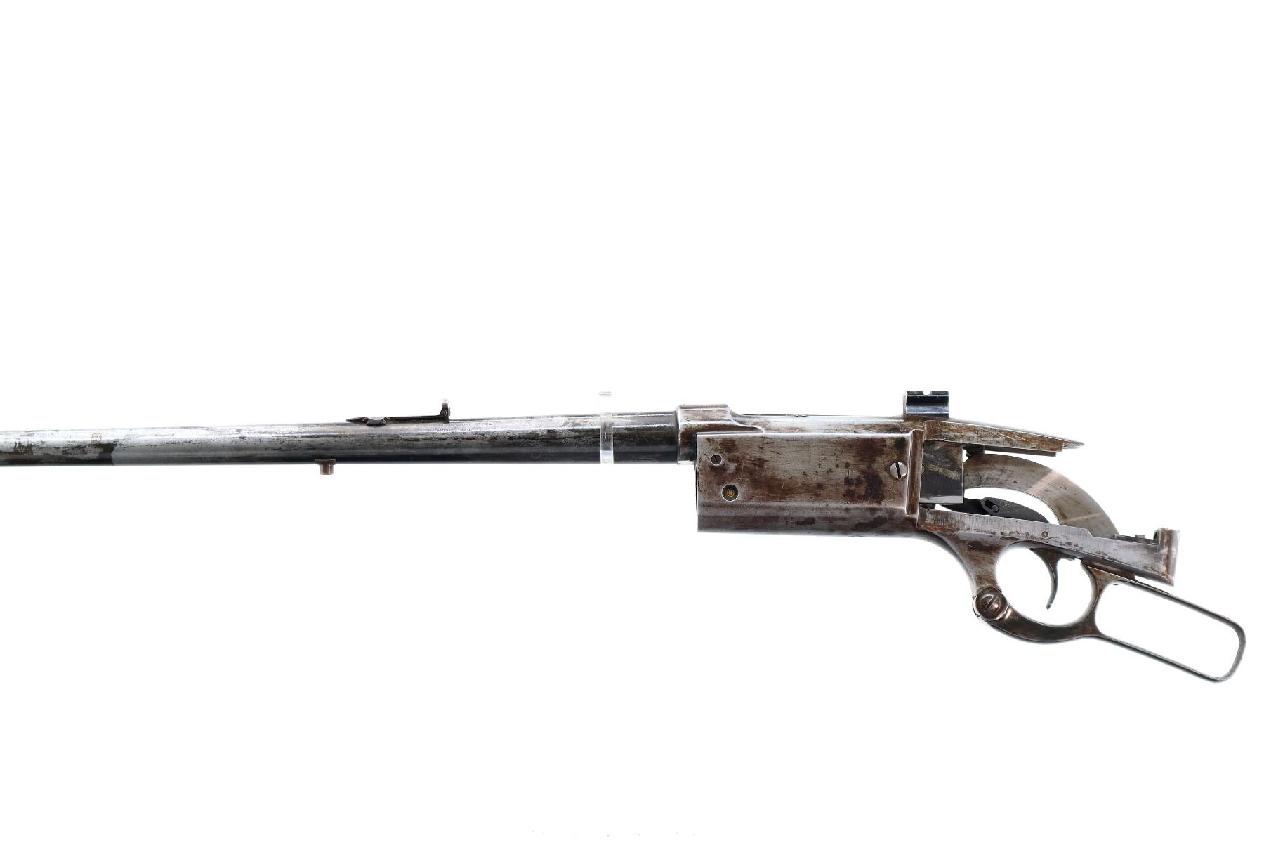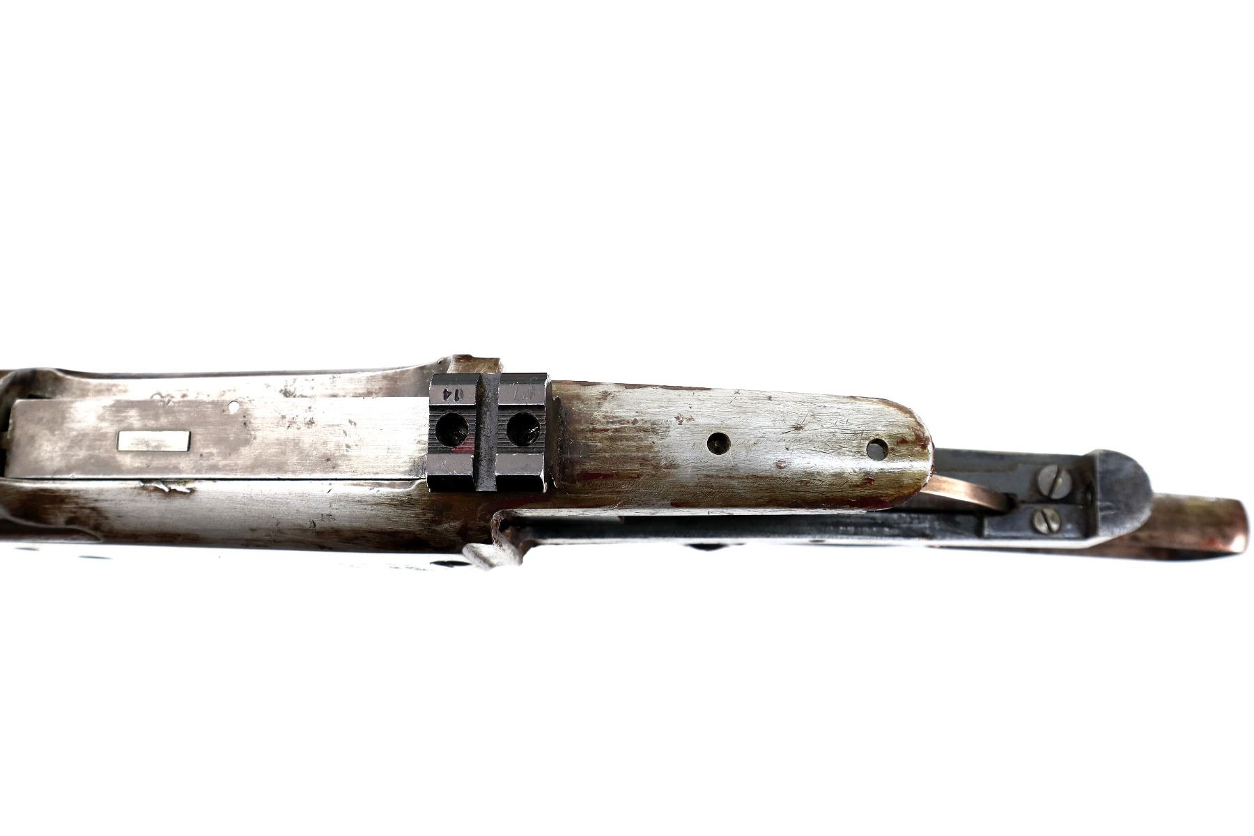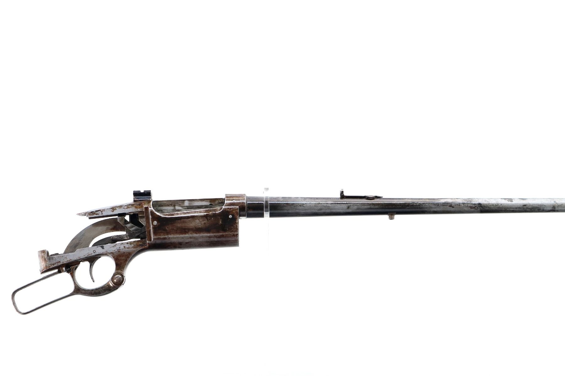 Main Description: Blade front sight, adjustable folding u notched rear sight, receiver drilled and tapped with a rear base only installed, square cocking indicator, includes bolt, lever, trigger parts, smooth curved steel butt plate, and two piece wood stocks, forearm is chipped and cracked, straight grip chipped and cracked behind receiver, stock cracked at toe, missing swivel holes is present. Does not include some small screws and possibly other parts.